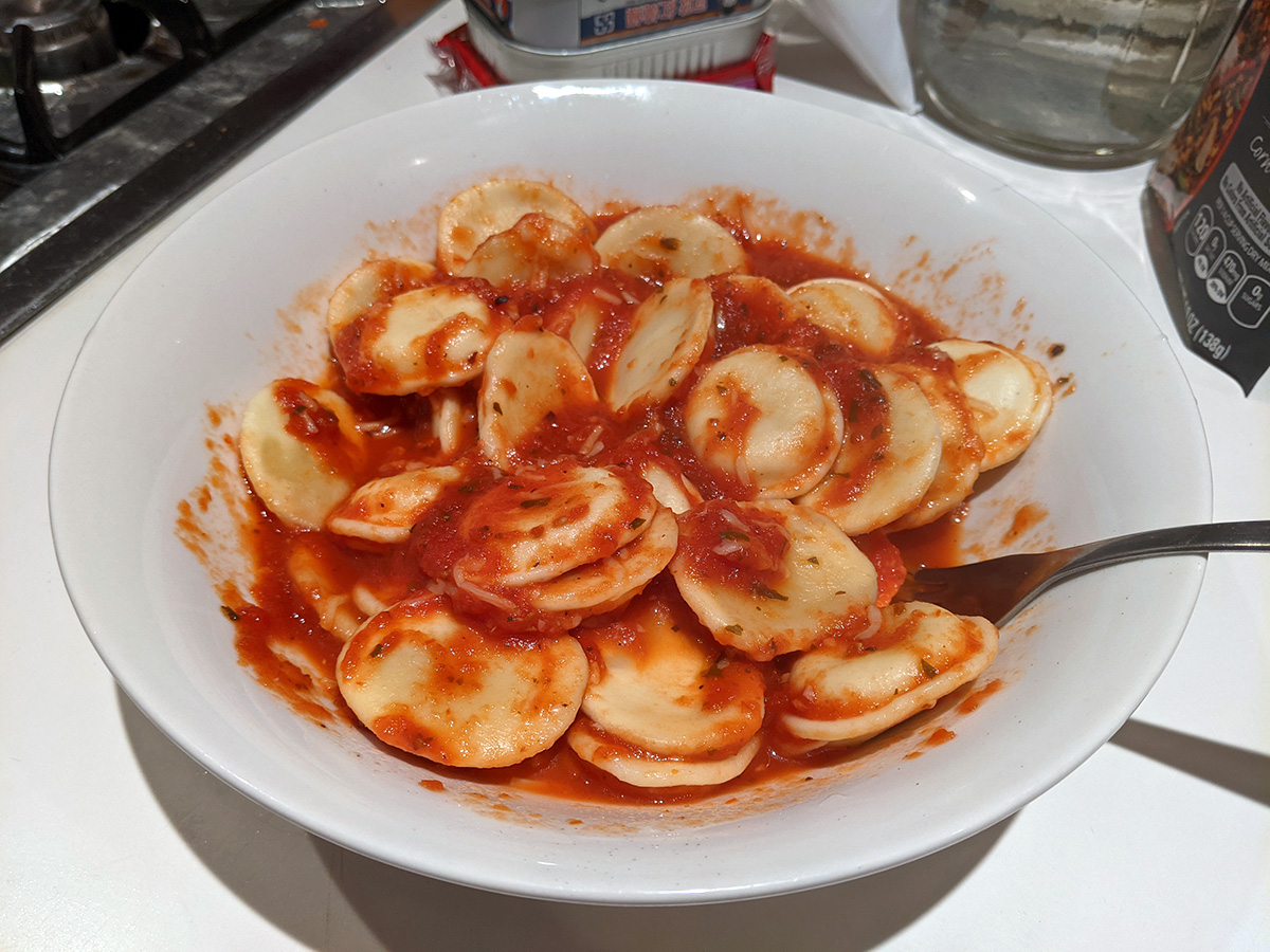 for dinner i boiled some frozen cheese raviolis and heated up half a jar of pasta sauce. i was hoping to catch the red sox game, which of as yesterday was still on for tonight, but i discovered they finally came to their senses and postponed it until tomorrow afternoon. in hindsight they didn't need to do that, because tonight's weather in boston was perfectly suitable for baseball, just a bit windy.