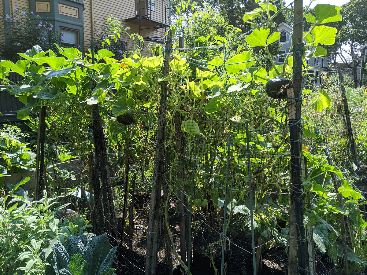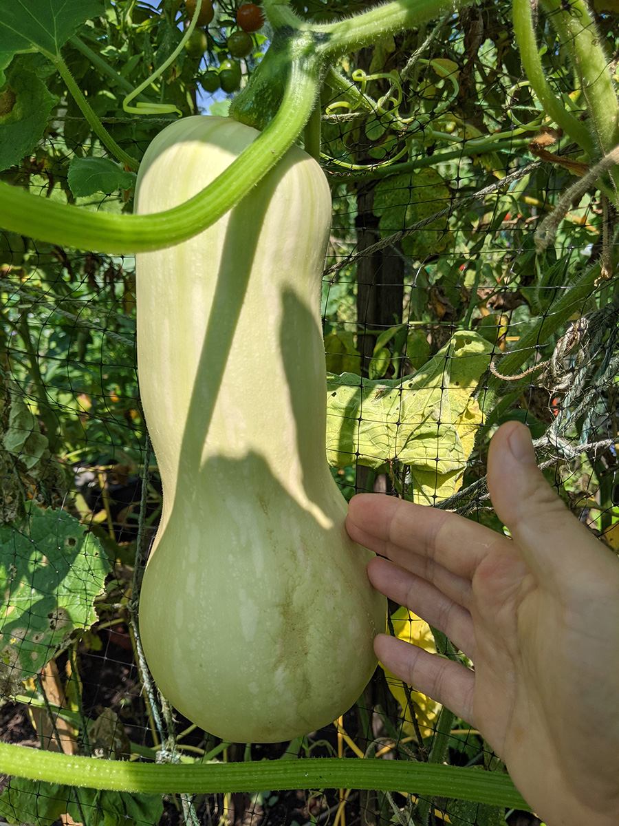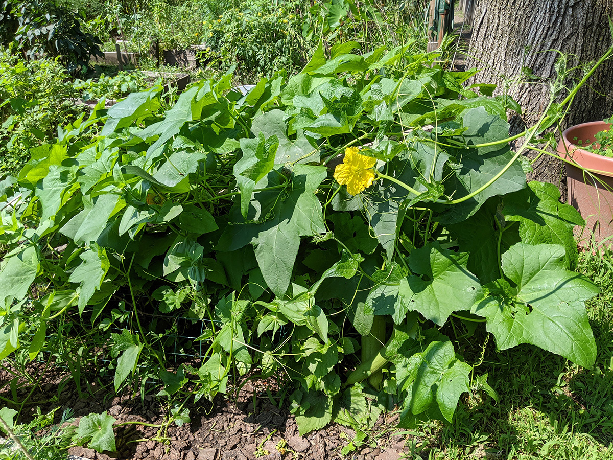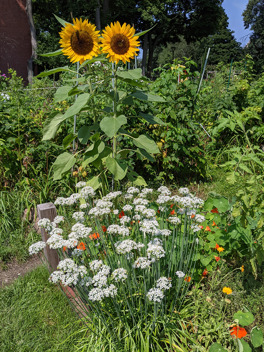 after watering, i went around the rest of the garden, admiring the other plots. all of dave's cucumbers are dead, but he does have a large buttercup squash growing and 2 kabocha. lynn has an amazing collection of garlic chives, the tallest in the garden, since her plot gets full sun all day, no shadows. she also has a few sunflowers, which i never even noticed. one of the gardeners in the back was growing some squash but the trellis toppled; they look like luffas. renee asked me to water her plot over labor day weekend; i took a look at her garden, mostly weeds, hard to make out any real plants. but if she wants me to water her weeds, i can do that.