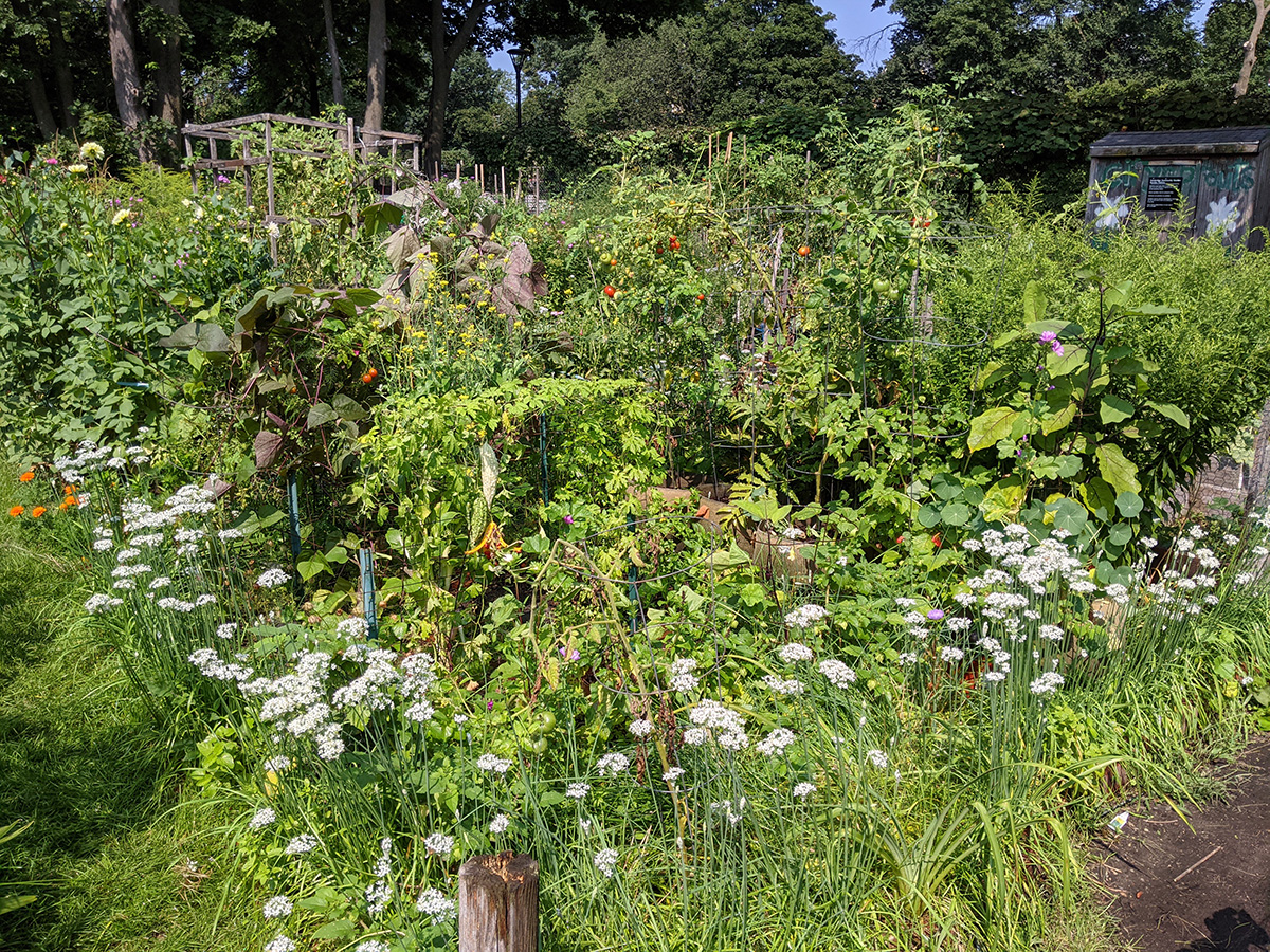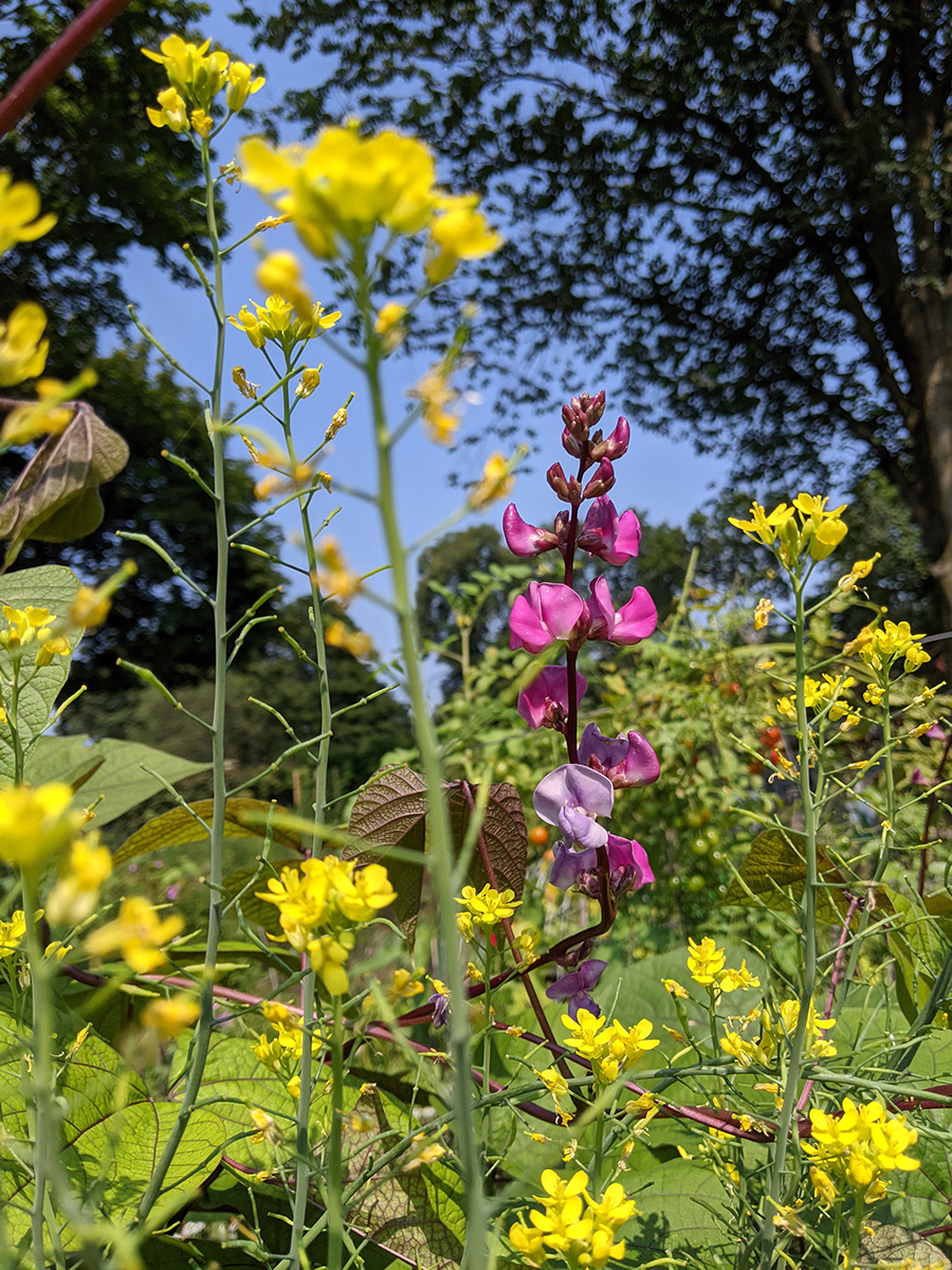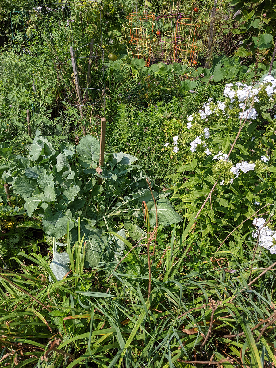 i went down to the community garden in the late morning to check on my plot. i haven't visited in more than a week, it'd been so rainy i haven't had to water. i wore jeans because i didn't want to get mosquito bites. it was warm but wasn't uncomfortably so, although i wouldn't want to be working outside in pants. i had to run back to the house after a quarter way there when i realized i forgot my phone.