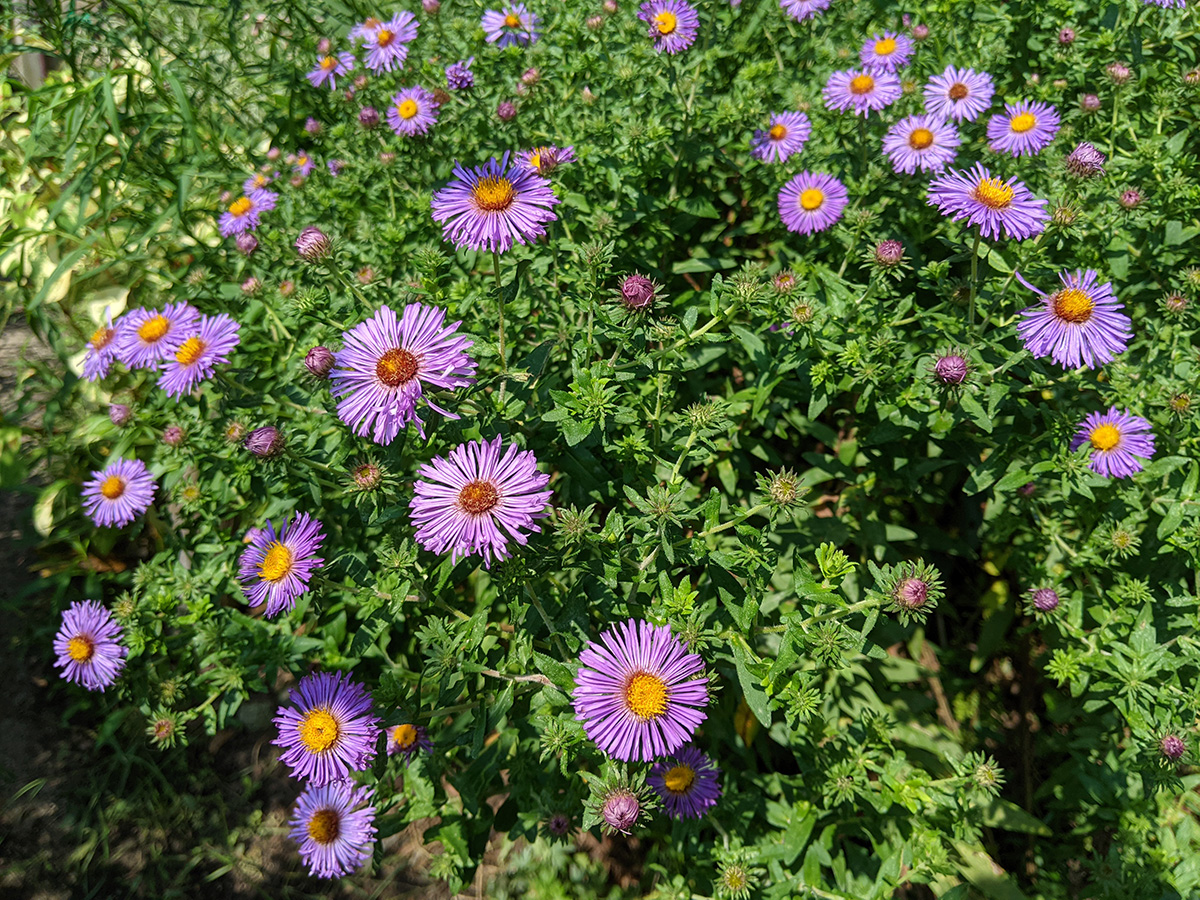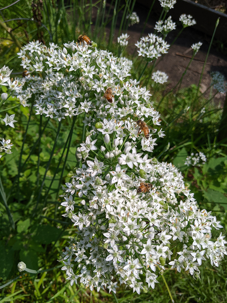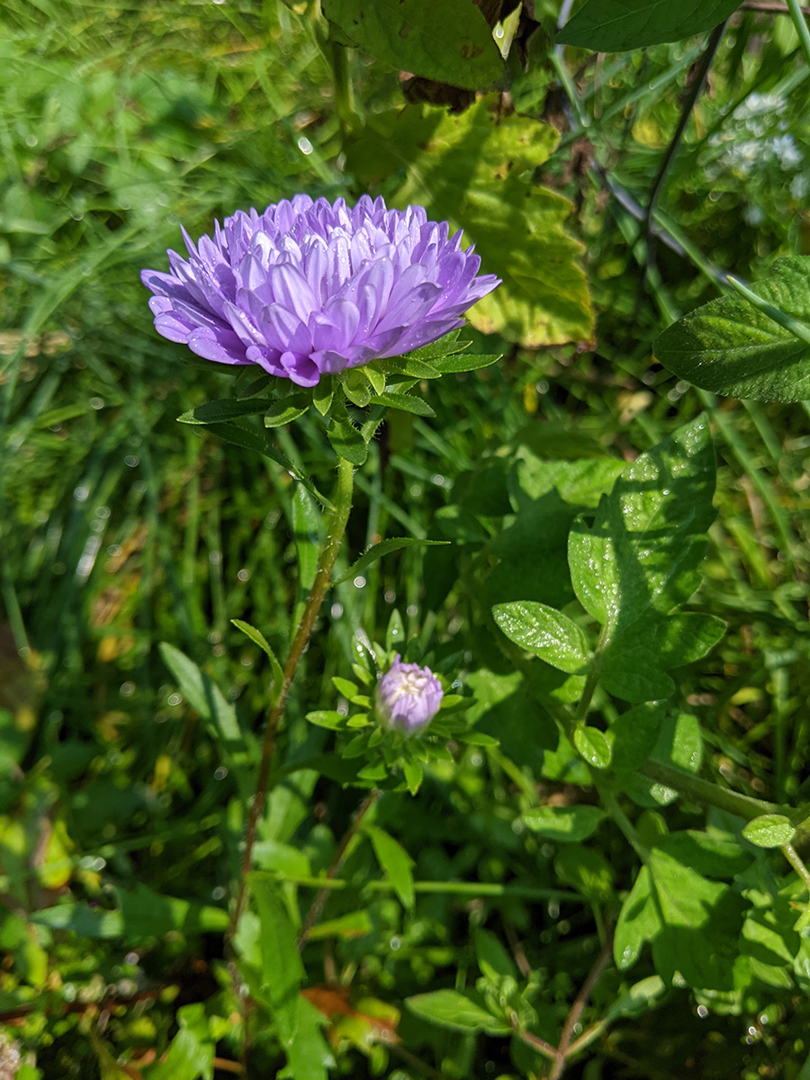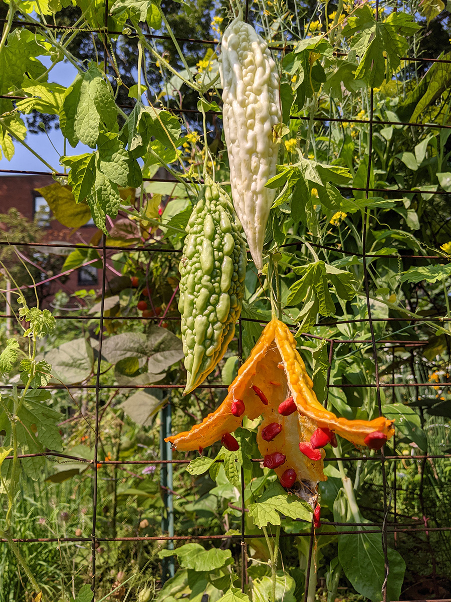 all my garlic chive borders were blooming, buzzing with bees. i saw the perfect trifecta of bitter melons: green, white, and orange, splitting open to reveal red seeds which i collected and washed. i harvested the 2 green tomatoes from the southeastern corner and pulled up the rest of the plant, it's too far gone to produce anymore fruits. i also picked a bunch of cherry tomatoes and a few cloudy day tomatoes. some of my chinese asters have flowered, they're a slightly pinkish violet color. likewise, my hyacinth beans have flowered too , but hard to see them from the tangle of rampant bean leaves.