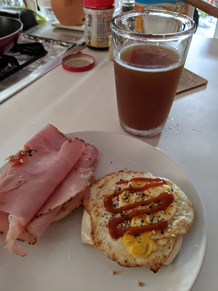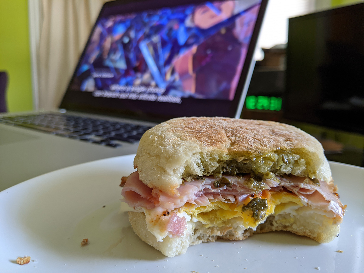 for lunch i made an english muffin sandwich: egg, peppered ham, everything bagel seasoning, american cheese, sriracha sauce, basil pesto. i washed it down with some half & half ice tea while watching the latest episode of marvel's what if.