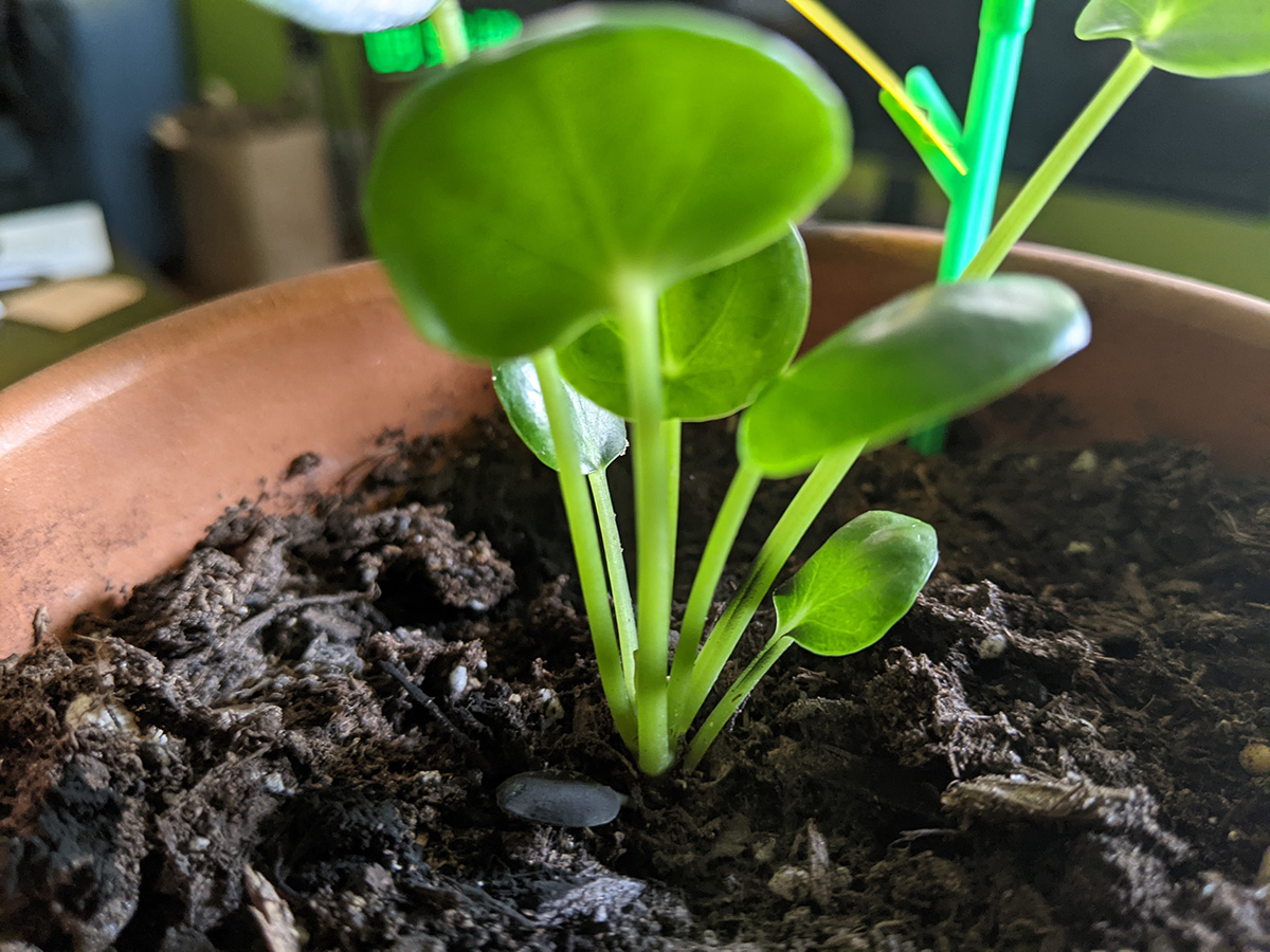 after changing out the fungus gnat covered yellow sticky traps, i noticed some black spots on my pilea. i went online and searched for "pilea black leaves" but none of the diseases i saw online looked like what i had. besides the black that looked like rot, the pilea seemed fine otherwise. whatever it is happened quick, because i looked at a photo of the pilea i took yesterday and all the leaves were still green. one of the smaller lower leaves was completely black and i tried to remove it but it still held firmly to the plant. that's when i noticed green underneath the black. i took the pilea to the sink and gently washed the leaves and stalks with my fingers. turns out the black was just mushroom spores. it washed off easily, revealing healthy green underneath.