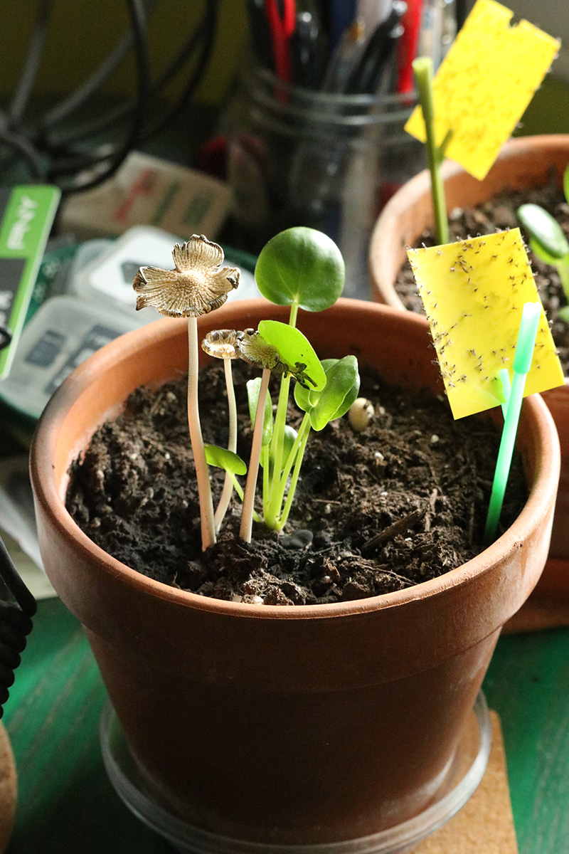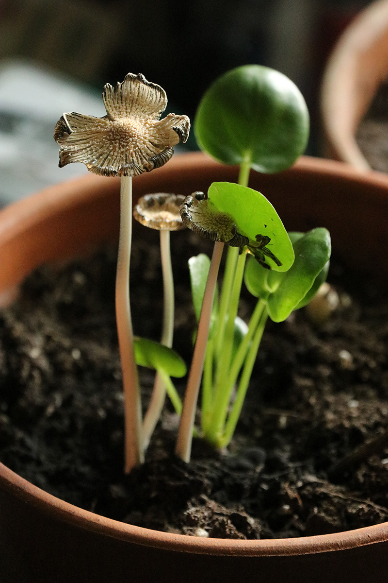the mushroom buttons growing in my pilea pot yesterday? they flowered today, growing as tall as the pilea. they were already at the end stage, the caps curling up and disintegrating. instead of letting them rot, i ended up pulling and throwing them away. one thing i noticed was how wet they were. the caps were practically dripping water.