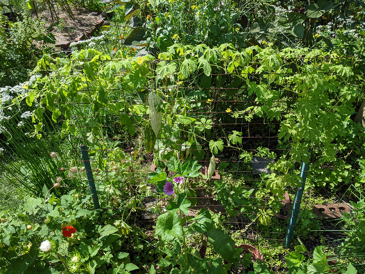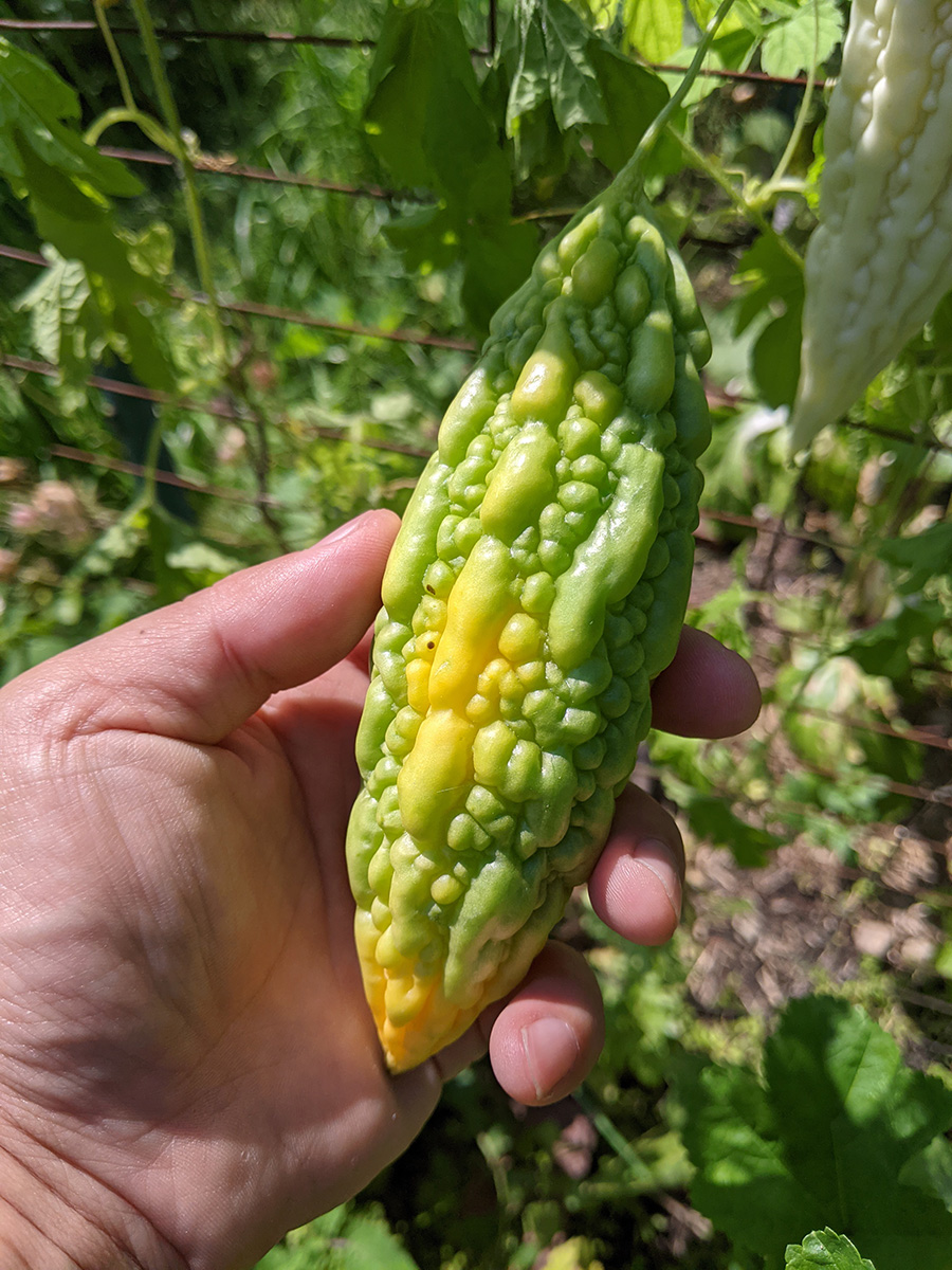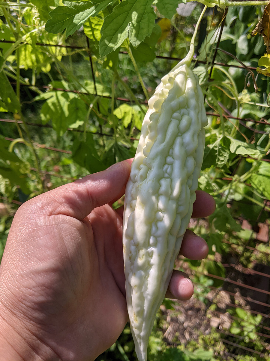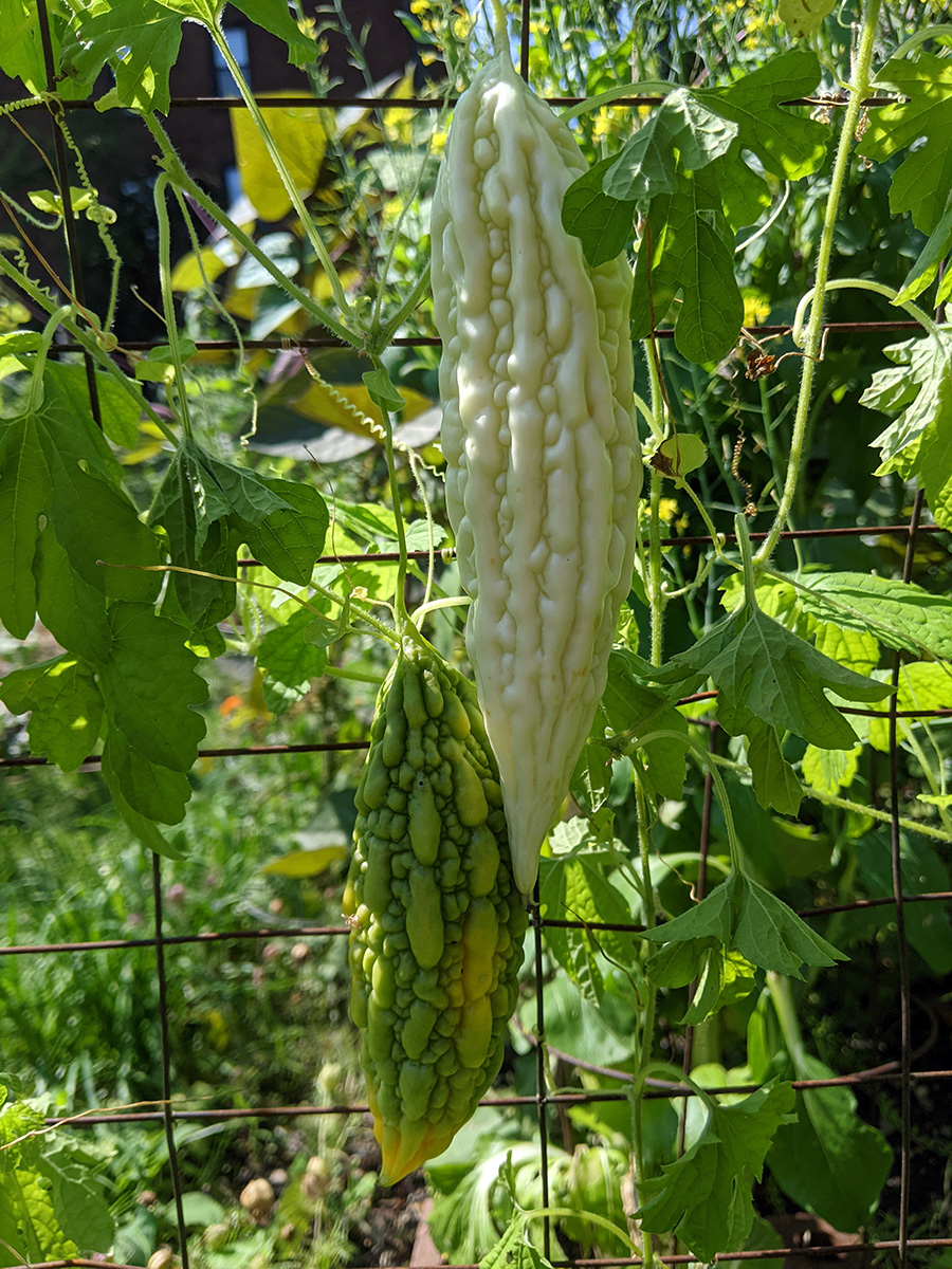 first stop was the community garden, not to water, but to check on my bitter melons. the green one has started to turn yellow in spots, i predict it will split open either tomorrow or saturday. the while bitter melon is still white.
