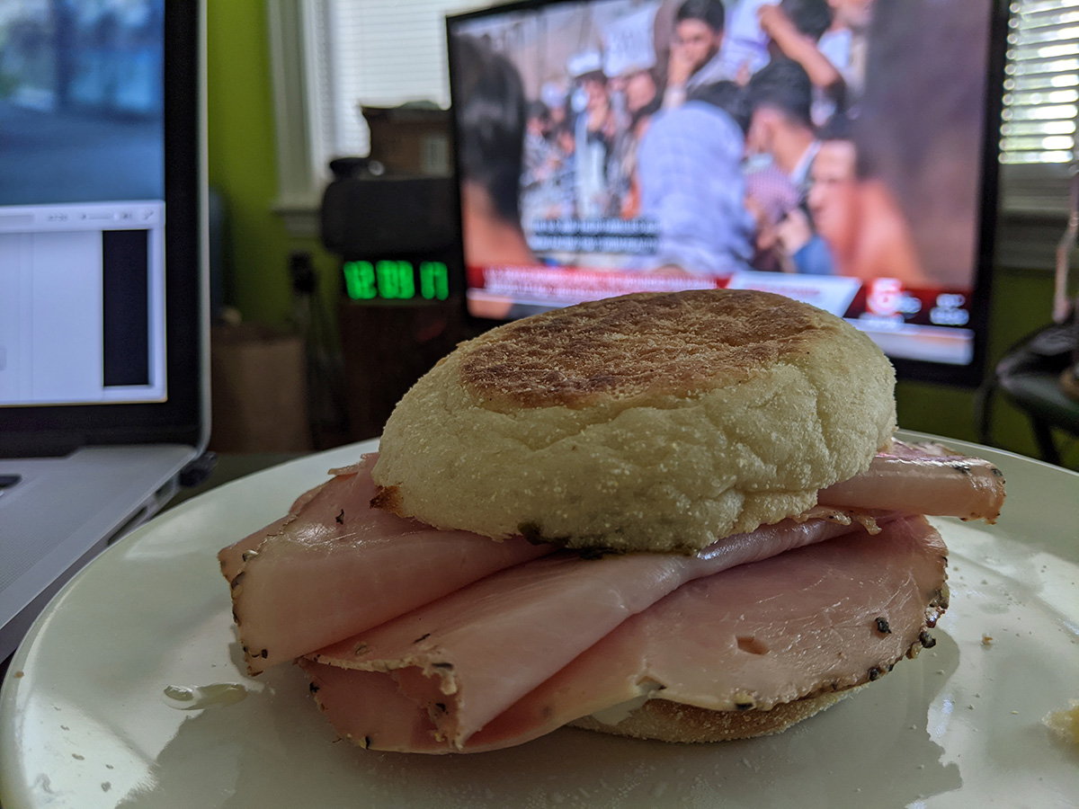i made an english muffin sandwich for lunch, the same recipe as yesterday, except i added some capers. couldn't really taste the capers, i can skip them for next time.