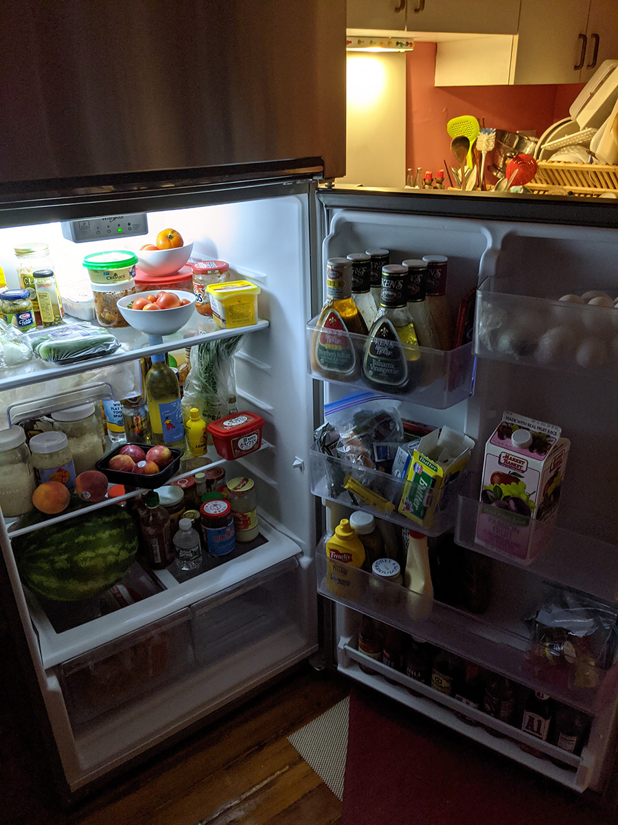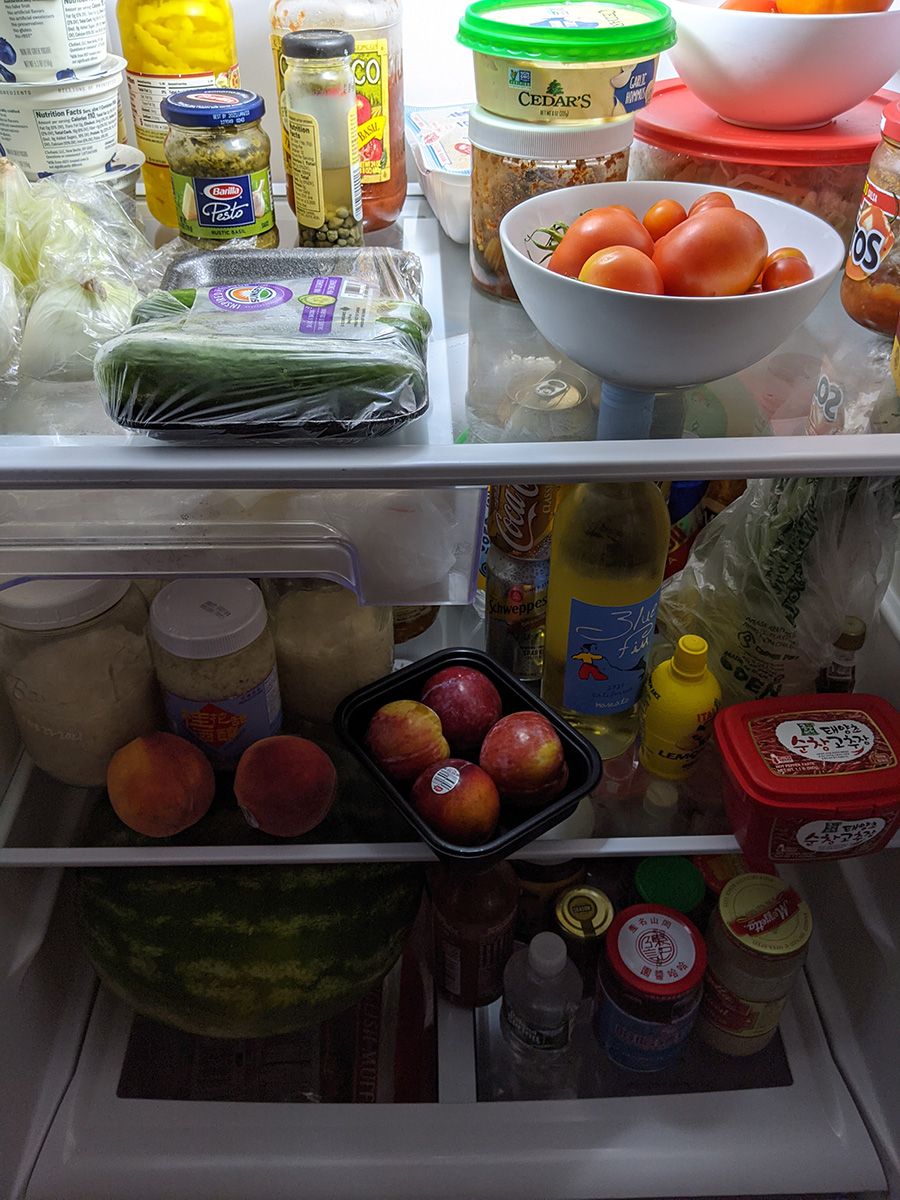 so the darndest thing happened: tonight was the second full day with the new fridge and i wanted to see the usage number after midnight. however for some strange reason, the values for the past 3 days have changed: tuesday's number went up while wednesday and thursday went down. according to the "updated" data, it said the fridge just used 1.35 kWh of electricity. i'll need to monitor it a few more days to see how that'll change. instead i got some baking soda deodorizers for the fridge, a can of non-stick cooking spray, and a $5 watermelon. i was just thinking the other day i've yet to buy a watermelon this summer. typically i buy one from star market because i can just carry it home, but they haven't had a watermelon sale this year. a watermelon is also a good test to see if i can fit it in the new fridge. does it pass the watermelon test?