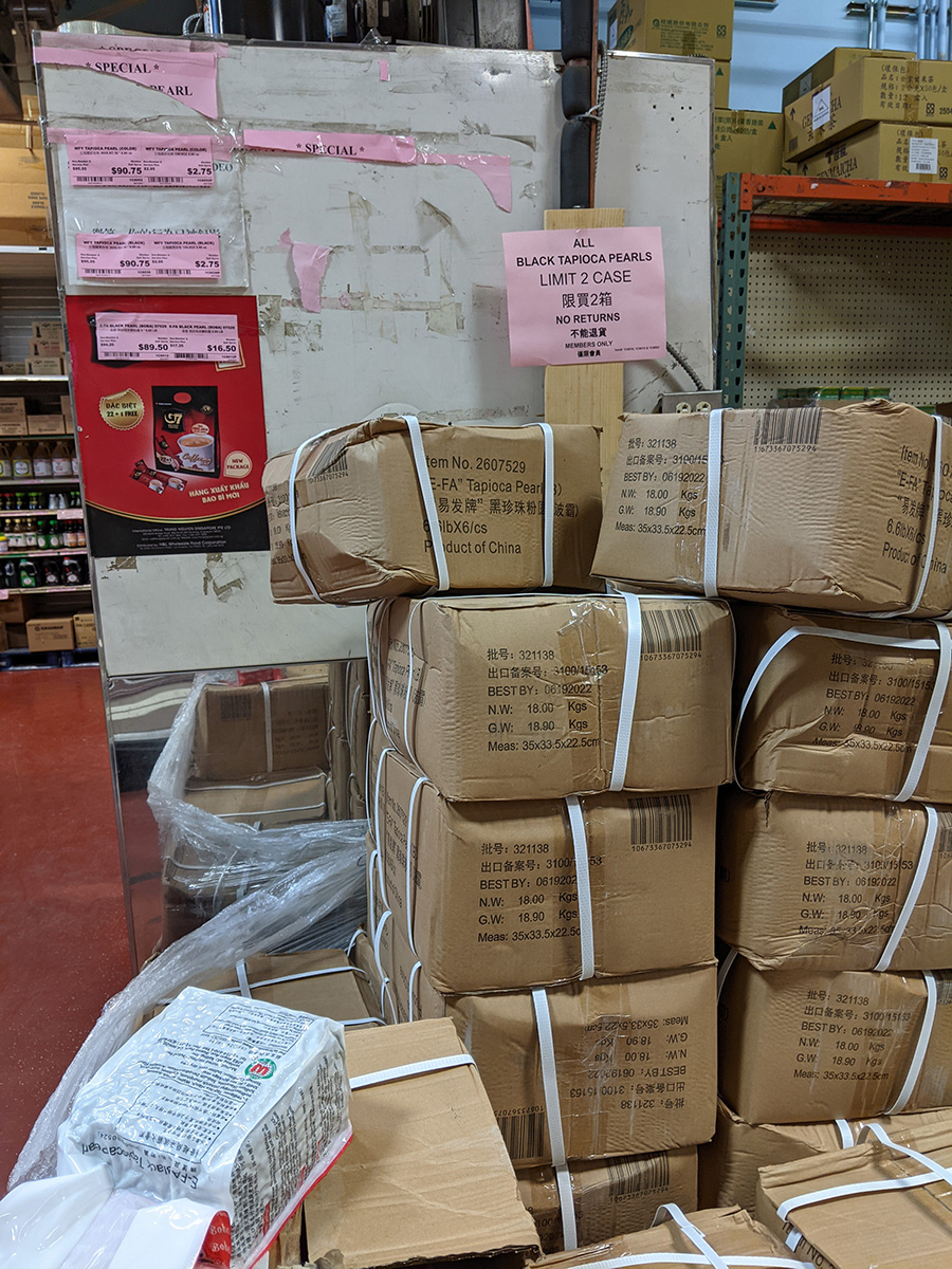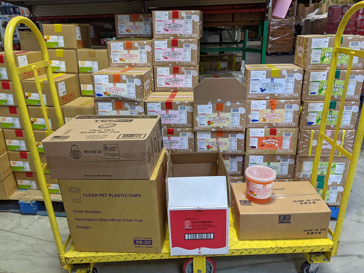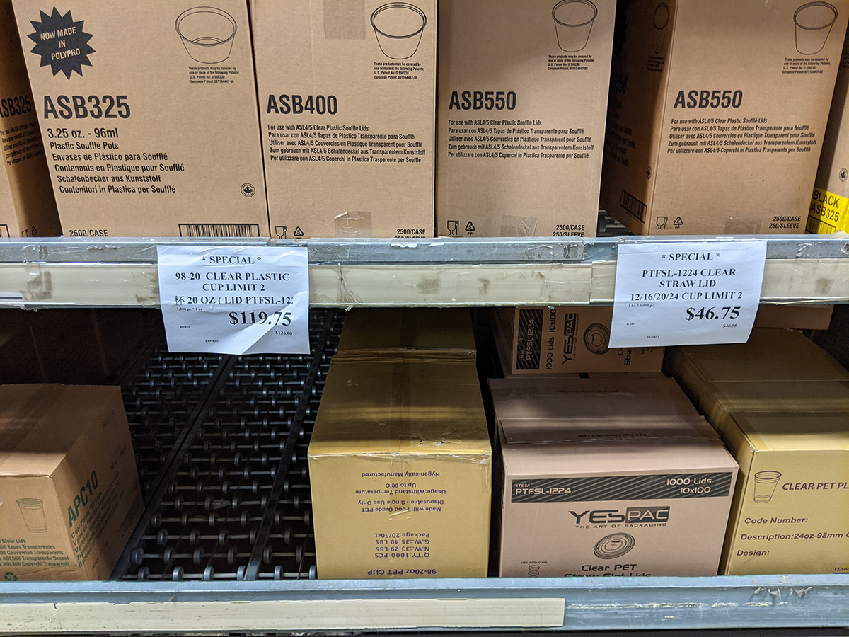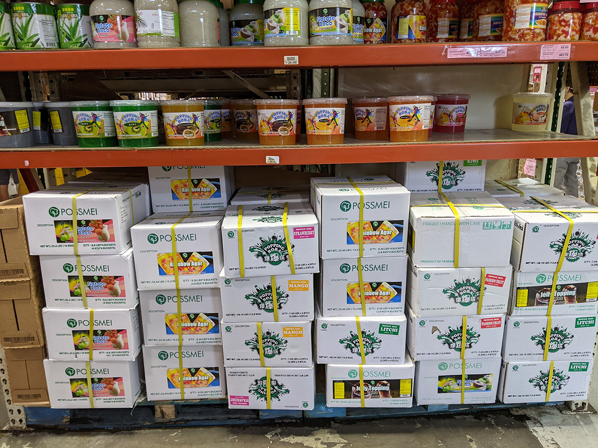 my father followed the checklist my mother gave him as we quickly collected all the supplies we needed. at one point my father asked one of the workers if they had anymore lavender milk tea powder. he was a hispanic guy and didn't know their inventory very well, so he asked one of the chinese workers, who told us they didn't have any. but when my father looked around, he saw an unopened box of lavender powder. it was the hispanic guy who opened the box for us, the chinese worker was zero help and even gave us false information. my father also bought a container of mango-flavored bursting boba ($21) to try out. finally, foodpak actually had 20 oz. clear drink cups in stock at $120/box (1000 cups). we ordered some online a few weeks ago but they seemed to be backordered, so we bought a box as the cafe's supply is running out. we also got matching lids for $40/box.