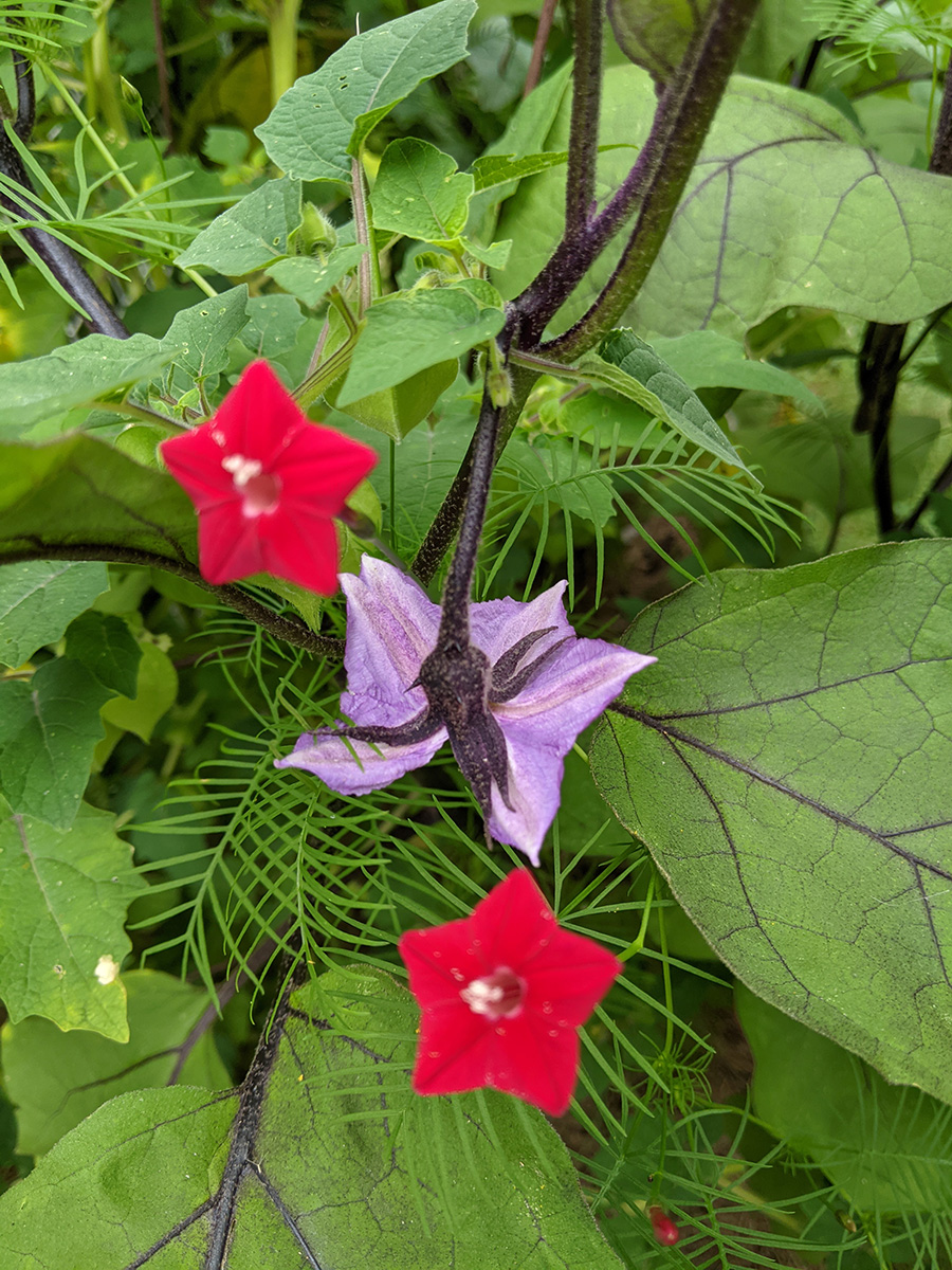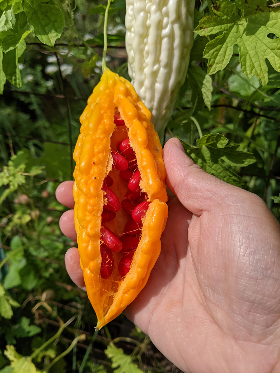 i had a good night's sleep, that crisp cold touch of autumn air blowing through my bedroom window, made me want to sleep even longer. after packing up my things (including the chinatown supplies i got yesterday), i walked down to the community garden to check on bitter melons. the orange one from yesterday had split open, but just a crack, revealing the red seeds inside. i'm going to wait until tomorrow before harvesting to see if it'll open up even more.