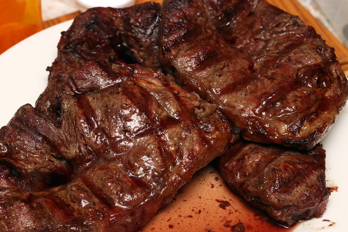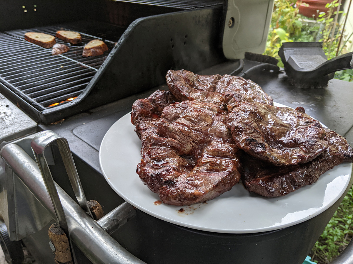 close to evening my father grilled some steaks on the barbecue. they were good, but i think they can be improved with even higher heat. we should also use fresh ground pepper, or something more complex for the rub besides just pepper and salt.