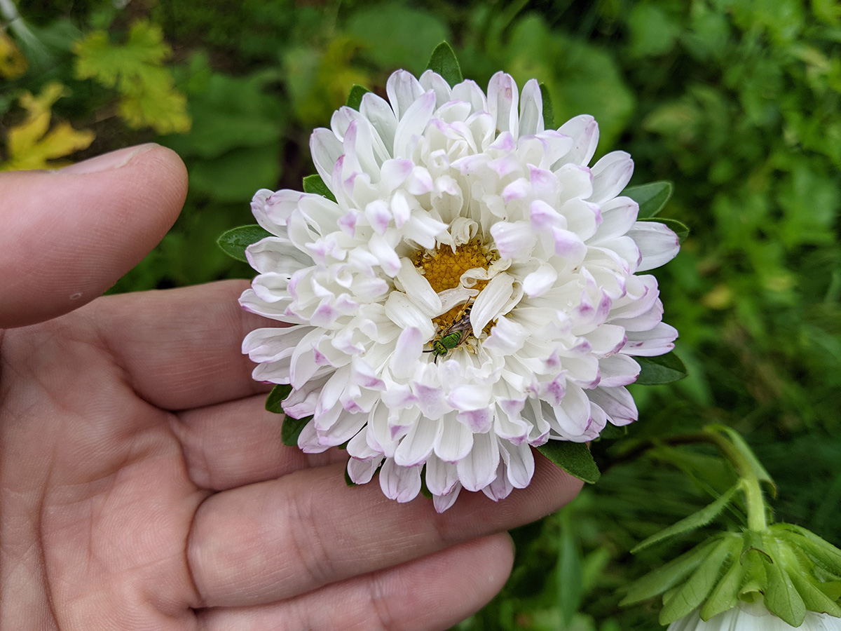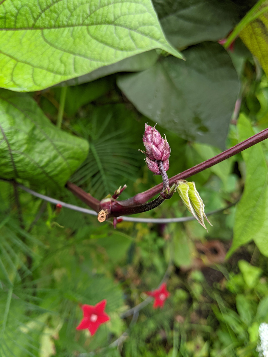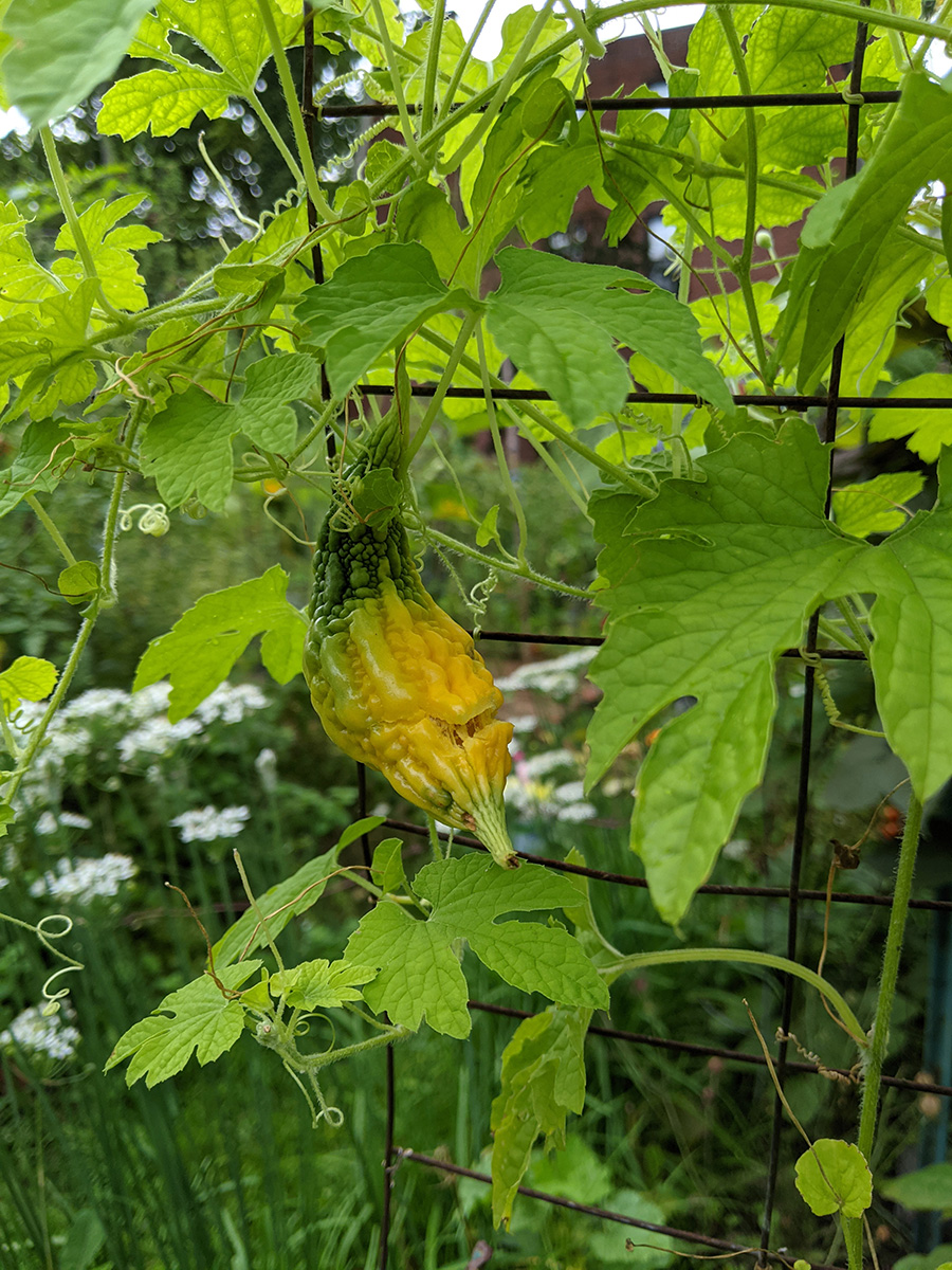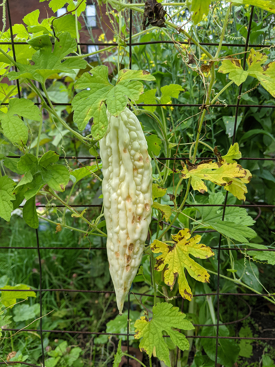 my white bitter melon has not burst yet, but nor has it turned yellow. it's starting to show some spots though, don't know if that's a part of the ripening process or insect damage. there was another smaller curled melon that has turned yellow and developed a fissure, i could see the red seeds inside. my chinese aster colors are violet and white with violet tips. my hyacinth beans continue to grow like crazy, i wrapped a few more tendrils back in on itself. the leaves are pretty though, and now it looks like a large bean bush, like i did it on purpose even though it's just a happy accident. i spotted 2 snails which i picked off my plants and crunched them underfoot. i take no pleasure in killing snails but i've had plenty of tender seedlings defoliated by their ilk that i dispatch them whenever i see them.