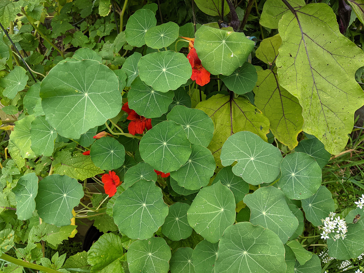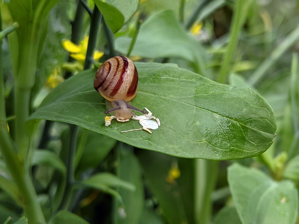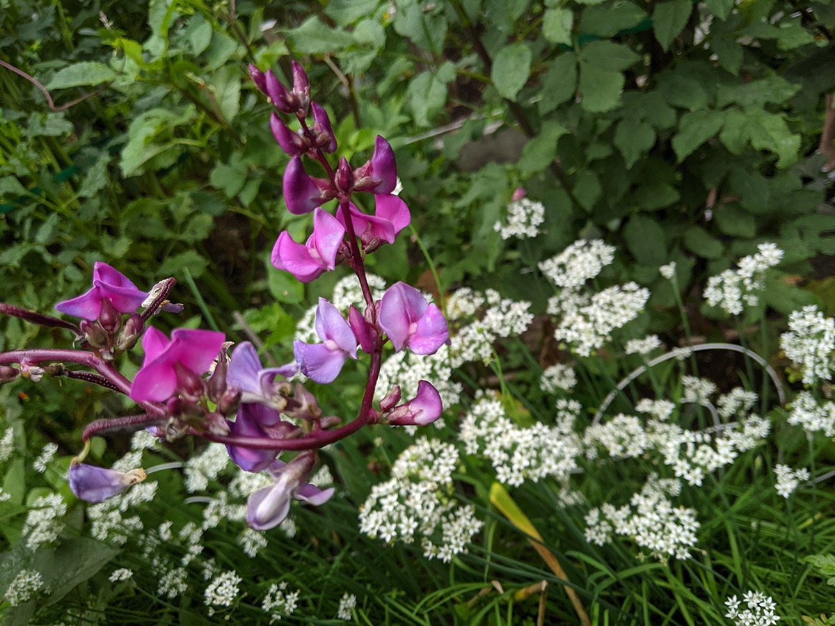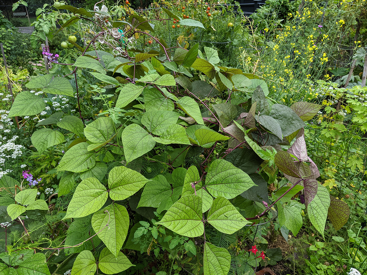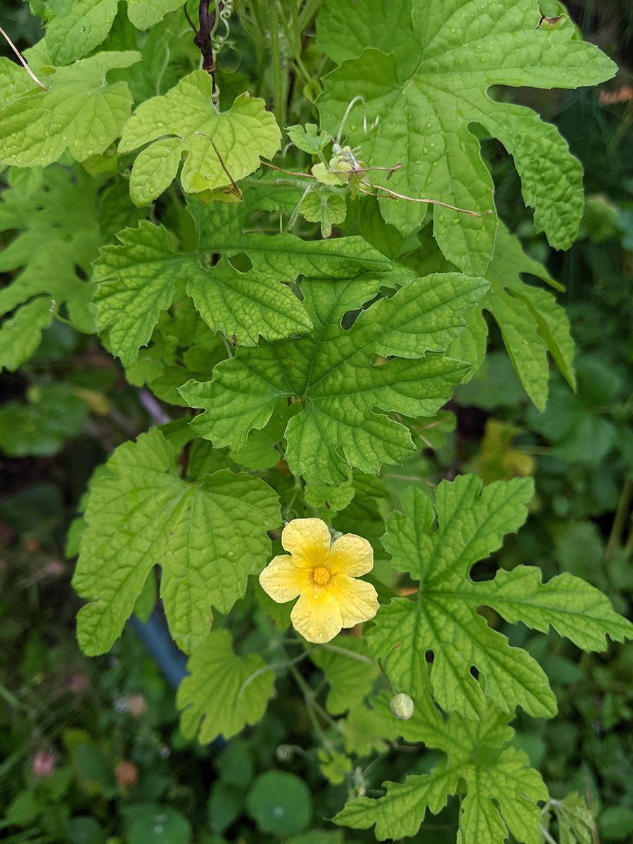 my white bitter melon has not burst yet, but nor has it turned yellow. it's starting to show some spots though, don't know if that's a part of the ripening process or insect damage. there was another smaller curled melon that has turned yellow and developed a fissure, i could see the red seeds inside. my chinese aster colors are violet and white with violet tips. my hyacinth beans continue to grow like crazy, i wrapped a few more tendrils back in on itself. the leaves are pretty though, and now it looks like a large bean bush, like i did it on purpose even though it's just a happy accident. i spotted 2 snails which i picked off my plants and crunched them underfoot. i take no pleasure in killing snails but i've had plenty of tender seedlings defoliated by their ilk that i dispatch them whenever i see them.