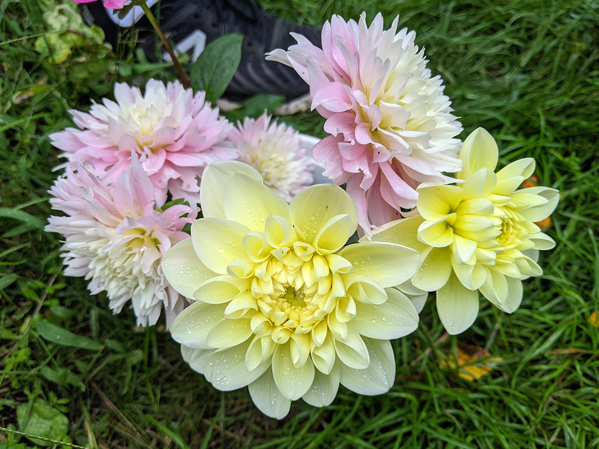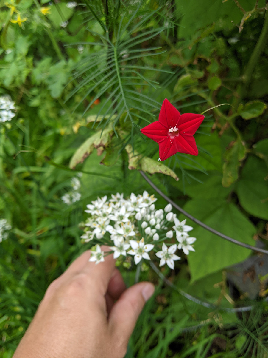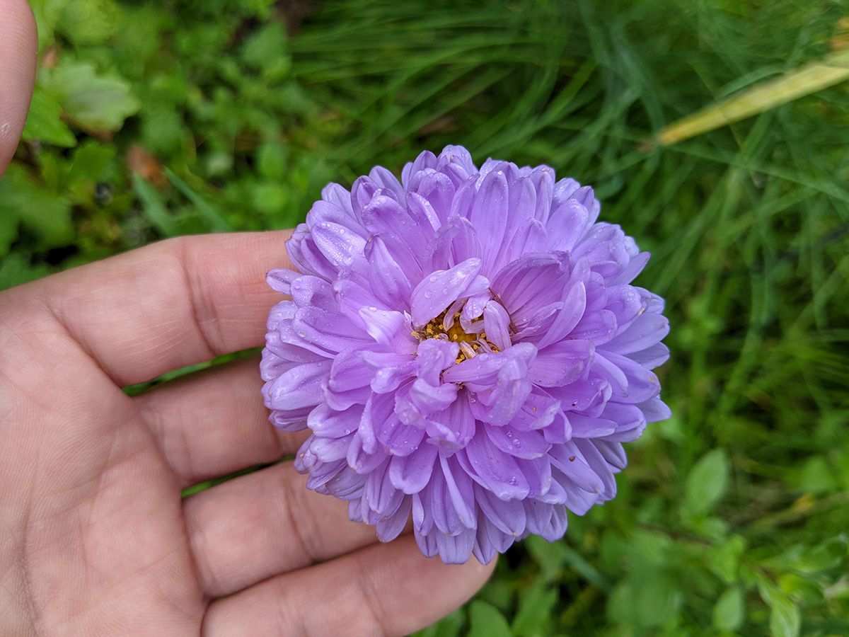 it was drizzling slightly by the time i disembarked, but not enough to warrant using an umbrella. instead of going home, i took a detour and walked to the community garden to check on my plants. the gardener who has the dahlia plot next to mine was there. he either didn't see me or choose to ignore me until i said hi to him. we had a nice chat about our gardens, i introduced him to hyacinth beans, cypress vines, chinese asters, nigellas, and bitter melons. he took some photos of the asters which resembled his beloved dahlias. we also chatted about sports because i noticed he was wearing a red sox hat. he told me he played football back in college, and we shared our mutual shock over the cam newton cut yesterday. the whole time it was still raining but thankfully stopped. i did however get a few more new mosquito bites.