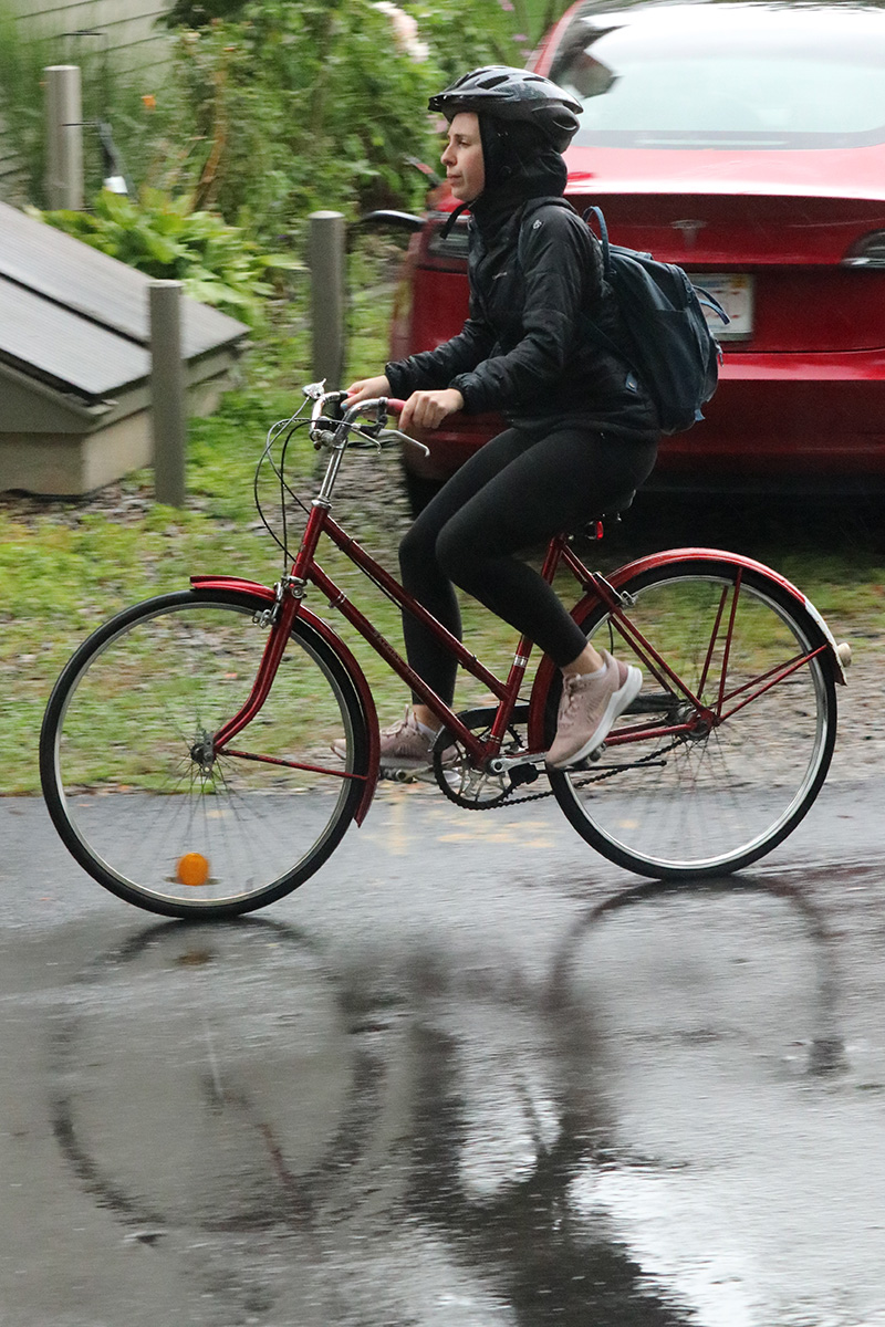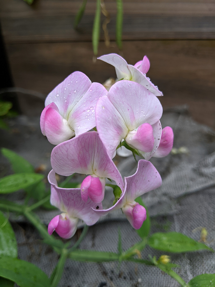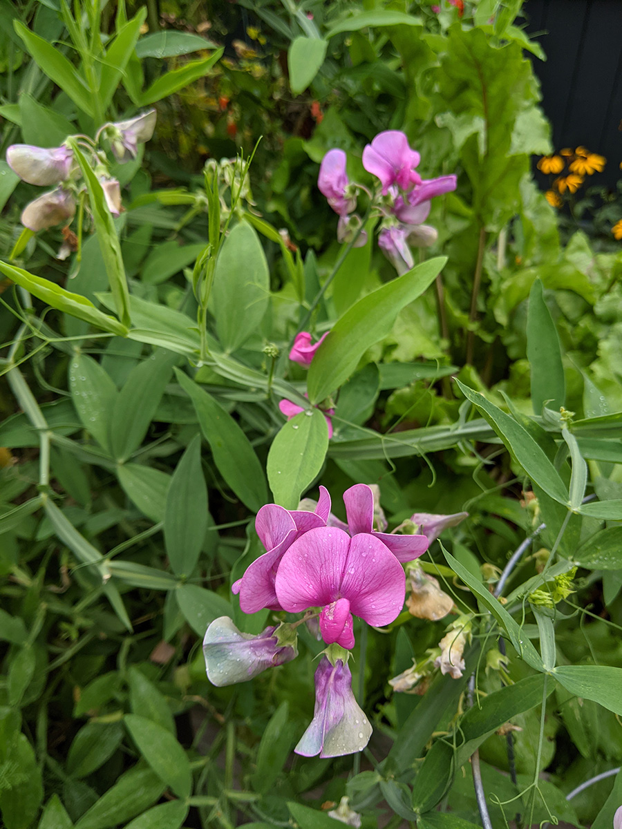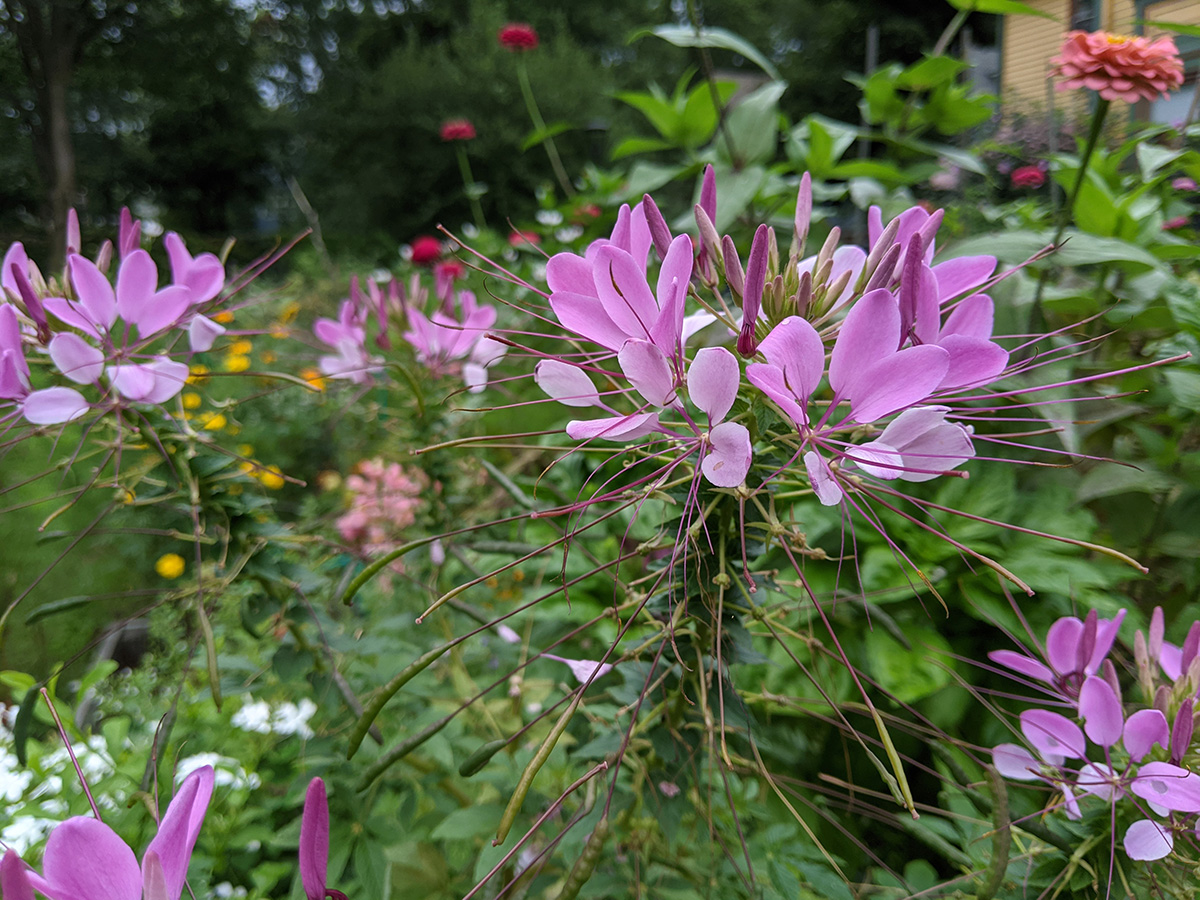 i checked out some of the other plots (lynn has these pretty pink beach peas, my garden neighbor picked some dahlias, and spider flowers are growing in the raised bed by the entrance) before finally walking home. i wore my helmet on my head as i was tired of carrying it. i picked off a ripe cloudy day tomato and put it in my bag.