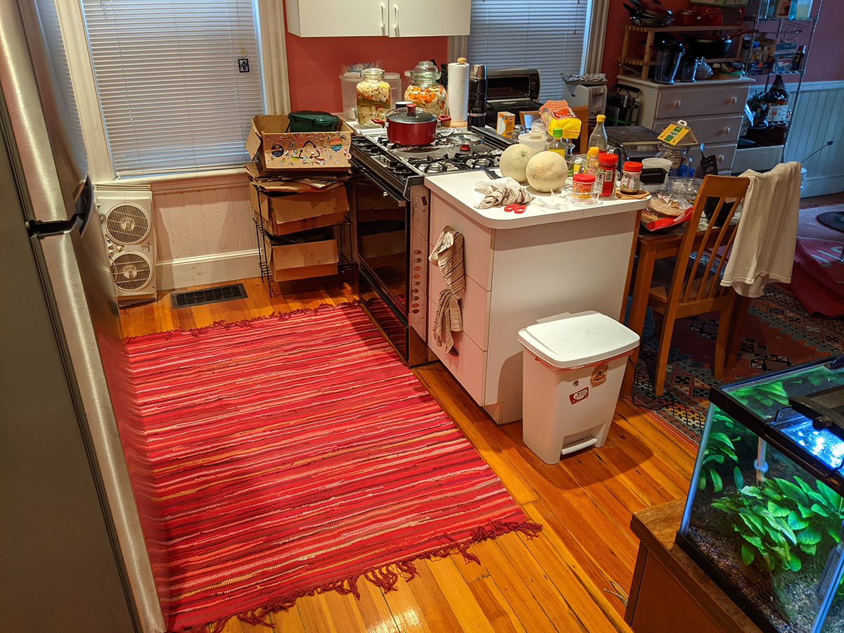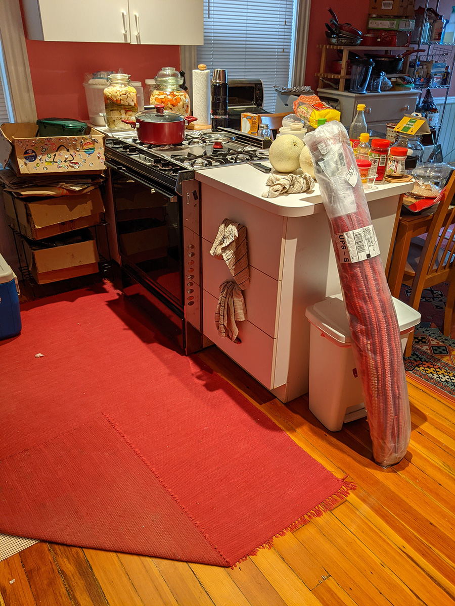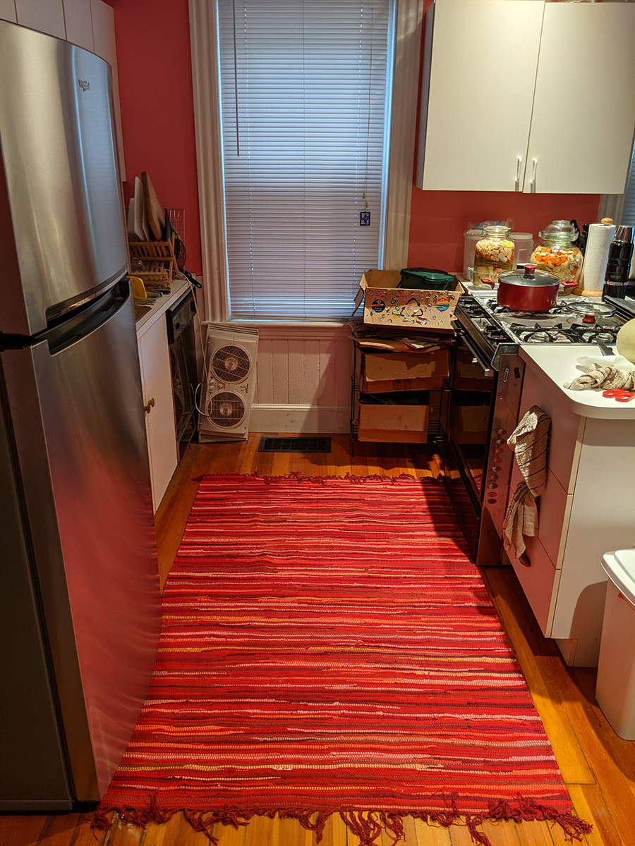 my new 4x6 ft chindi cotton hand woven area rug arrived in the early afternoon. UPS sent me an alert that the rug was left on my doorstep, nobody rang my doorbell. i vacuumed the old 5x7 ft kitchen rug before rolling it up, replacing it with the new rug. material wise they're similar, the new rug slightly thicker and the rows bigger. it felt good on my feet - soft - and the rug had a pleasant cotton textile smell to it. it has a lot more colors than i'm used to, it'll take me a while to adjust. my previous red kitchen rug had been my de facto rug ever since i moved in, through thick and thin. i even flipped it over as the other side was too badly stained, to extend the life of the rug. one thing i noticed though is even though 4x6 ft fits perfectly in my kitchen, the rug doesn't extend all the way to the edge of my kitchen sink cabinet, so i'm stepping on cold wooden floors, which i'm not used to it. i need to find a small piece of carpeting for that area. i was thinking about getting some FLOR rug samples (6x6" squares are $2 a piece with free shipping).