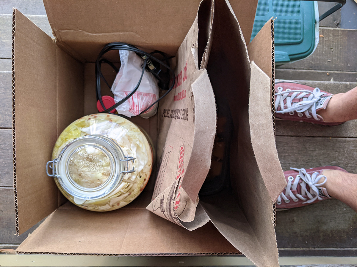 my parents' stopped by my place after work, one their way to drop off my sister's godmother at her place in central square. they were here to pick up a few things: the spare tatung power cord, ginger powder, rice flour, and kimchi paocai featuring long beans. i gave them a bonus box of sliced cantaloupe.