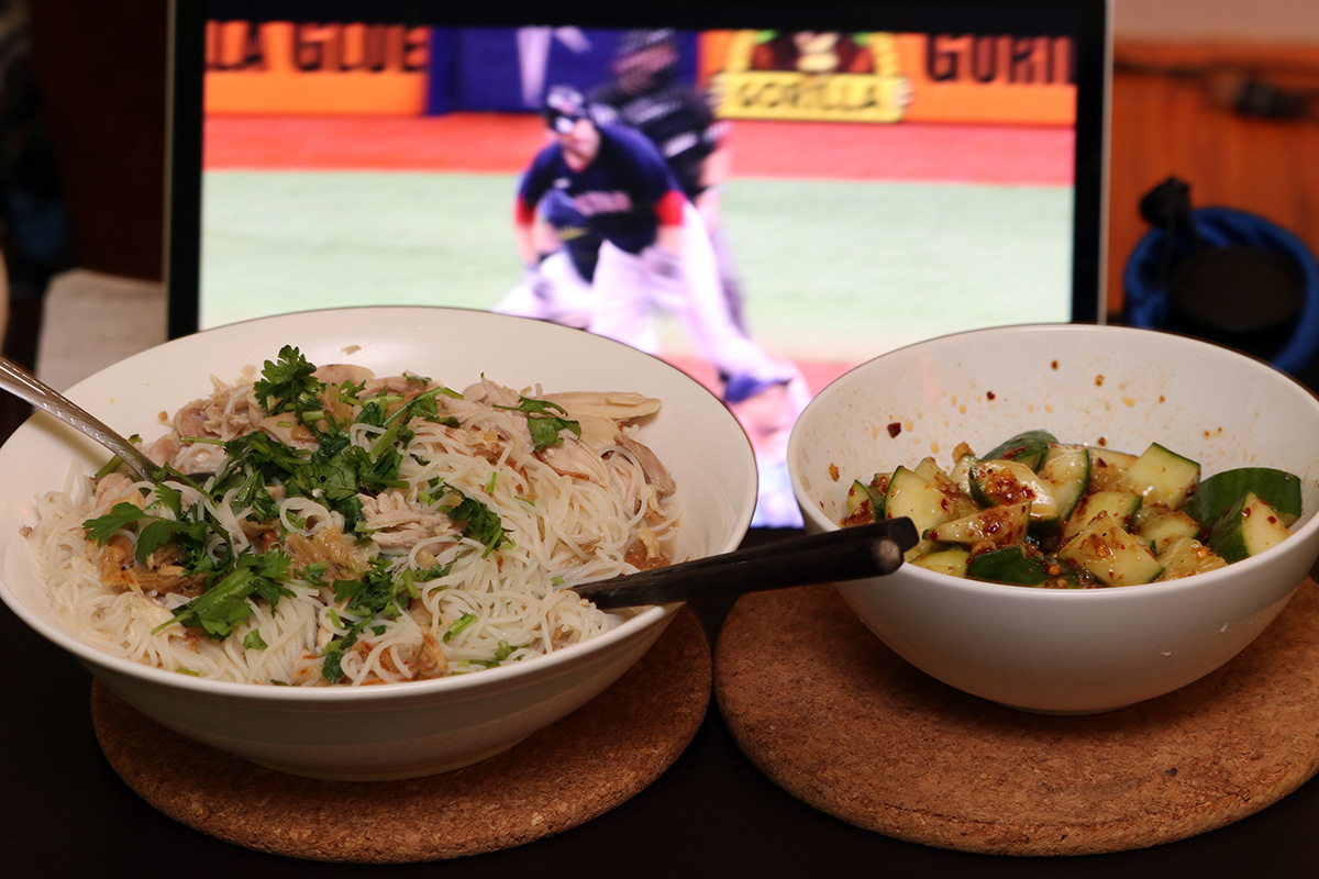 for dinner it was my final serving of rice noodles along with a bowl of cucumber salad. i tried to put less wine vinegar and more sichuan chili oil, but the flavor was still off. maybe the secret is to add more salt, but i'm already using salt for reduction and i'm adding soy sauce which is also salty. i ate while watching game 4 between the red sox and the devil rays. boston ended up winning again, tied the 4 game series. red sox go back to face the indians, followed by a 3 game series against the rays again.