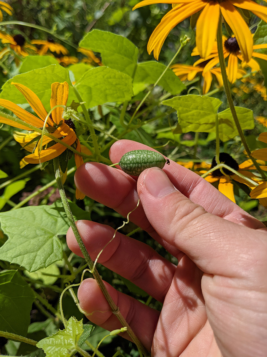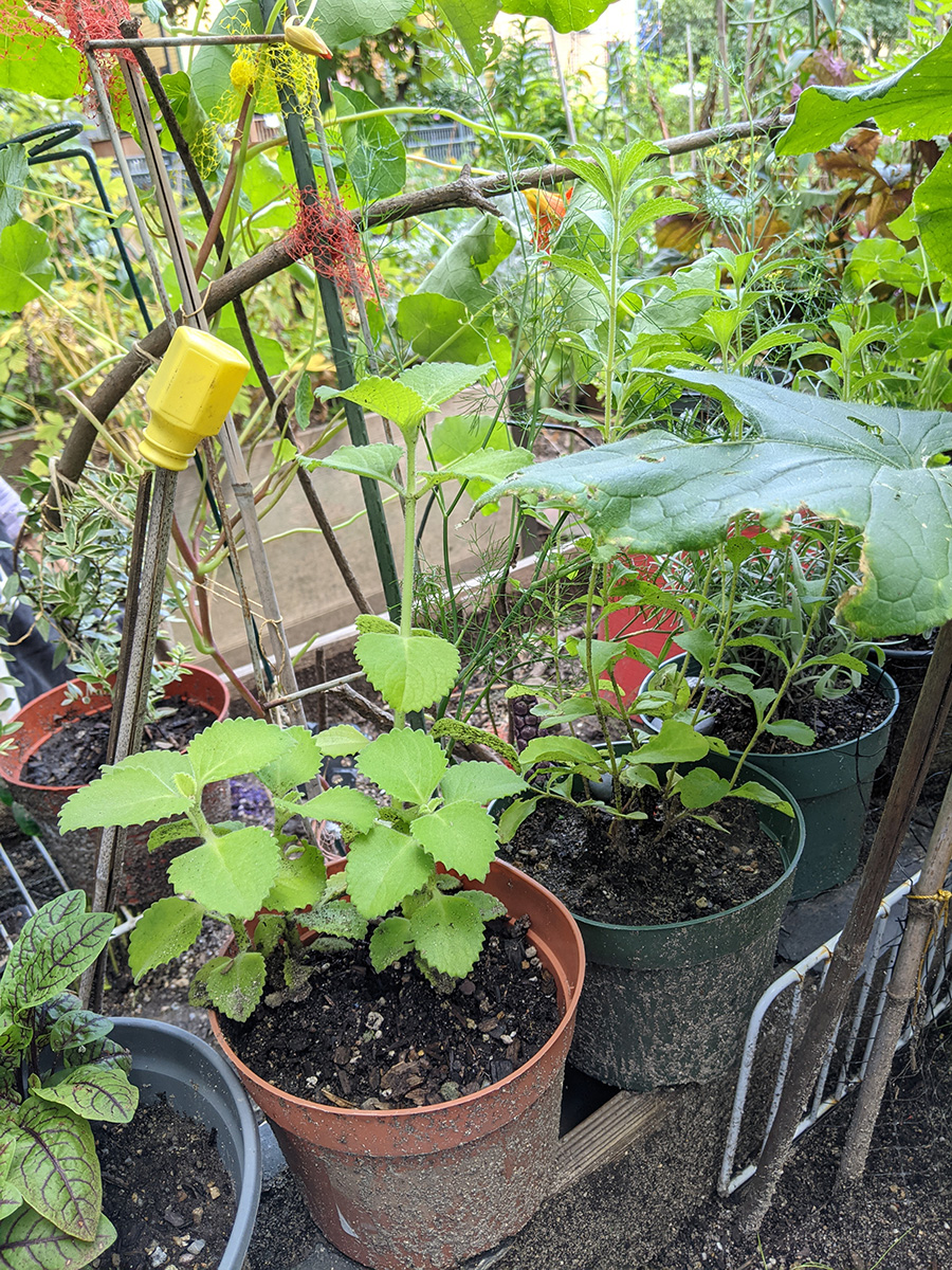 anne showed me her plot at the back of the garden, she had several different types of herbs growing in pots. one of them was stevia, which i know about but never tried eating one of their leaves. when i did i was amazed, incredibly sweet, totally unexpected. anne also had a bunch of purple-green shiso growing but when i tried one of the leaves i didn't really taste anything. later she showed me the children's garden next to the elementary school. i saw green pumpkins which i've never seen before (all the pumpkins i've ever seen are already orange). they were also growing cucamelons.