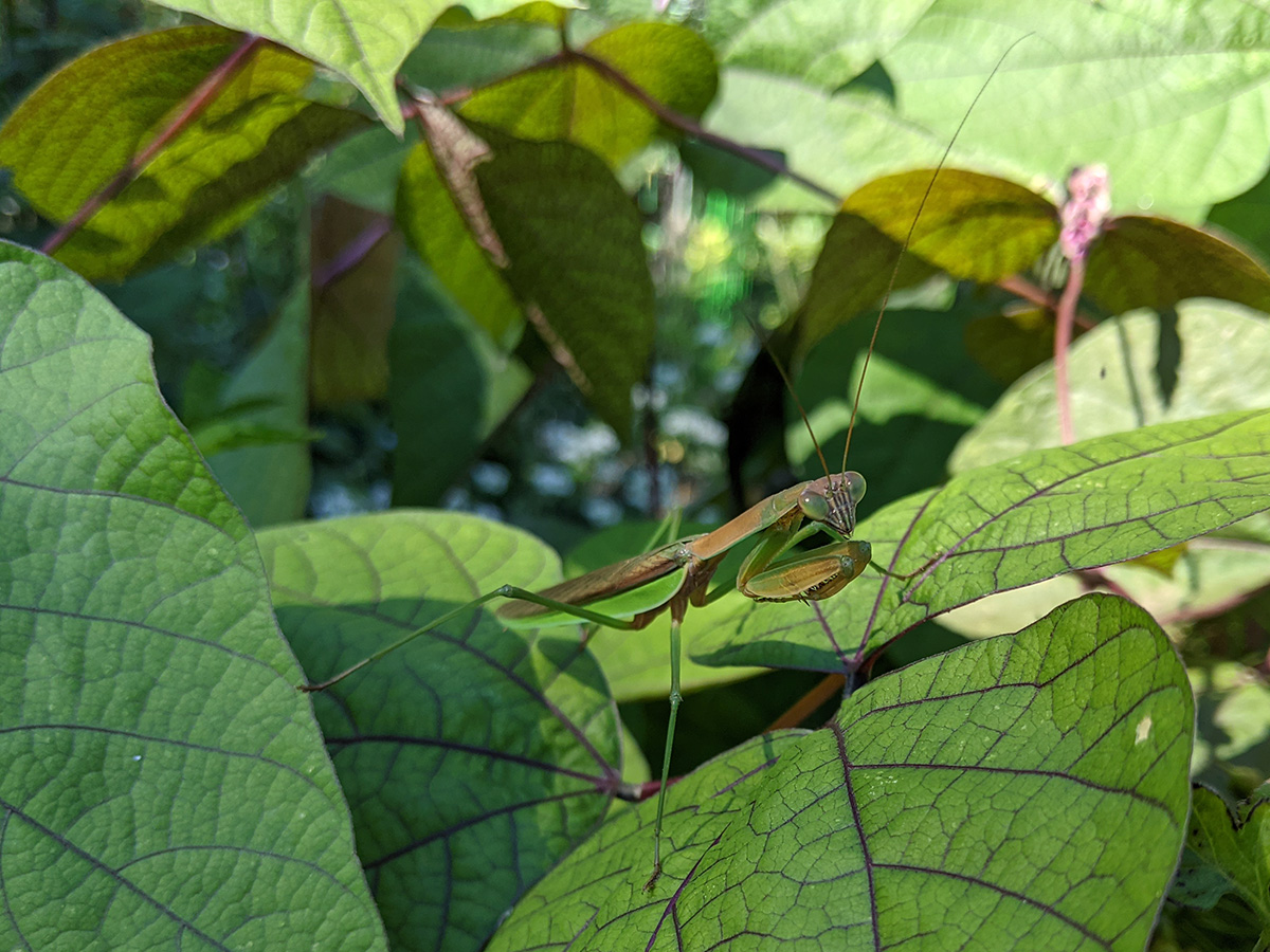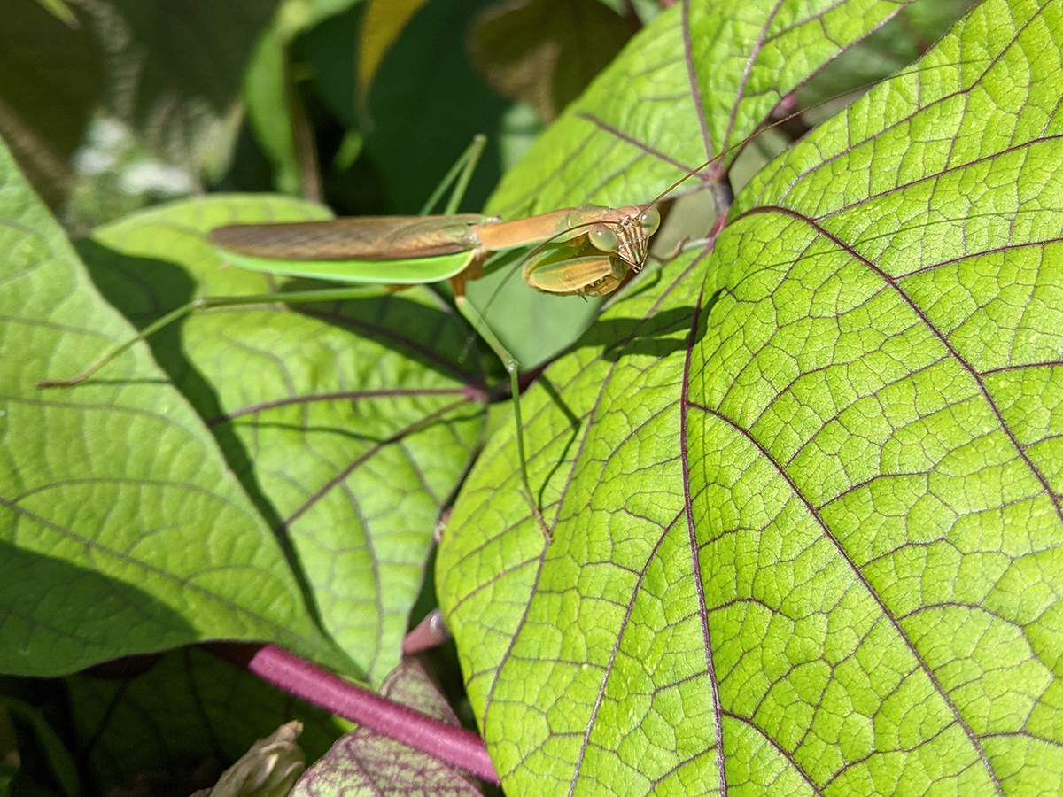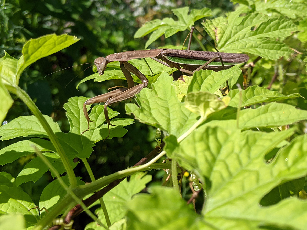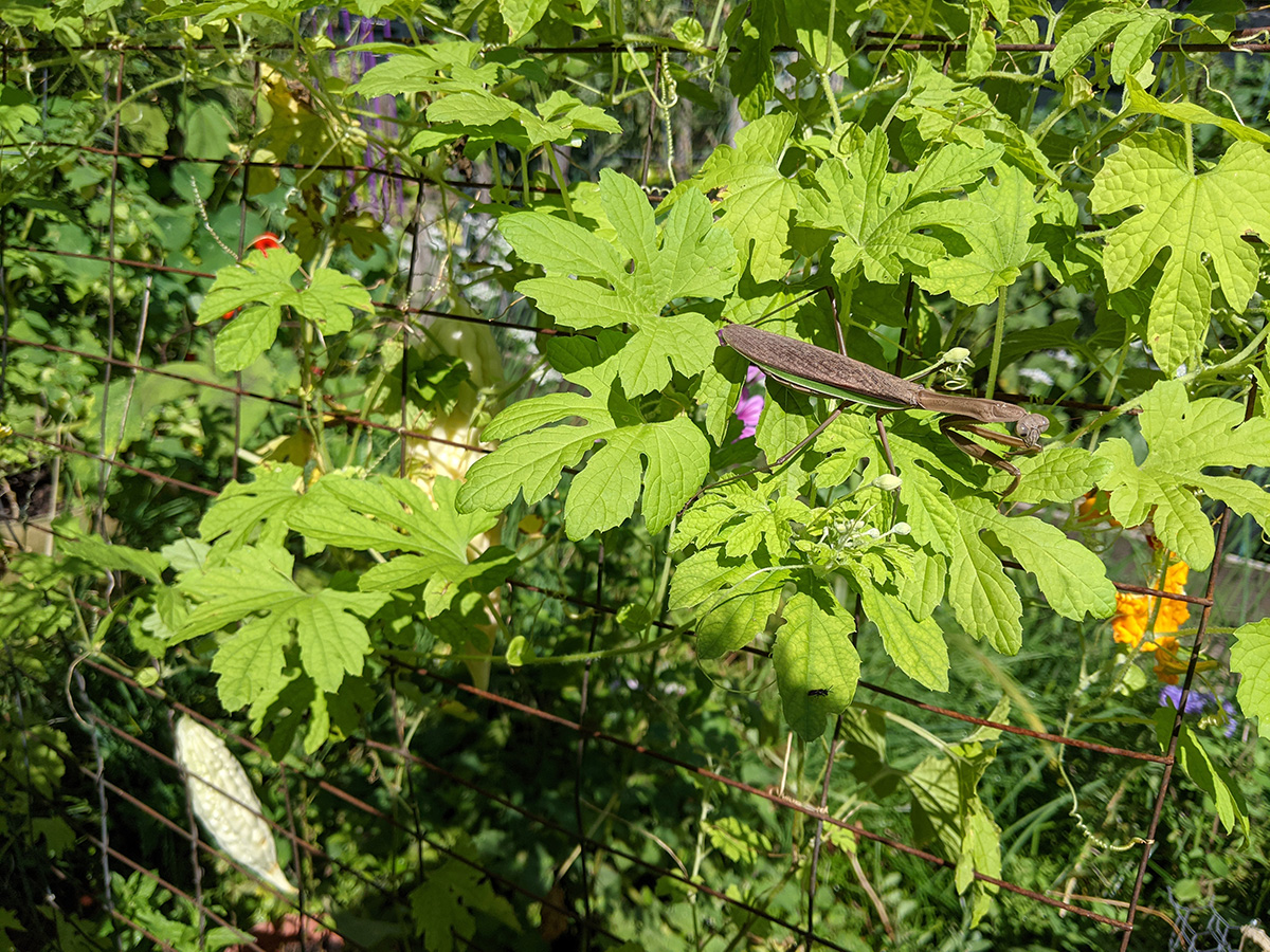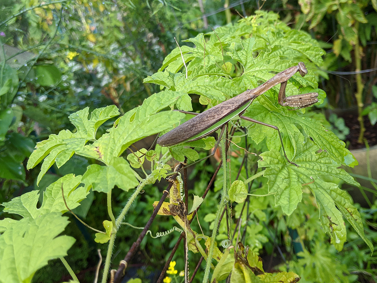 while explaining to her the life cycle of the bitter melon, i looked on my vines and saw something that looked like either a brown leaf or twig. it took me a few seconds to register what it actually was, a brown mantis. it was big, about 3-4" long. i'd heard there were mantises in the garden but this is my first time seeing one, and in my plot no less. anne was saying there might be more, and sure enough, when i looked on my hyacinth bean vines, there was another mantis. these were chinese mantises, the one on the bitter melons seems to be female, while the one on the hyacinth beans is a male. too bad i didn't have my dSLR camera, maybe i'll come back tomorrow with it and try to get some better quality photos.