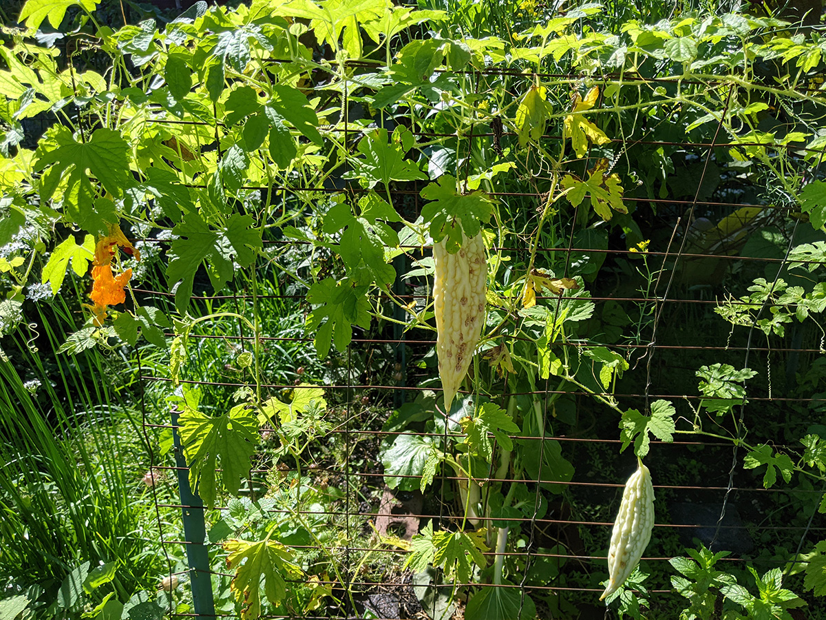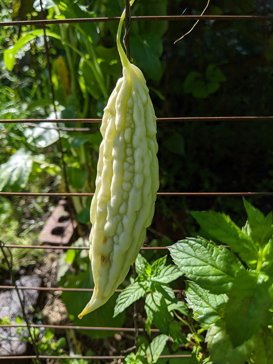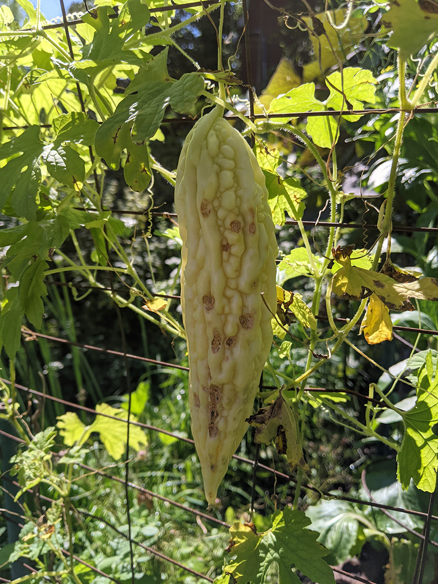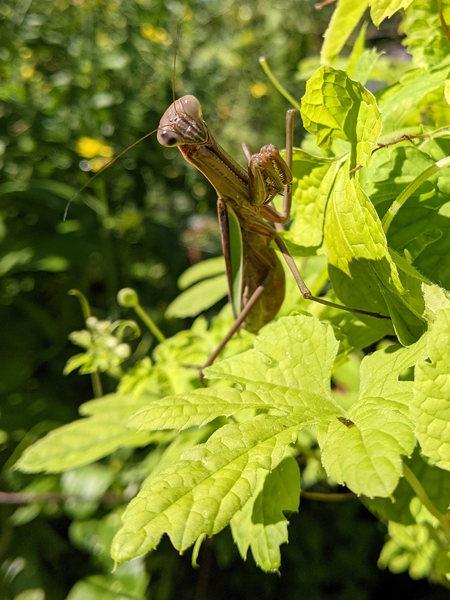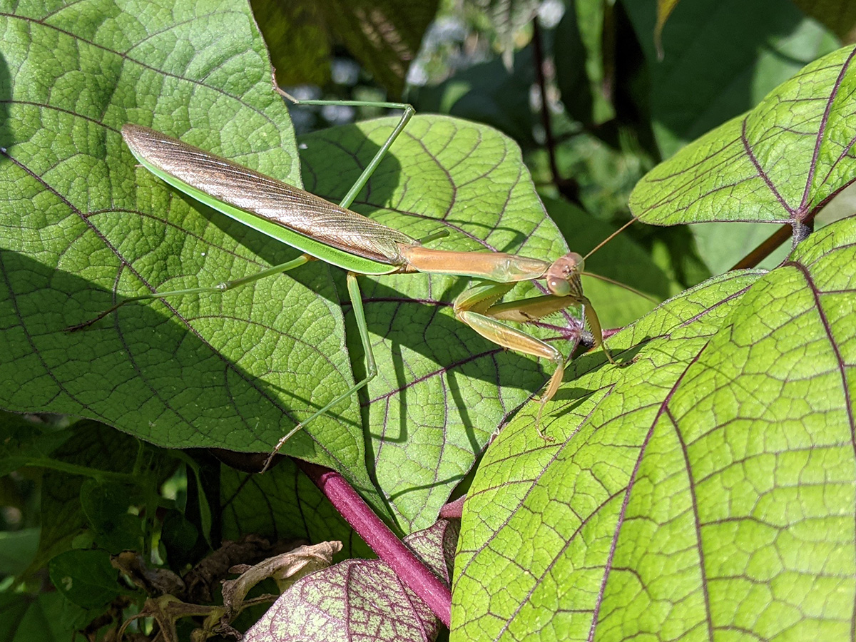 while explaining to her the life cycle of the bitter melon, i looked on my vines and saw something that looked like either a brown leaf or twig. it took me a few seconds to register what it actually was, a brown mantis. it was big, about 3-4" long. i'd heard there were mantises in the garden but this is my first time seeing one, and in my plot no less. anne was saying there might be more, and sure enough, when i looked on my hyacinth bean vines, there was another mantis. these were chinese mantises, the one on the bitter melons seems to be female, while the one on the hyacinth beans is a male. too bad i didn't have my dSLR camera, maybe i'll come back tomorrow with it and try to get some better quality photos.