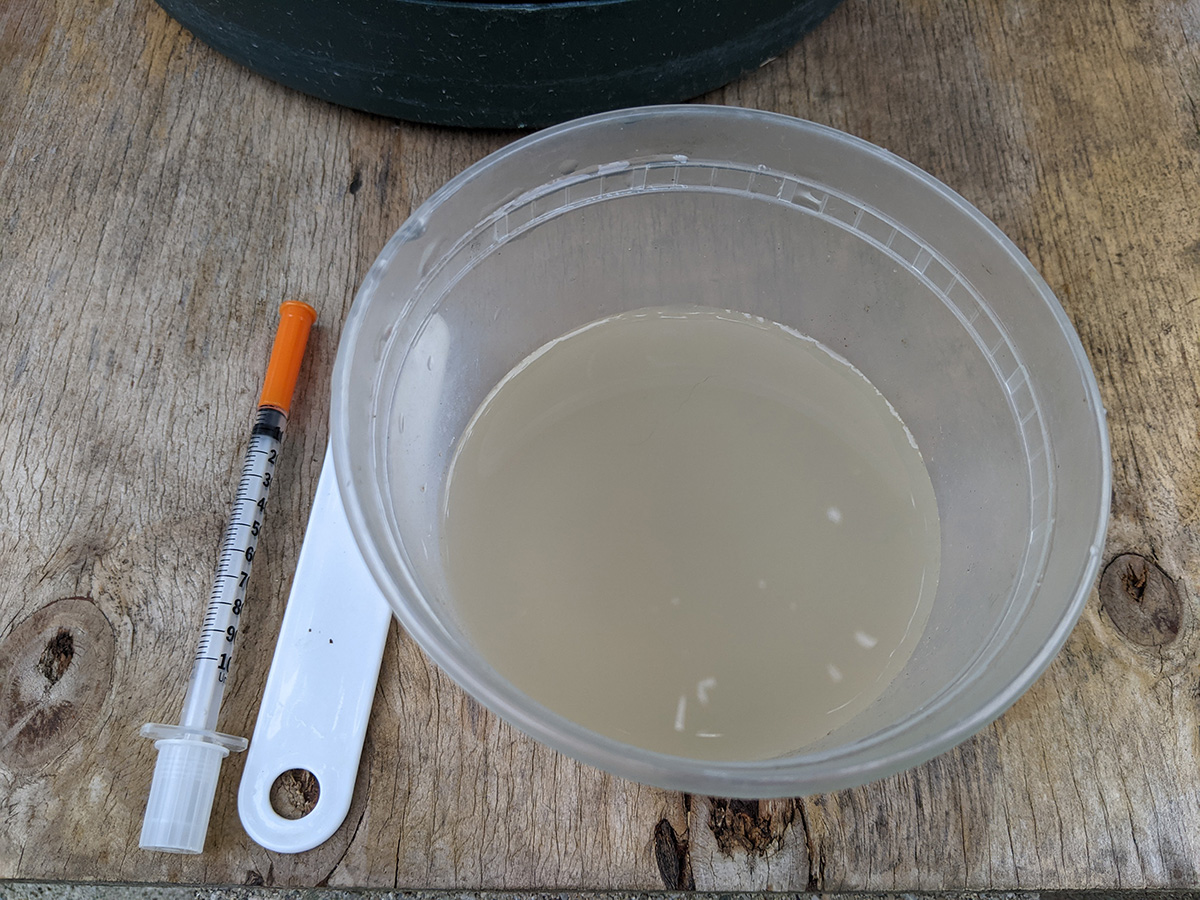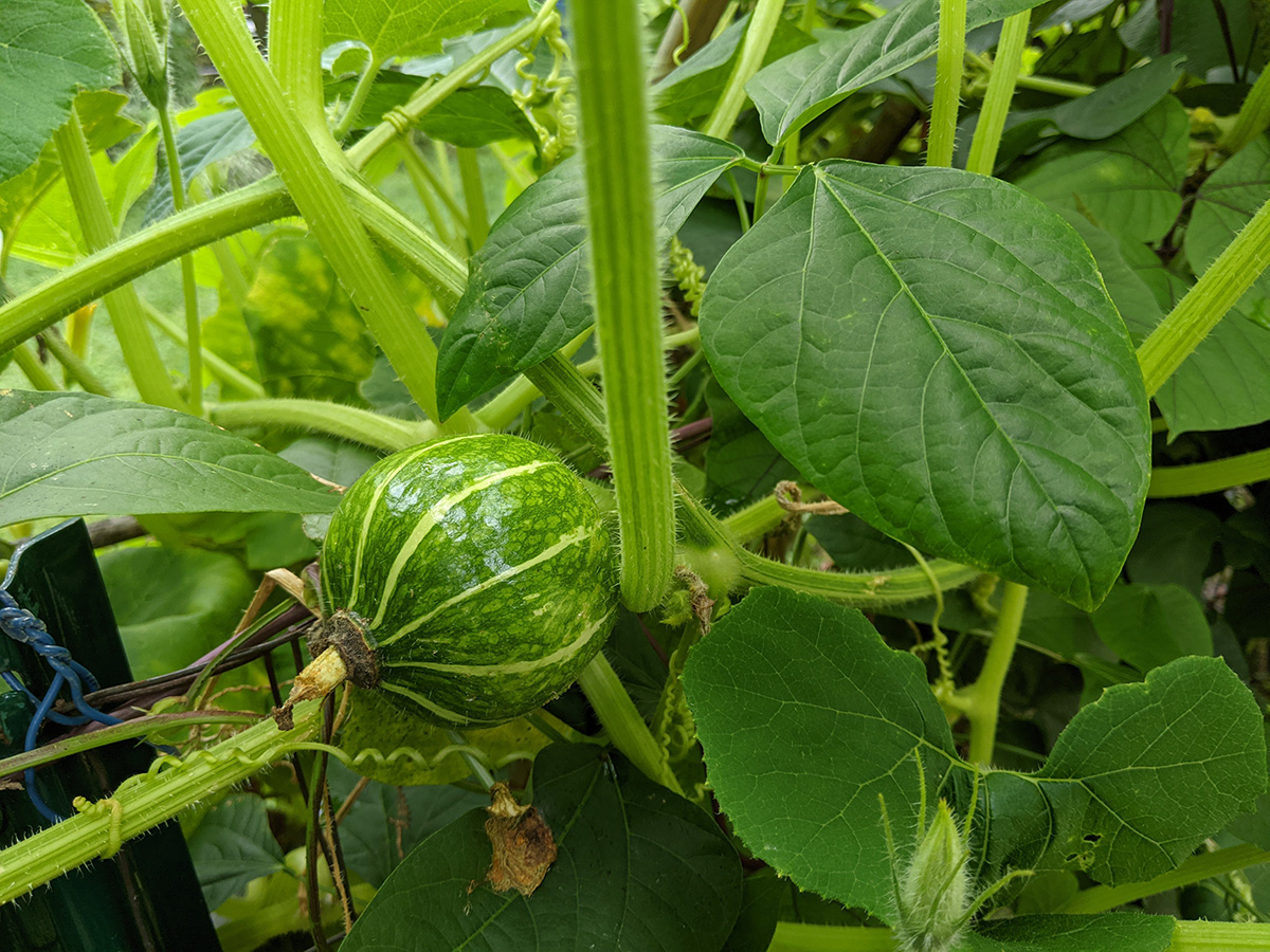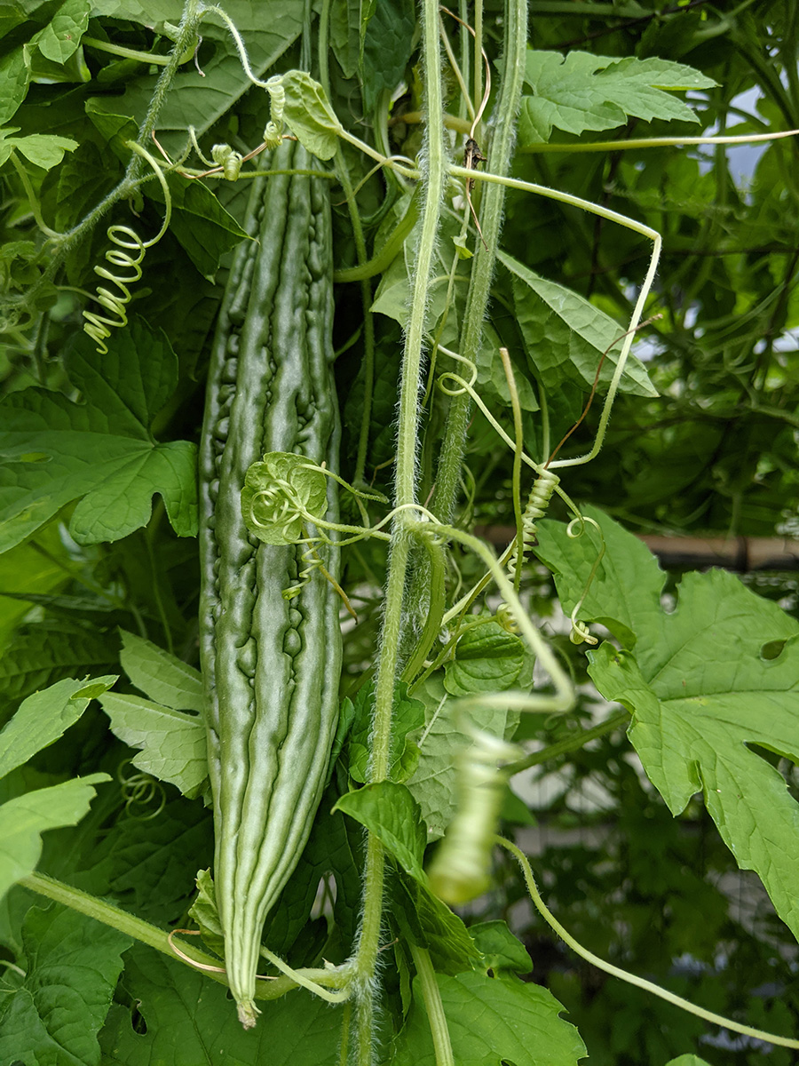 while inspecting the squash vines, i saw a place where it looked like vine borer damage. it just happened to be the one vine that's climbing onto the bitter melon trellis with a medium-size squash. i cleaned up the frass and injected the vine with Btk solution. i wonder if i can just inject the concentrated version? or does diluting it with water activate the bacteria?