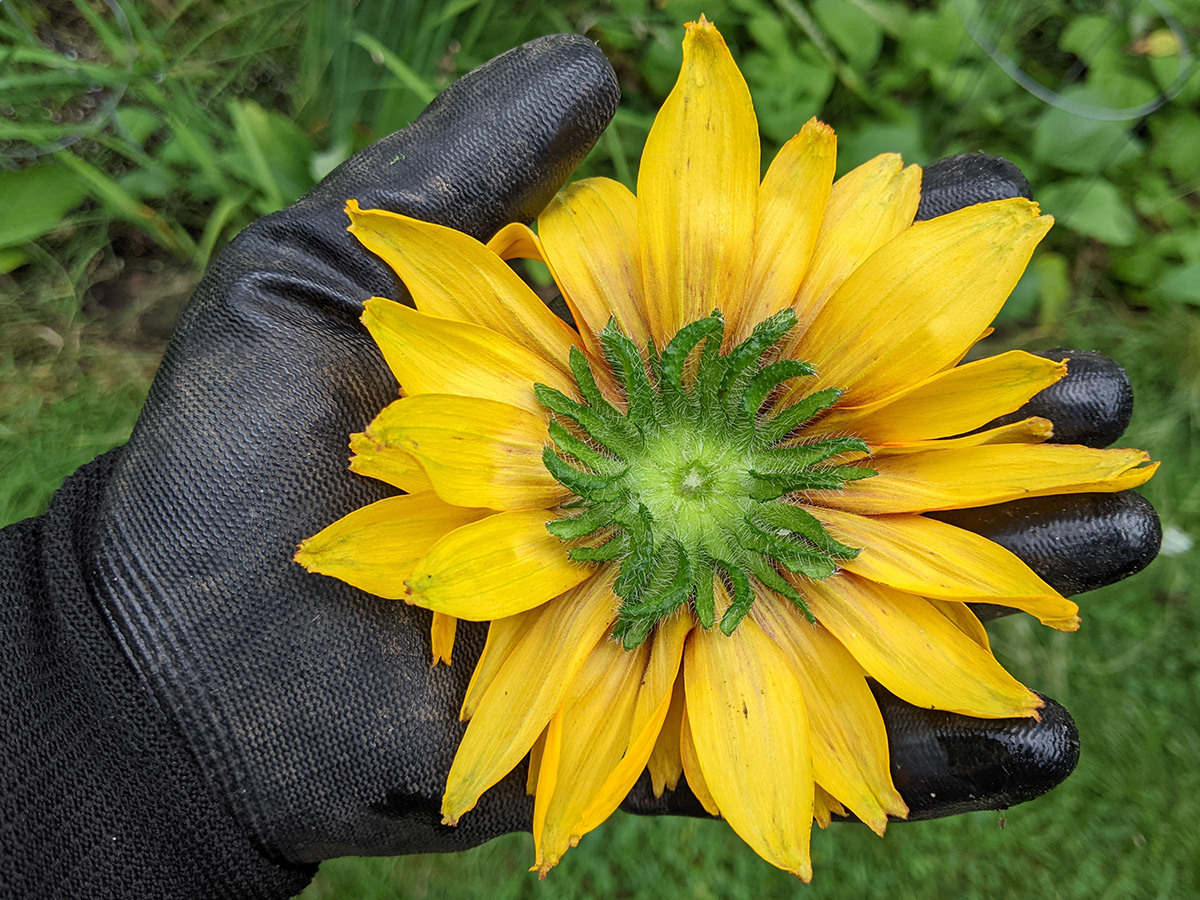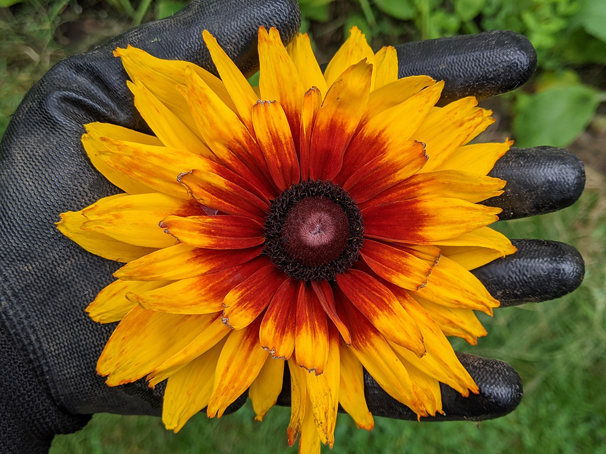 while bundling the rudbeckia flowers in tomato cages so they're not drooping on the ground, i accidentally beheaded one of the flower stalks. it's not until you're holding one of the rudbeckia flowers in your hand to realize just how big they are. the amazing thing is the flowers seem to last a long time. we've had flowers that've been in bloom for weeks that still haven't lost their colors.