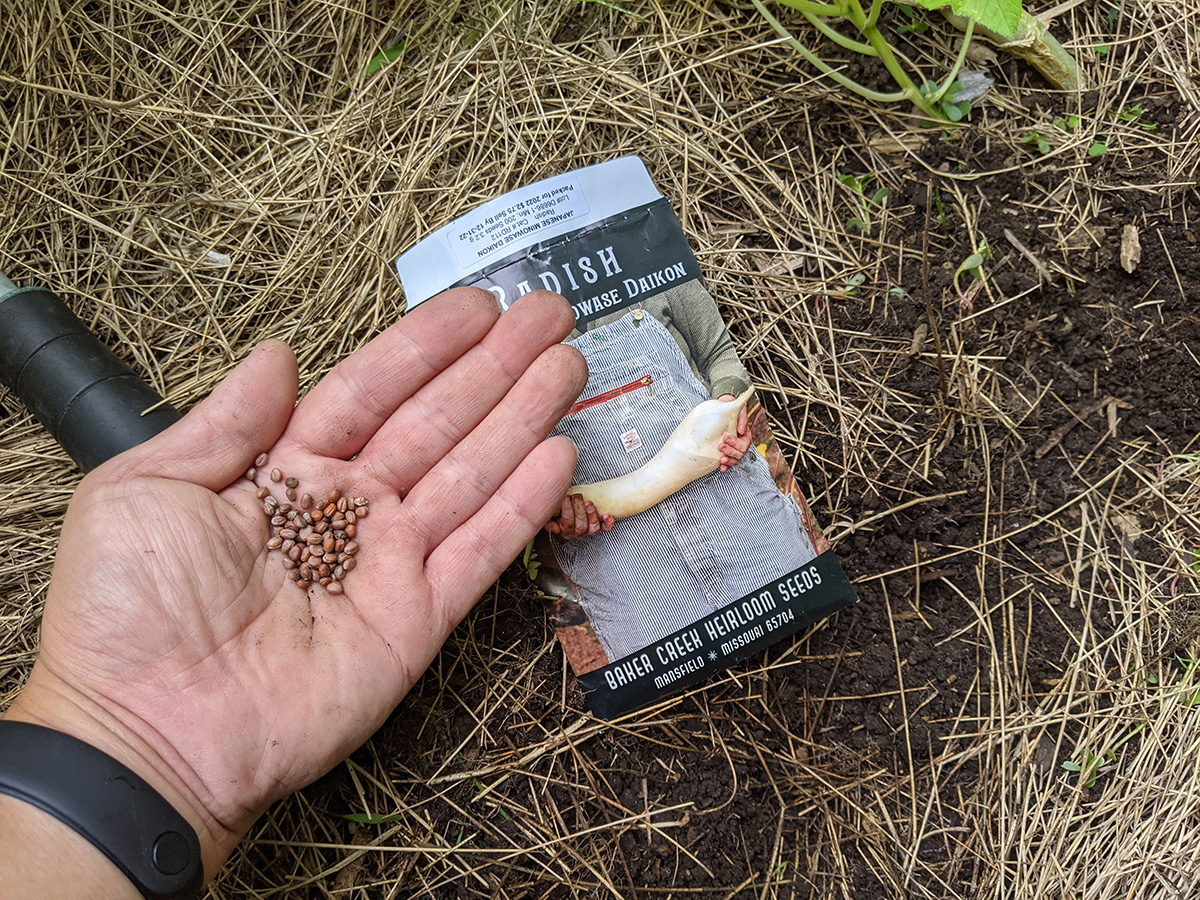 i finally got around to planting some daikon radish seeds in RB2. it was hard work, i could only get into the raised bed from a small opening in the back. i was on my hands and knees the whole time, balancing on a wooden plank so i wouldn't compact the soil, and the all the time mosquitoes are biting my legs and arms.