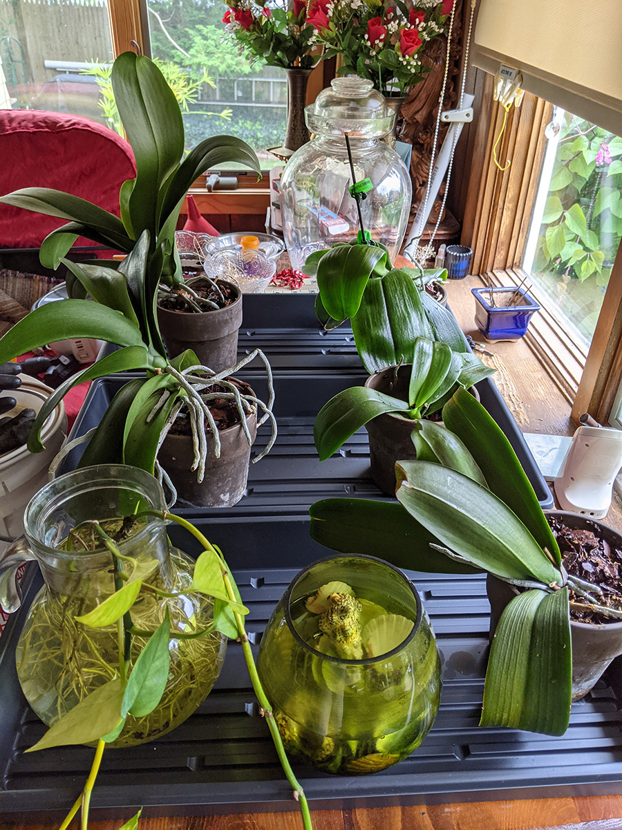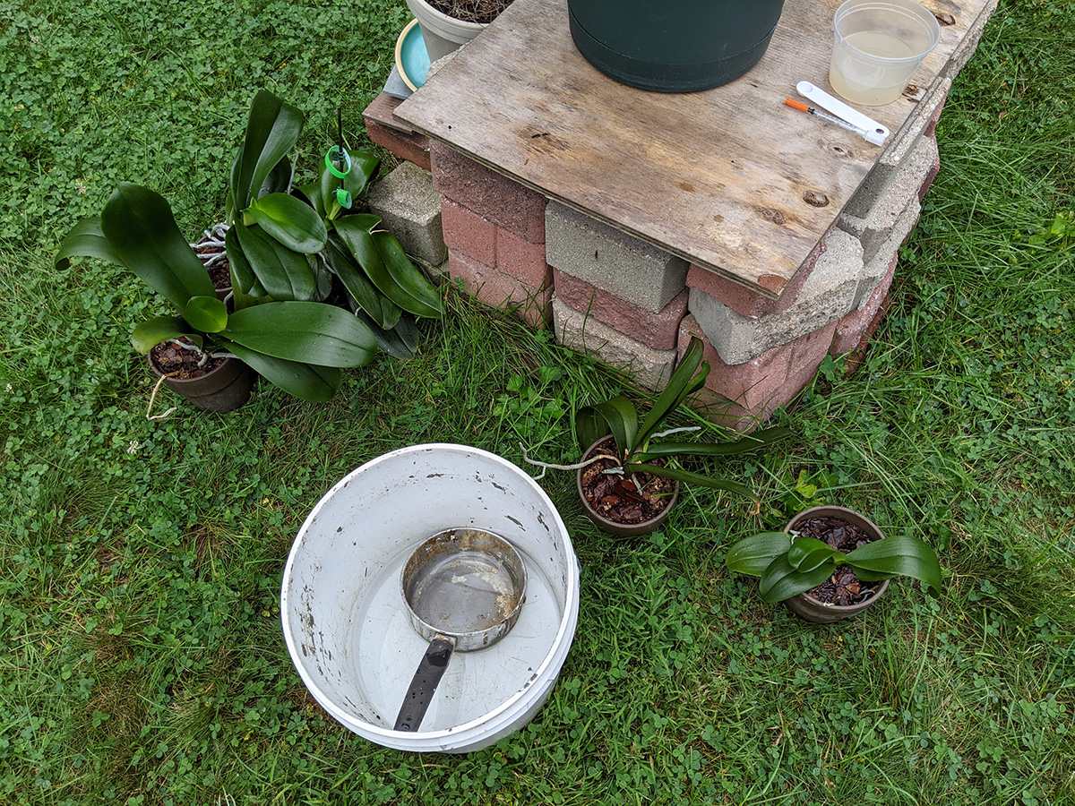 since i was at it, i also brought out all the orchids because earlier i spotted a mealybug, and i sprayed them with neem oil as well. i then watered them with special orchid fertilizer infused water.