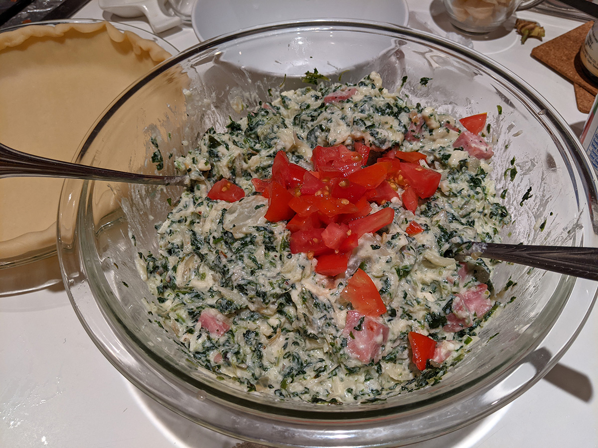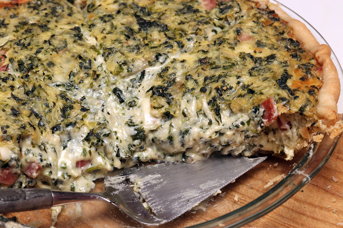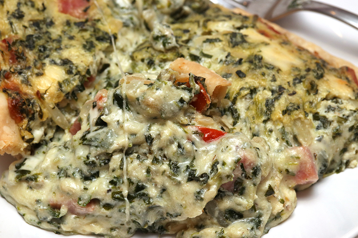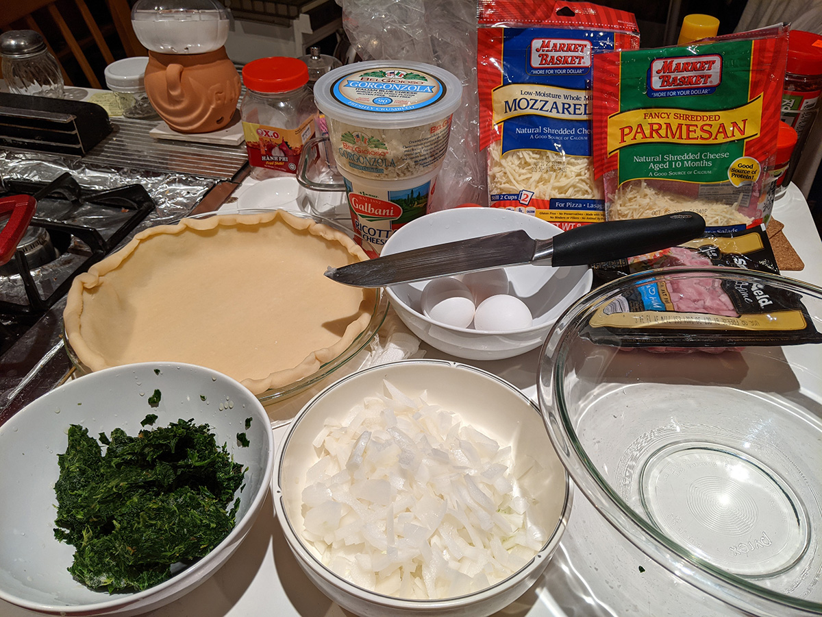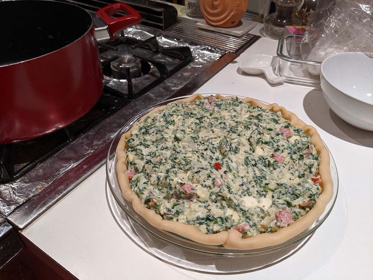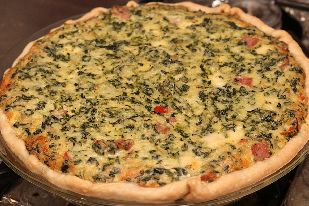 | preheat oven to 350°F. sprinkle flour into pie dish before layering pie crust. sauté chopped onion and ham in butter. add defrosted and drained spinach and cook until dry. mix cheeses with eggs, then add in spinach mixture. pour into pie crust then bake for 40 minutes. let stand for 30 minutes (the longer the better, otherwise quiche will be gooey). | |