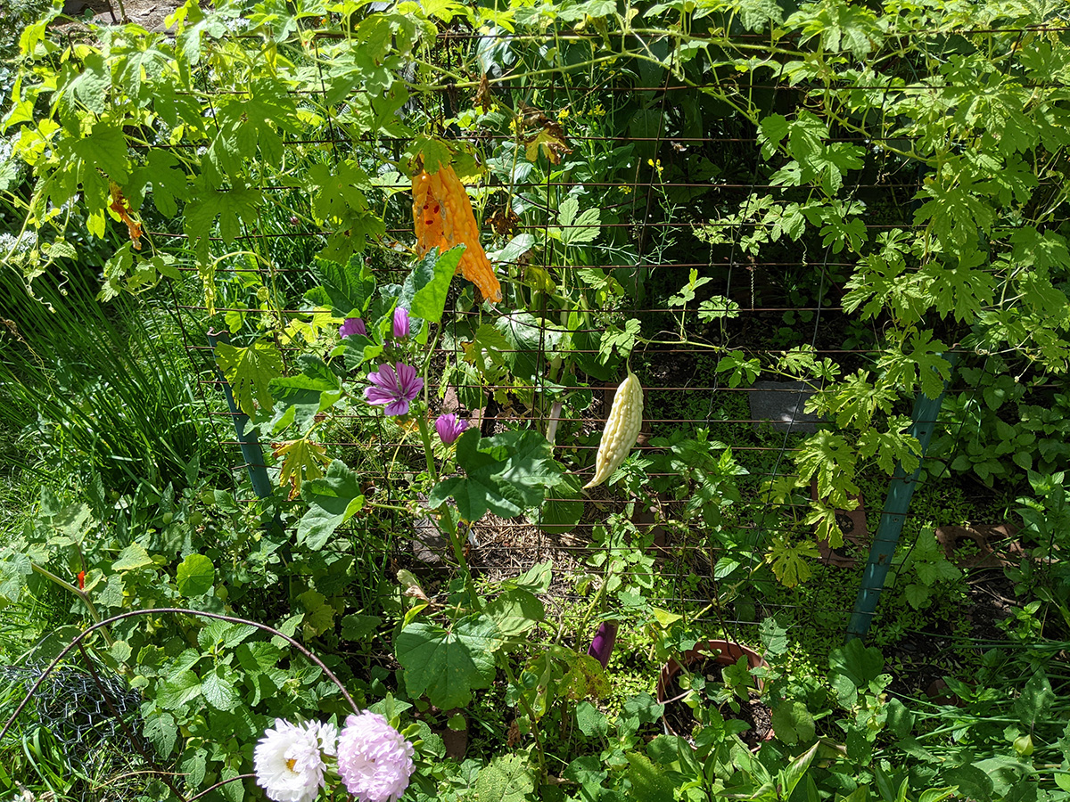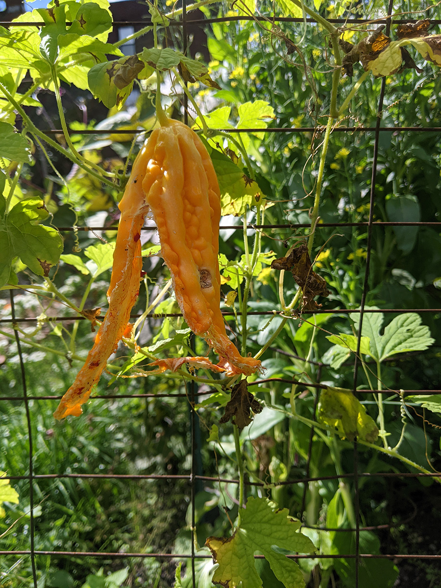 i went to the community garden to check on my bitter melons. the white one had turned orange and split open, all its seeds gone. i found a few in the dirt below, but most of them were gone. did some animal eat them? i should've checked earlier, i haven't been in the garden since saturday. judging from the condition of the bitter melon, it must've split open either sunday or monday. there's another white melon, about half the size, hopefully i can collect some seeds from that one as well. i totally forgot to check if the mantises were still there, i'll do that next time.