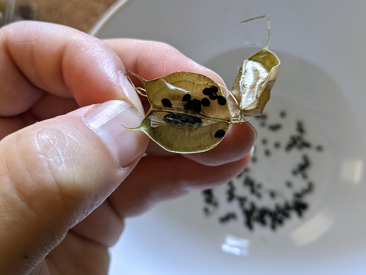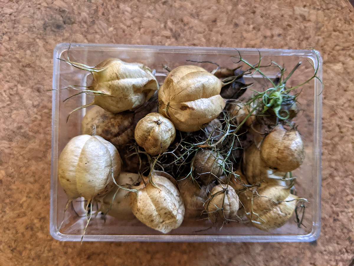 i collected my nigella seeds. i tried using a strainer to make the work easier, but the seeds are just too big. i was also tempted to eat the seeds for some reason. i went online and did a search for "are nigella seeds edible?" i was surprised to find the answer was yes. they're also known as onion seeds, black cumin, or kalongi (hindi). out of curiosity i tried tasting a seed. it was actually surprisingly soft yet crunchy, with a flavor i can't quite identify. if you didn't tell me, i would've guessed they were just black sesame seeds. of course i'm not in the habit of eating these seeds, i'm saving them to plant for next season.