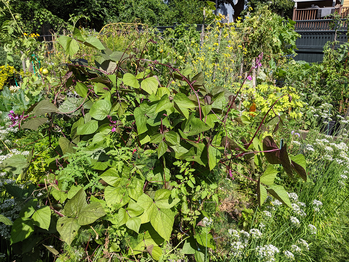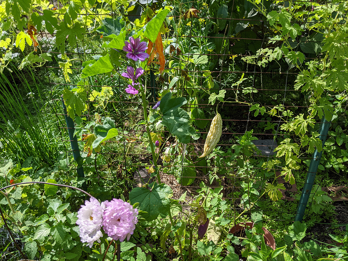 i went out today just once, to the community garden, to check to see if that one last remaining white bitter melon has burst yet. it was in fact still intact. i also checked for the pray mantises but they were both gone. it was a warm and dry day, when i came back to the house i appreciated how cool it was indoors even though it was at 78°F.