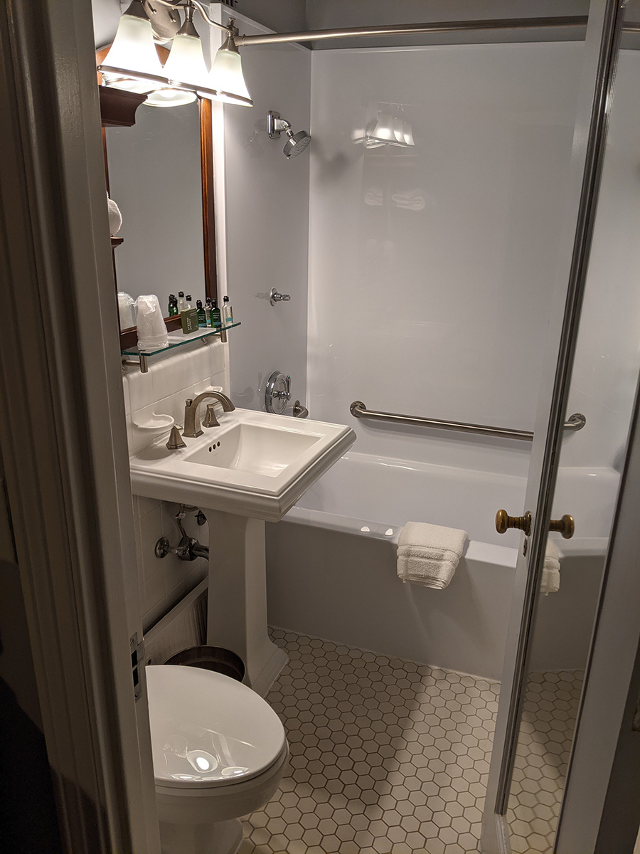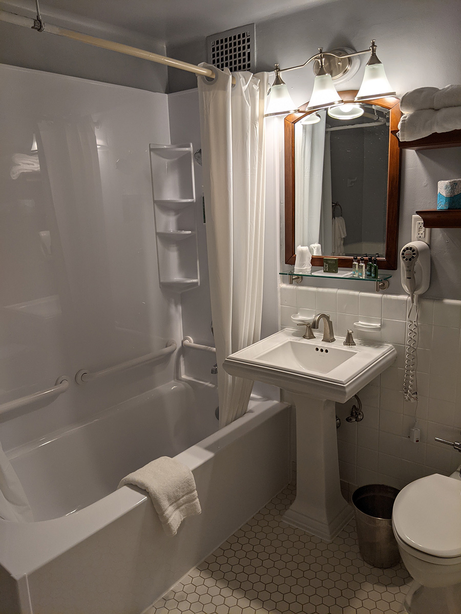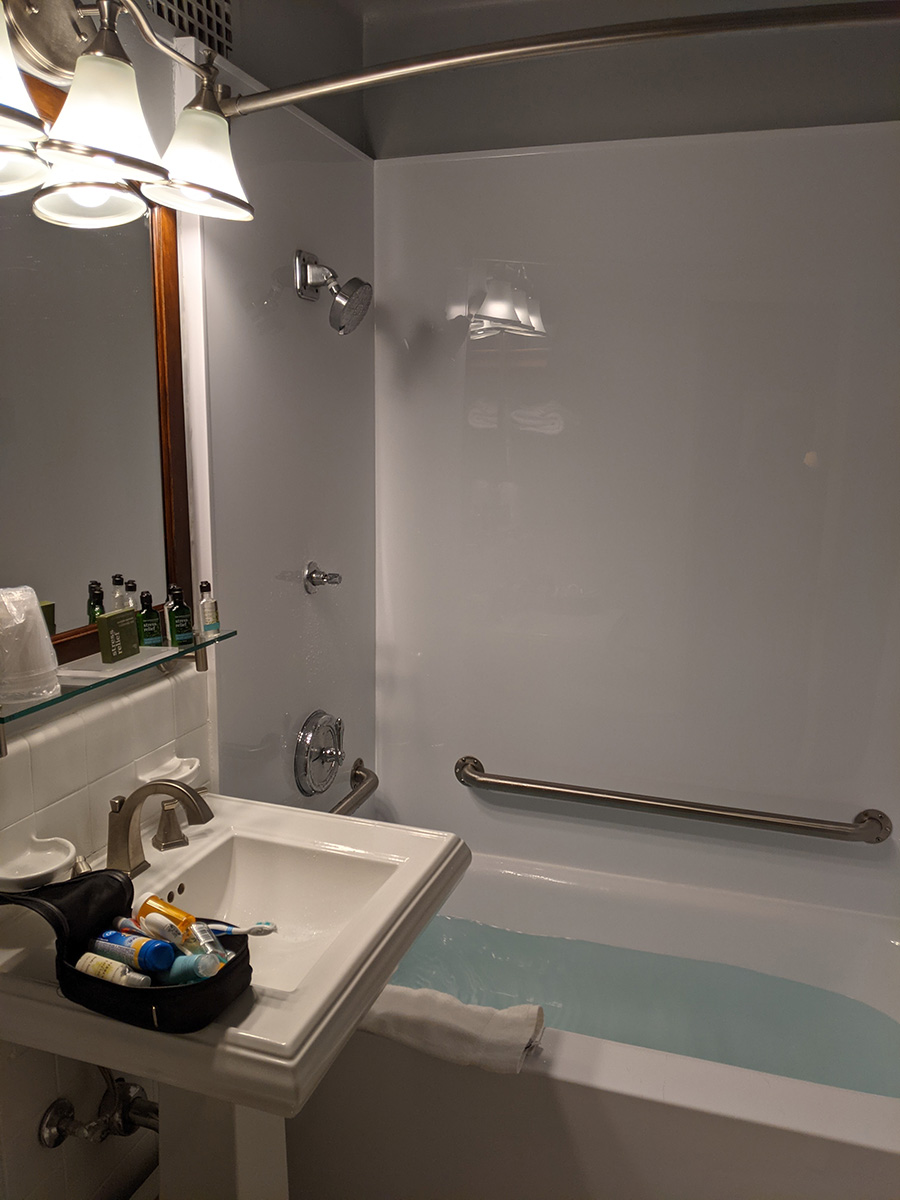 i asked the front desk if breakfast was included with the room. she said no, there was a set meal for $16 (salmon was on tomorrow's menu), and there was also individual breakfast items for sale. by the time i got back to my room, it was 9:30pm. as tradition whenever i stay in a hotel, i took a hot bath. the water was slightly blue - not because of the nearby springs, more likely the result of chlorination treatment. the bathroom was big enough to fit a tub but was otherwise small; sitting on the toilet, my knees would hit the open door.