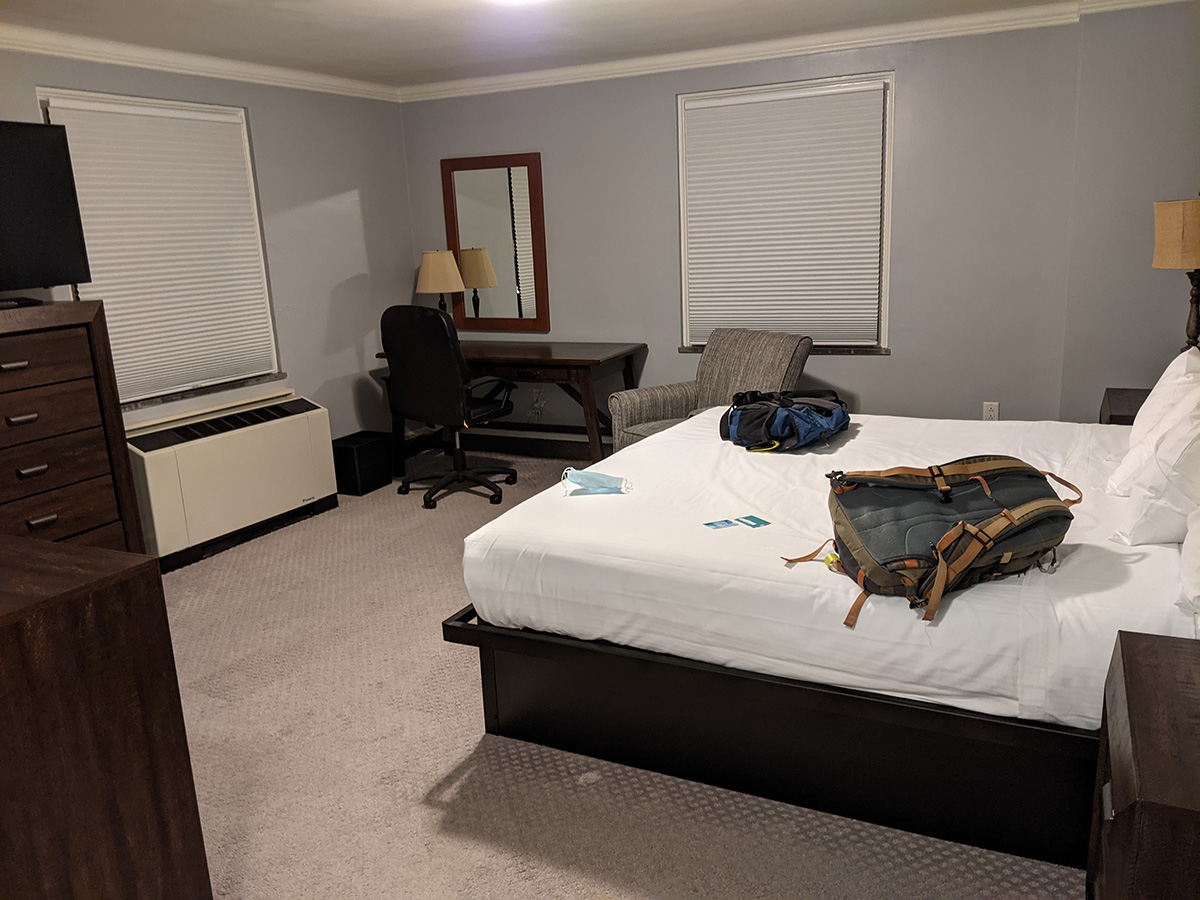 following google maps directions, i arrived at the hotel 19 minutes later by 8:45pm. it was weird driving through a state park ("avenue of pines") then finally coming across a hotel in the middle of it. too bad it was so dark, i couldn't really see anything. if i wake up early enough tomorrow, i could walk around a bit, but i had a feeling i'd probably be asleep. i checked in without my bags (in case i had the wrong place), then went back outside to get them. i wore a mask the whole time, i was probably the only guest wearing one, all the others with masks were hotel employees. there'd been an antique car show earlier, that's why section of the parking lot was cordoned off.