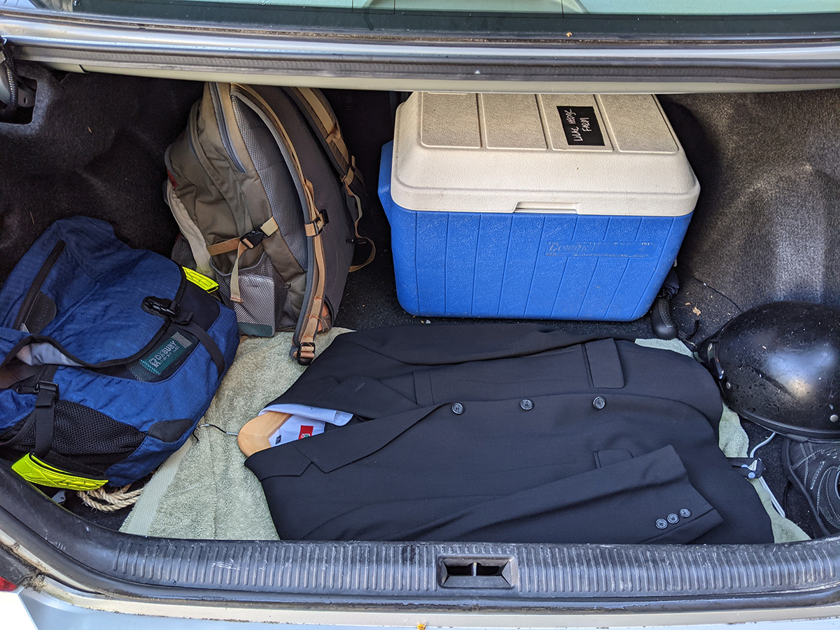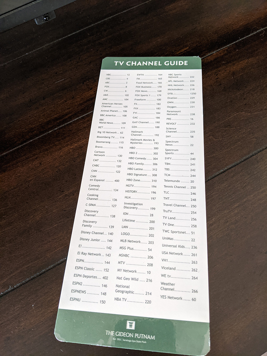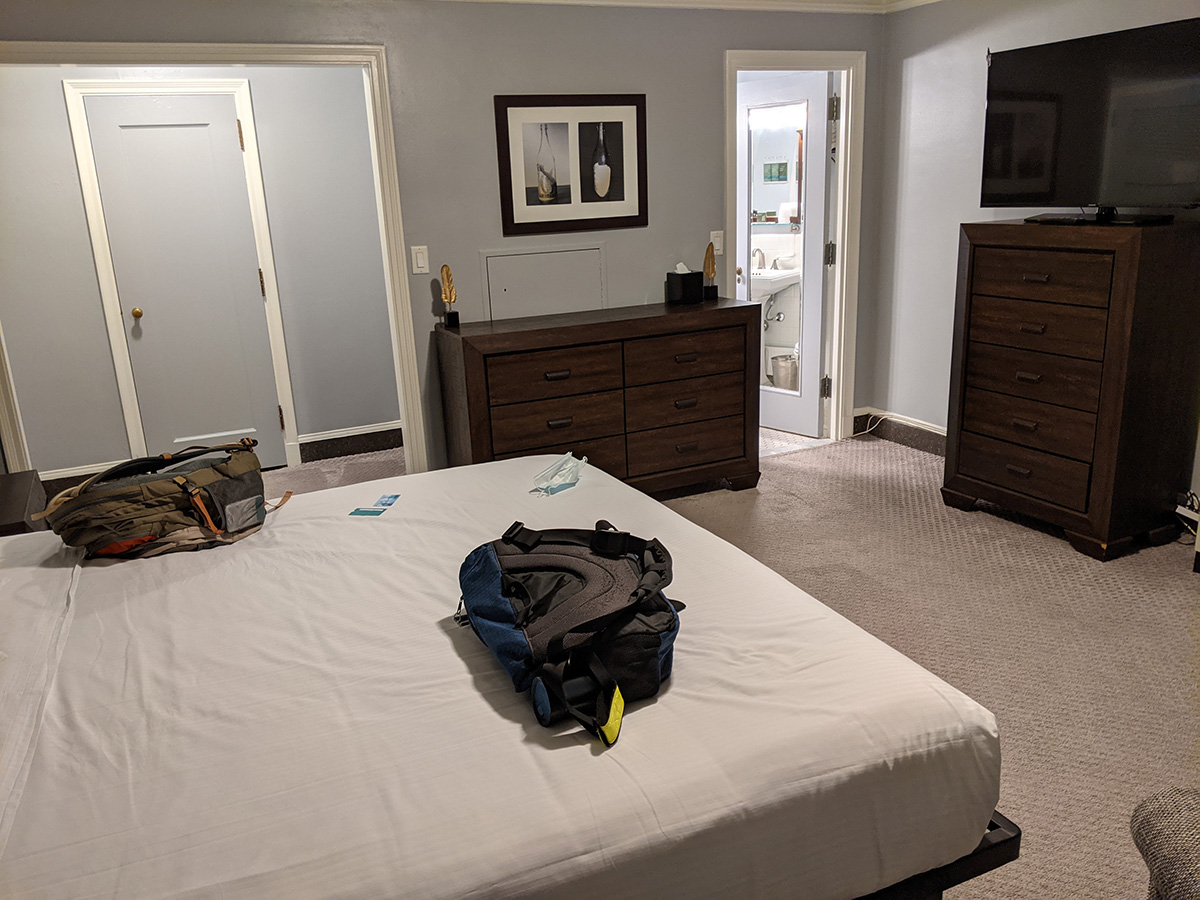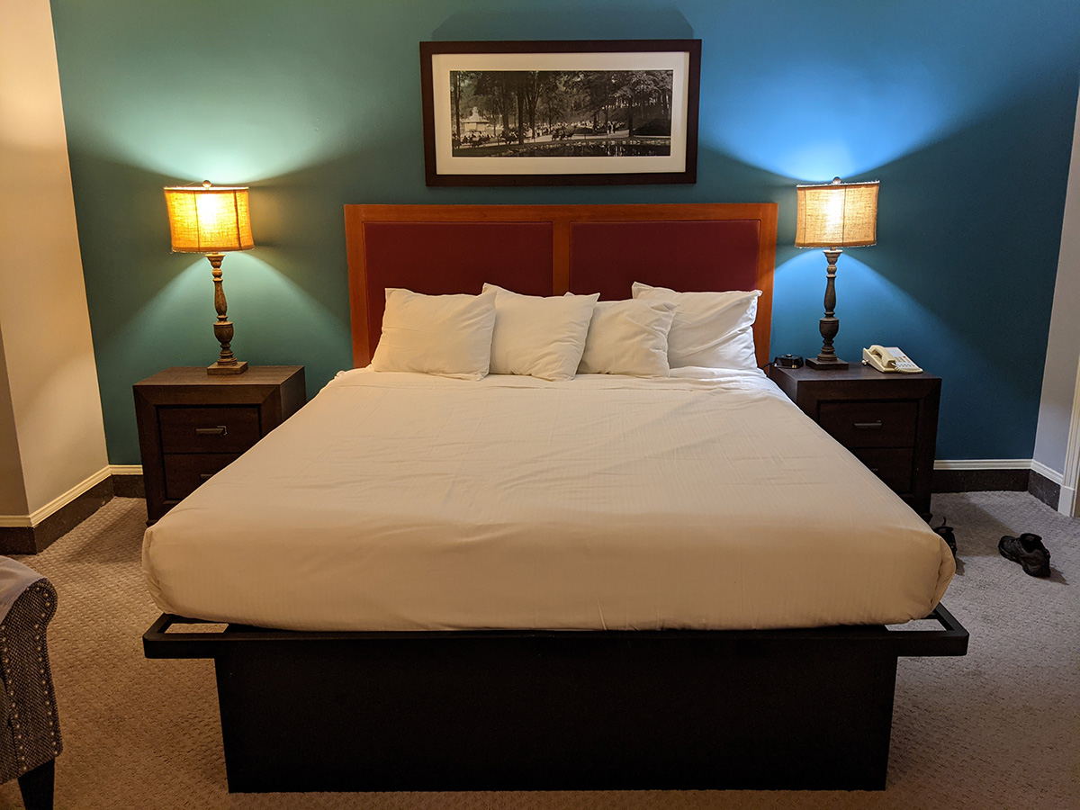the bedroom itself was adequate, located on the inner corner of the hotel building. i could even see into the window of a neighboring room, which was a little weird (i closed the blinds). there was a large king size bed. driving up to saratoga springs, i realized i'd left my macbook pro charging cord at home. rummaging through my bags, i also discovered i left my phone charger as well. however, i did bring my portable battery pack, so i could still charge my phone that way. unfortunately i seemed to have lost my usb-c cord, the same cord i used to charge the phone from the car while i was driving. i put on my shoes and went back out looking for the cord. luckily it was in the trunk, i must've dropped it while taking out my suit.