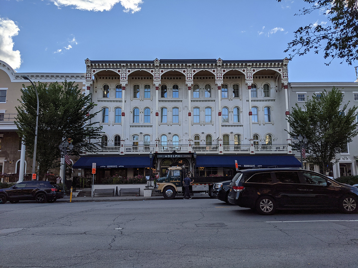 downtown saratoga springs was pretty happening, a lot of shops and restaurants and people. we were the few who wore masks while most folks were maskless. john bought his shirt at a jos a. bank shop. afterwards we wandered around to find the CVS to look for black face masks for tomorrow. john told me last summer they rented a house in saratoga springs just to get out of the city. his parents saw their grand kids everyday, and they got to know saratoga springs, enough such that john said he'd definitely move here if he could. they didn't have black face masks at CVS, so he got a few dark-colored cloth masks. after that we were about go go back to the car when i reminded me to get something healthy for deanna, so we went to putnam market to pick up a salad.