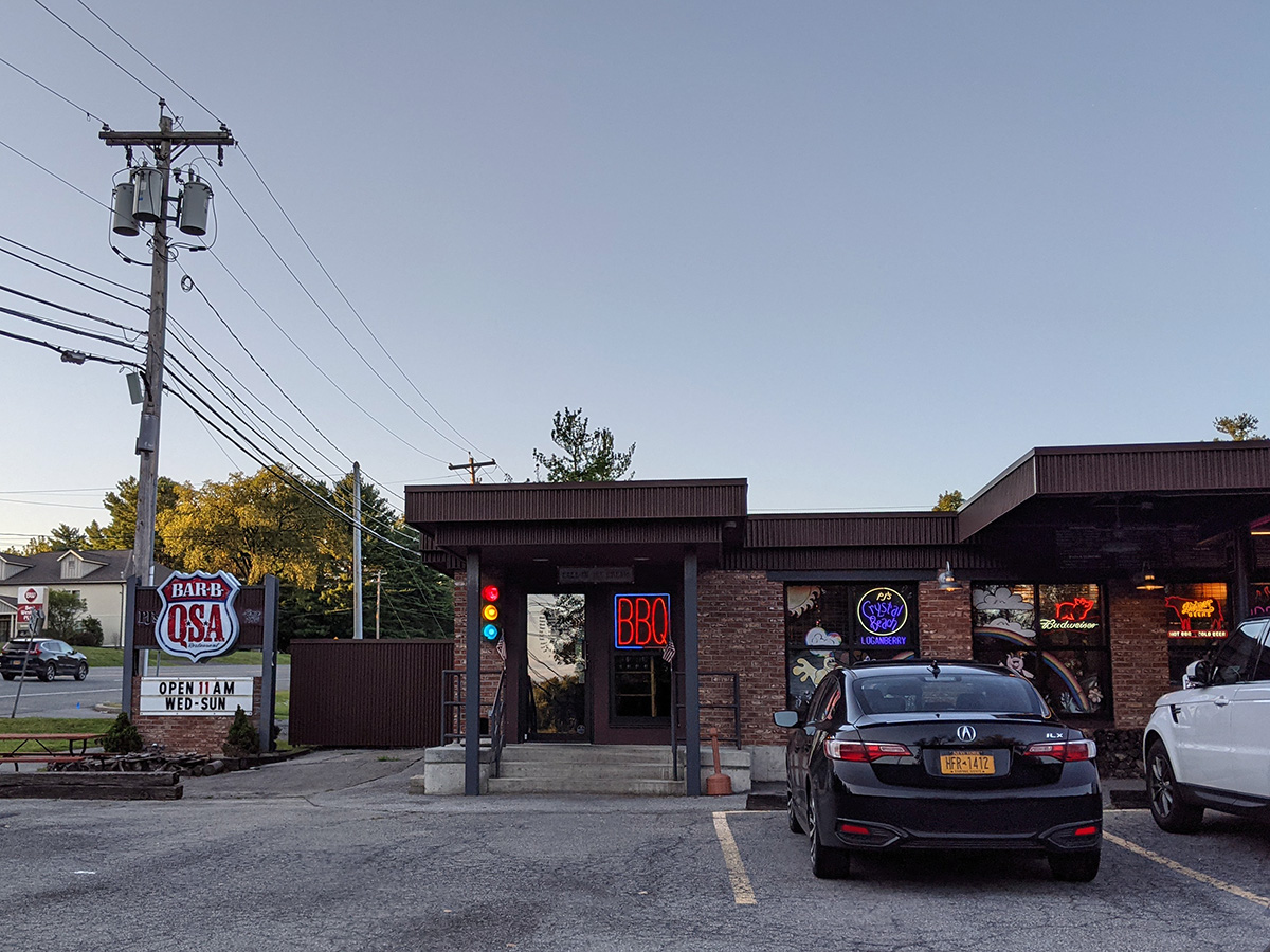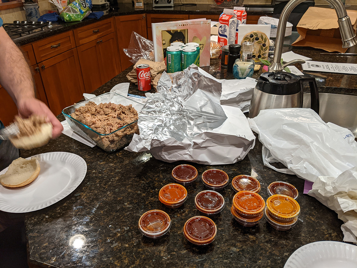we then drove to PJ's bar-b-qsa to pick up our order which we made earlier. the place was very busy, and it took us a while to figure out what the name meant (QSA like USA). this was actually one of john's mother's favorite eating spots. while john was picking up, i was busy collecting various barbecue sauces in the little plastic cups. we stopped at a stewart's along the way to pick up some hamburger buns. i also grabbed a root beer. the cashier actually checked both our id's (because john bought some beer), which was a surprise. only later did i discover that the stewart's in upper new york is not the same stewart's restaurant in new jersey, even though the logos look nearly identical.
