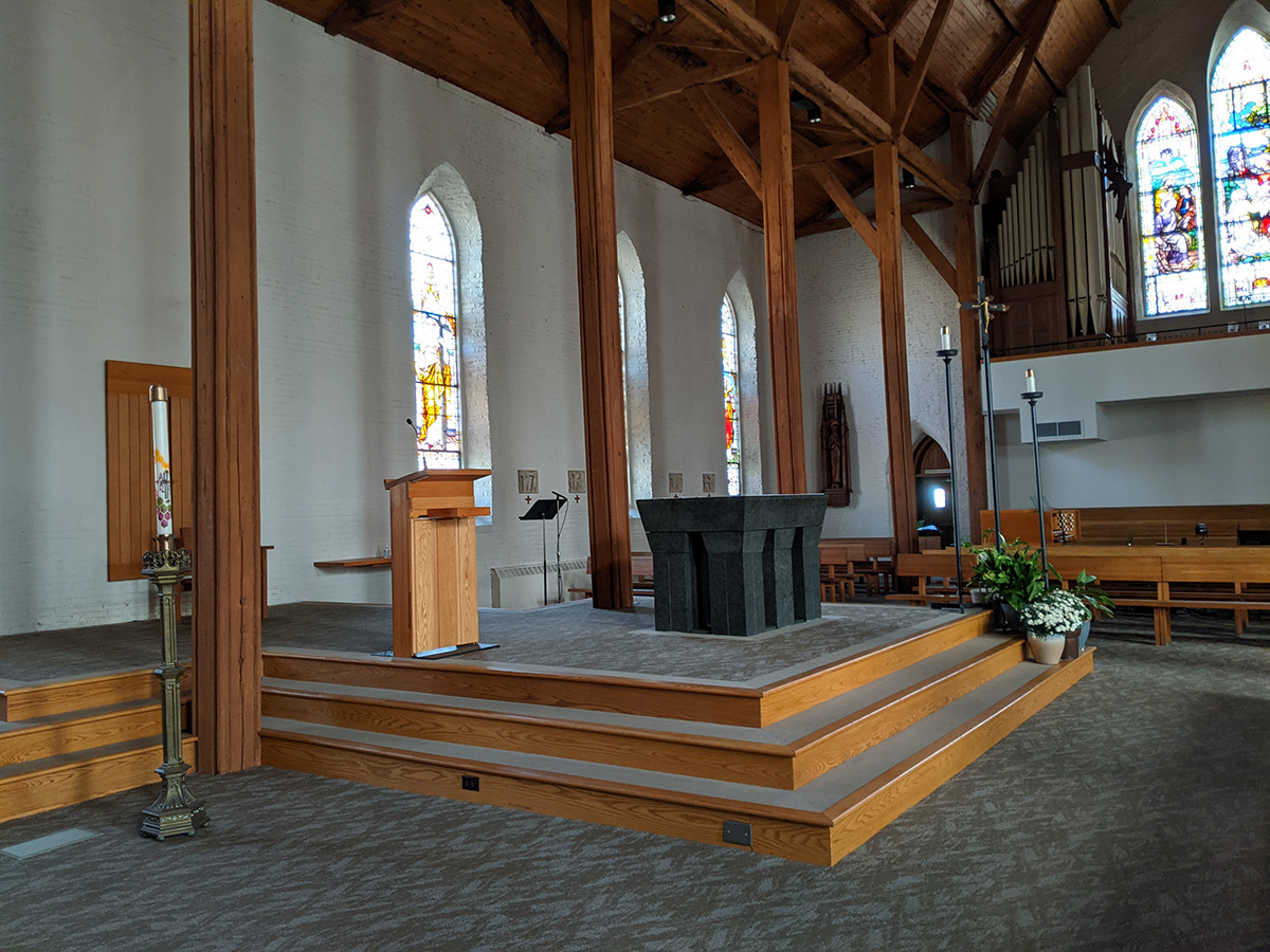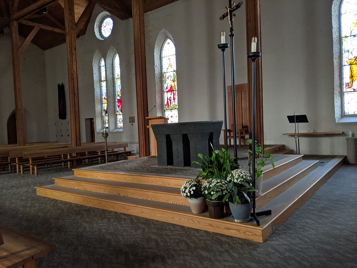 we left for the church of saint peters at 2:49pm. the church is significant because john's mother went to catholic school here. john's father got in touch with the rectory who was willing to let us go inside the church briefly so we can do a test run of the livestream setup. we were running a little late, compounded by the fact that for some reason the automatic garage door was manually locked. it took us 17 minutes to drive there, we got there a bit after 3pm, when we were supposed to get there by 2:45pm. the rectory came out to let us inside the church. we all wore masks while we were inside the church. john's father told me the church had been renovated, moving the altar from one end of the church (the typical layout) to the center, for a more modern arrangement.