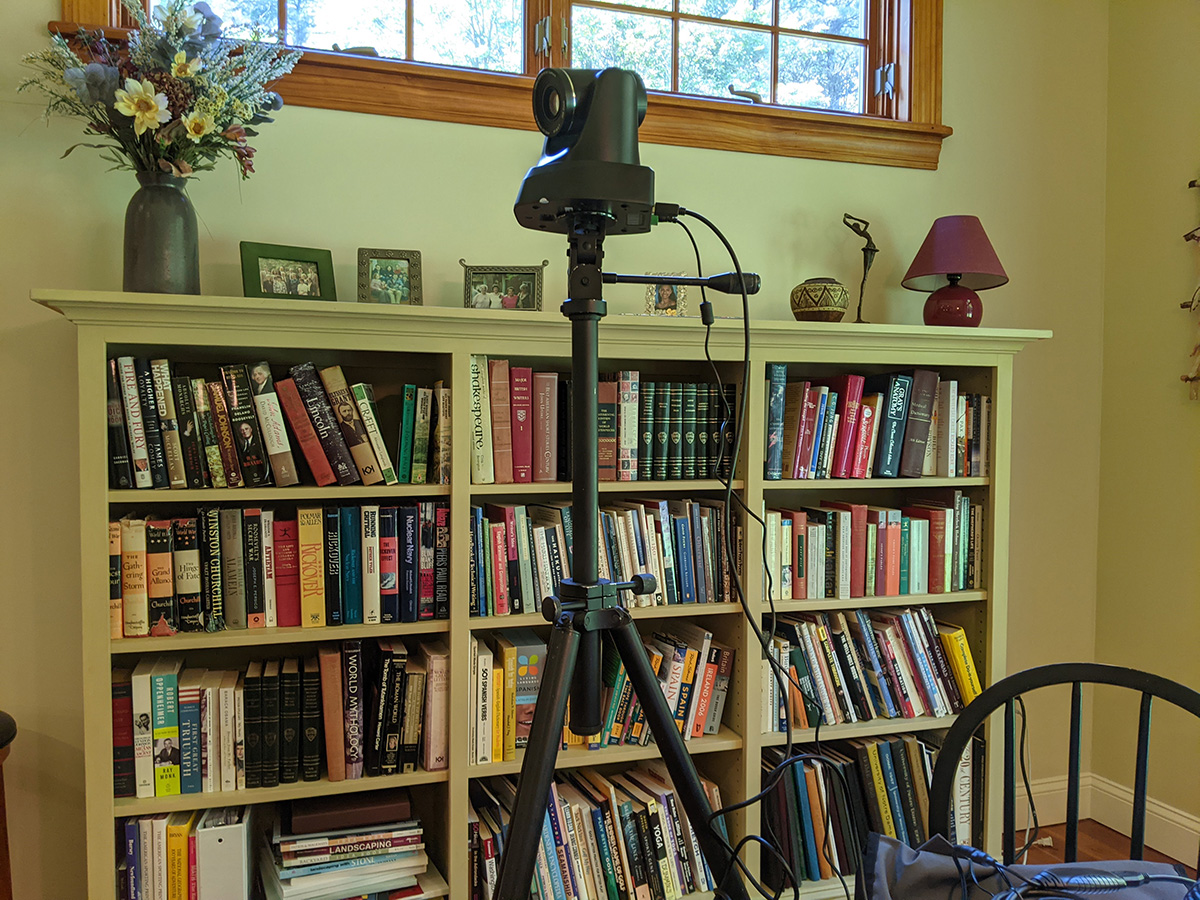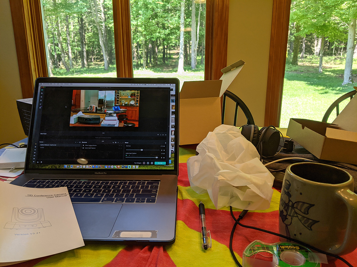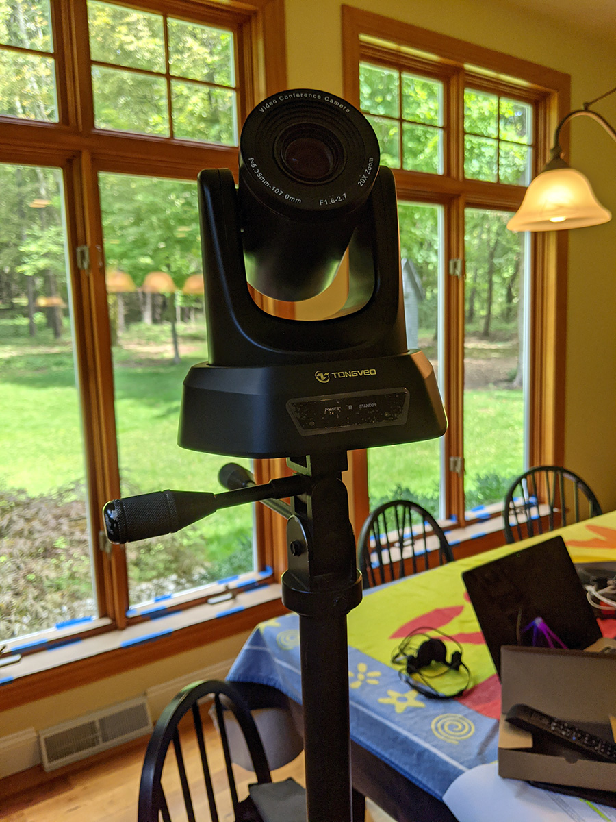 we went inside the house. john's father was in the study, busy sending out e-mails to friends and families to let them know the address for the livestream broadcast of the funeral service. he apologized for being in his pajamas. john showed me the livestream setup: a tongveo 20x optical zoom PTZ camera ($420) mounted on a sturdy industrial metal tripod, connected to his laptop, using an app called OBS studio to stream to youtube live. it was actually his son will who gave him the idea to do it on youtube live (i suggested zoom, but youtube is definitely the better option, no login required, just an URL). i never used a 20x optical zoom PTZ camera before, the quality was surprisingly good (up to 1080p HD). the camera itself looked like a tabletop astronomy telescope. it also had 9 presets (controlled through a remote), which is key for what we're doing, essentially like having 9 different cameras. the camera didn't does have a mic, so in order to record the audio, we used an external zoom H1n microphone. john had an older H1 which he couldn't find so ended up buying a new one. everything was connected to the macbook via 30ft powered USB extended cords. we did a test livestream, i was able to stream it on my phone just fine.