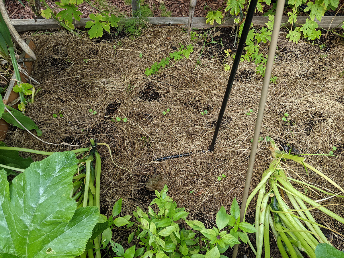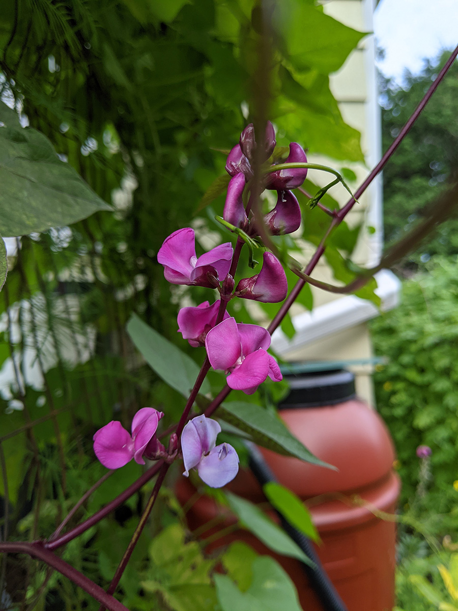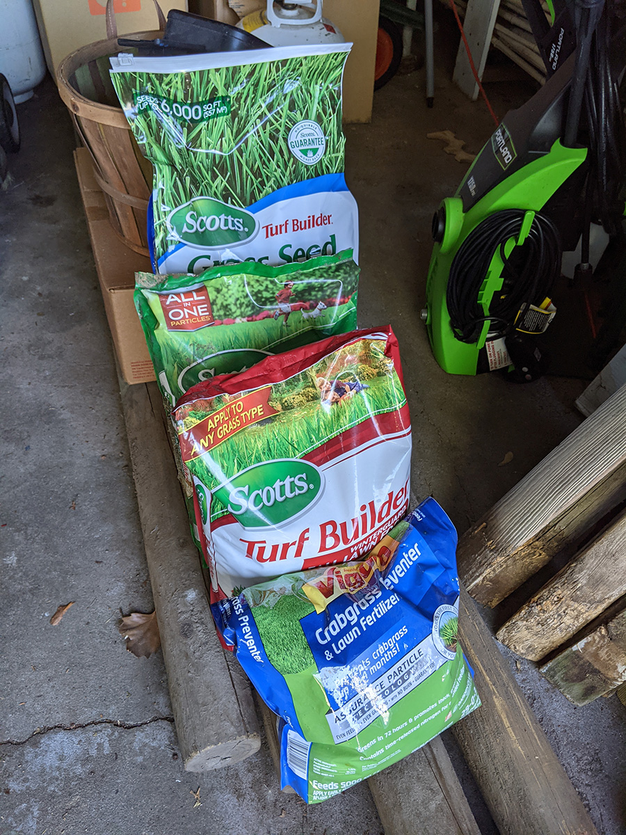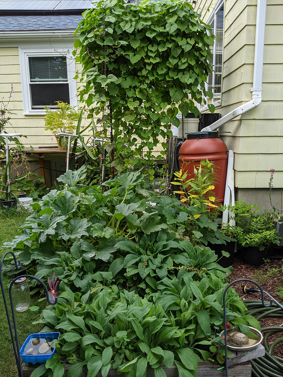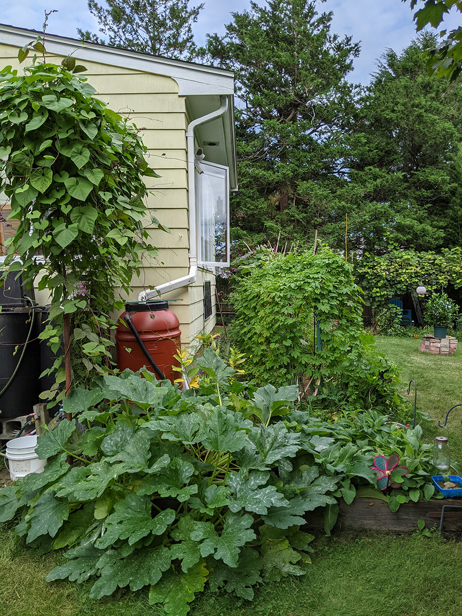 we're expecting some rainstorms tomorrow night, so i didn't have to worry about conserving any rain barrel water as i watered the backyard, including reseeded grass patches and garden beds. i wanted to water the front yard as well but i knew if i left the backyard hailey would start barking again so i didn't.