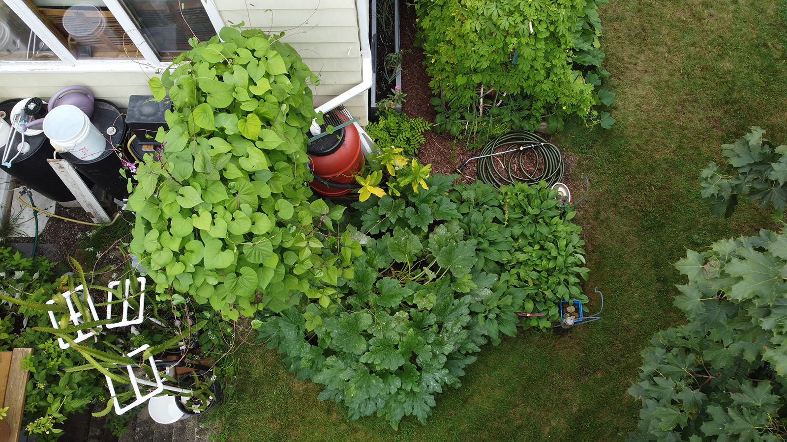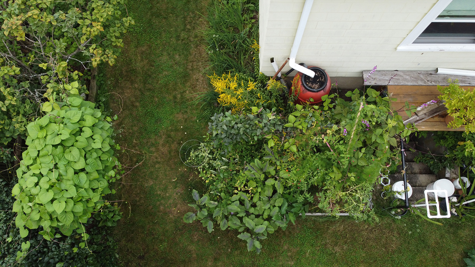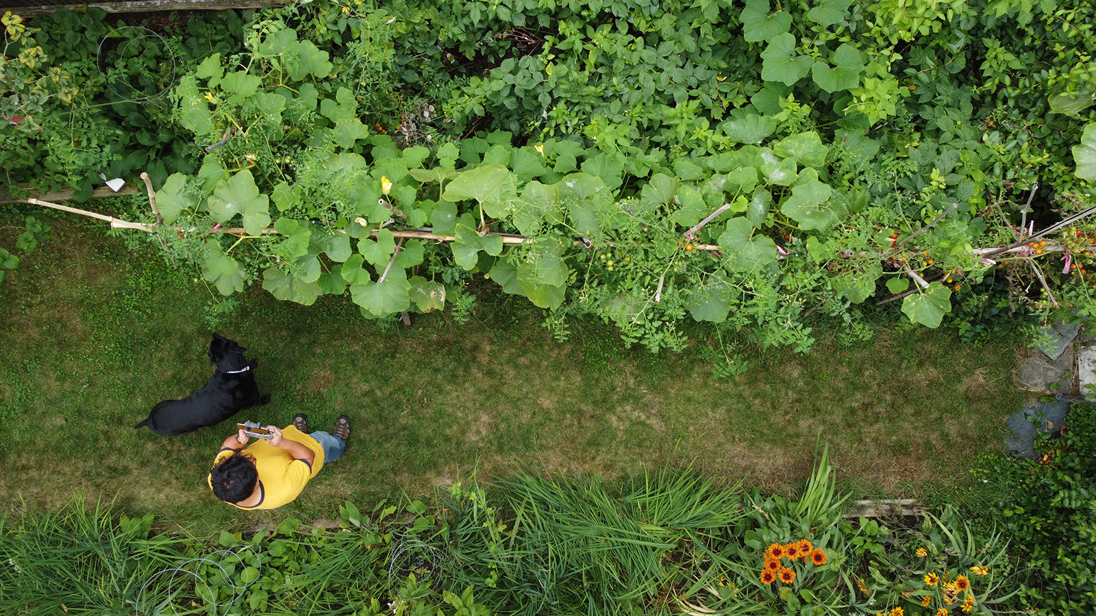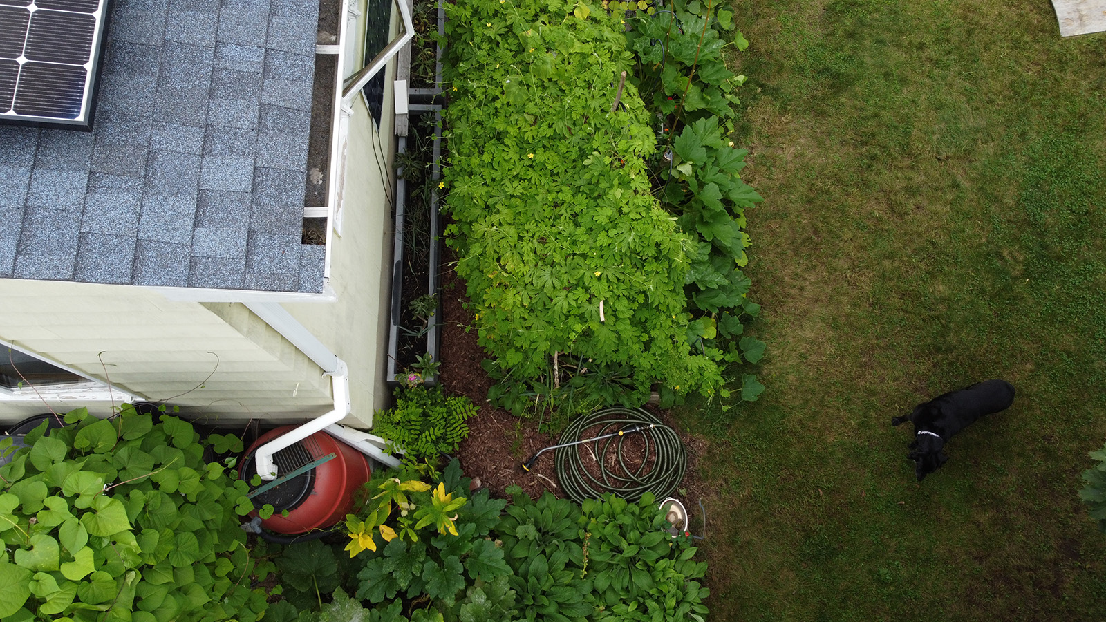 i was finished by 3:30pm so decided to do some drone flying to get some photos of the garden from above. using my mother's old samsung S9+ i didn't experience any problems. the compass might need to be recalibrated though, it had my location set incorrectly, but that's an easy fix to make. the only problem i had was when i tried to land: hailey kept wanting to chase after the drone. i tried to grab ahold of her with one hand while trying to land with the other. i ended up trapping her between my legs as i quickly landed the drone. it was already giving me the low battery beeping warning.