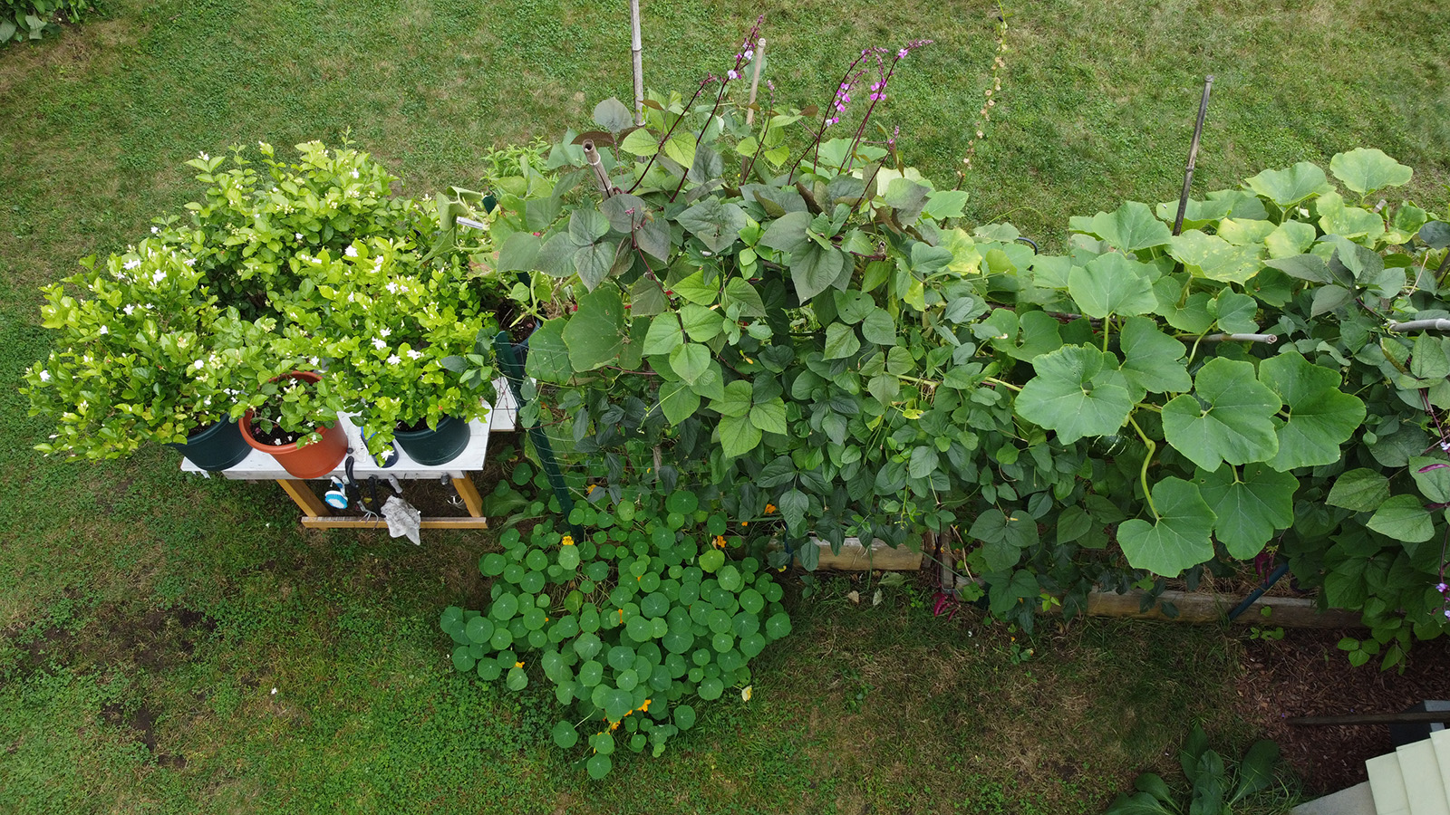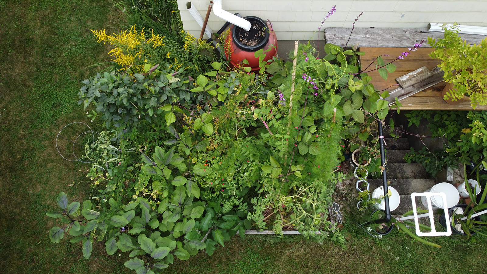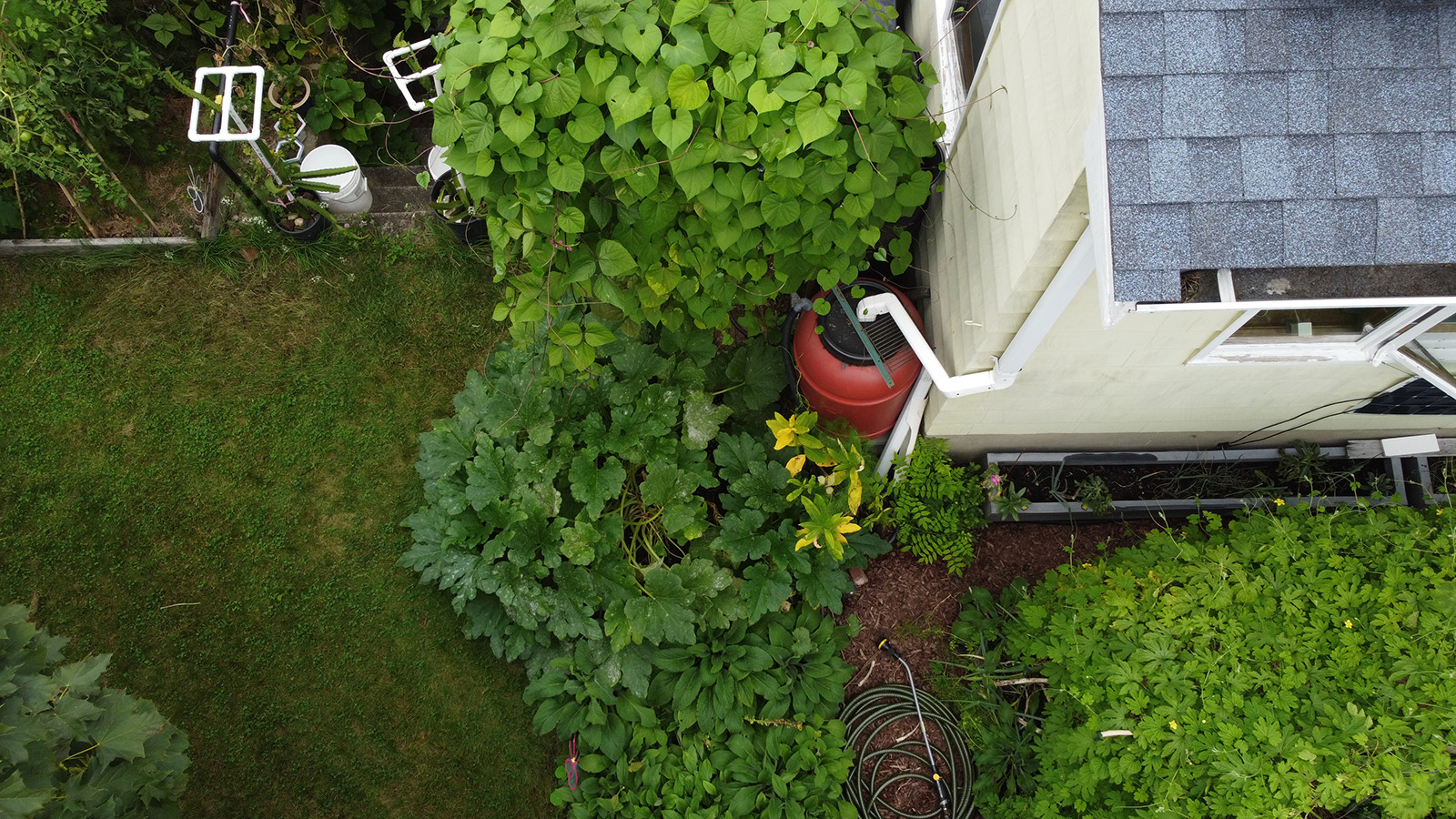 i was finished by 3:30pm so decided to do some drone flying to get some photos of the garden from above. using my mother's old samsung S9+ i didn't experience any problems. the compass might need to be recalibrated though, it had my location set incorrectly, but that's an easy fix to make. the only problem i had was when i tried to land: hailey kept wanting to chase after the drone. i tried to grab ahold of her with one hand while trying to land with the other. i ended up trapping her between my legs as i quickly landed the drone. it was already giving me the low battery beeping warning.