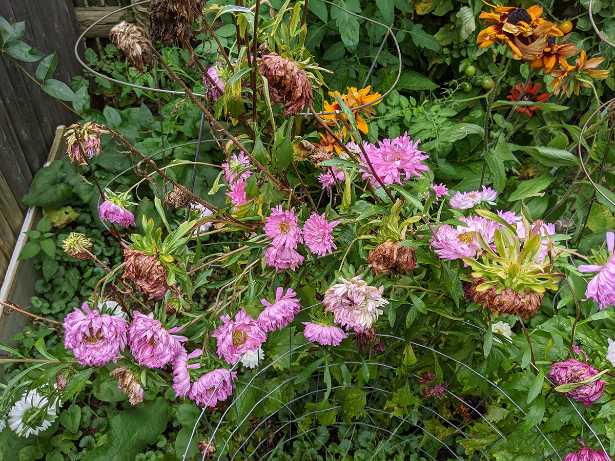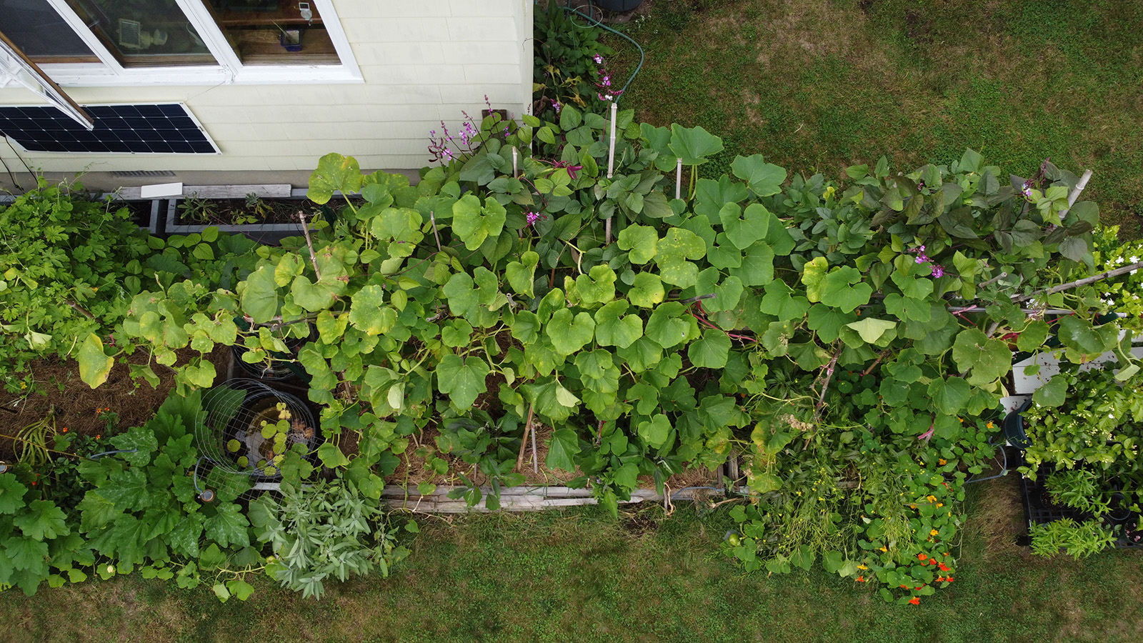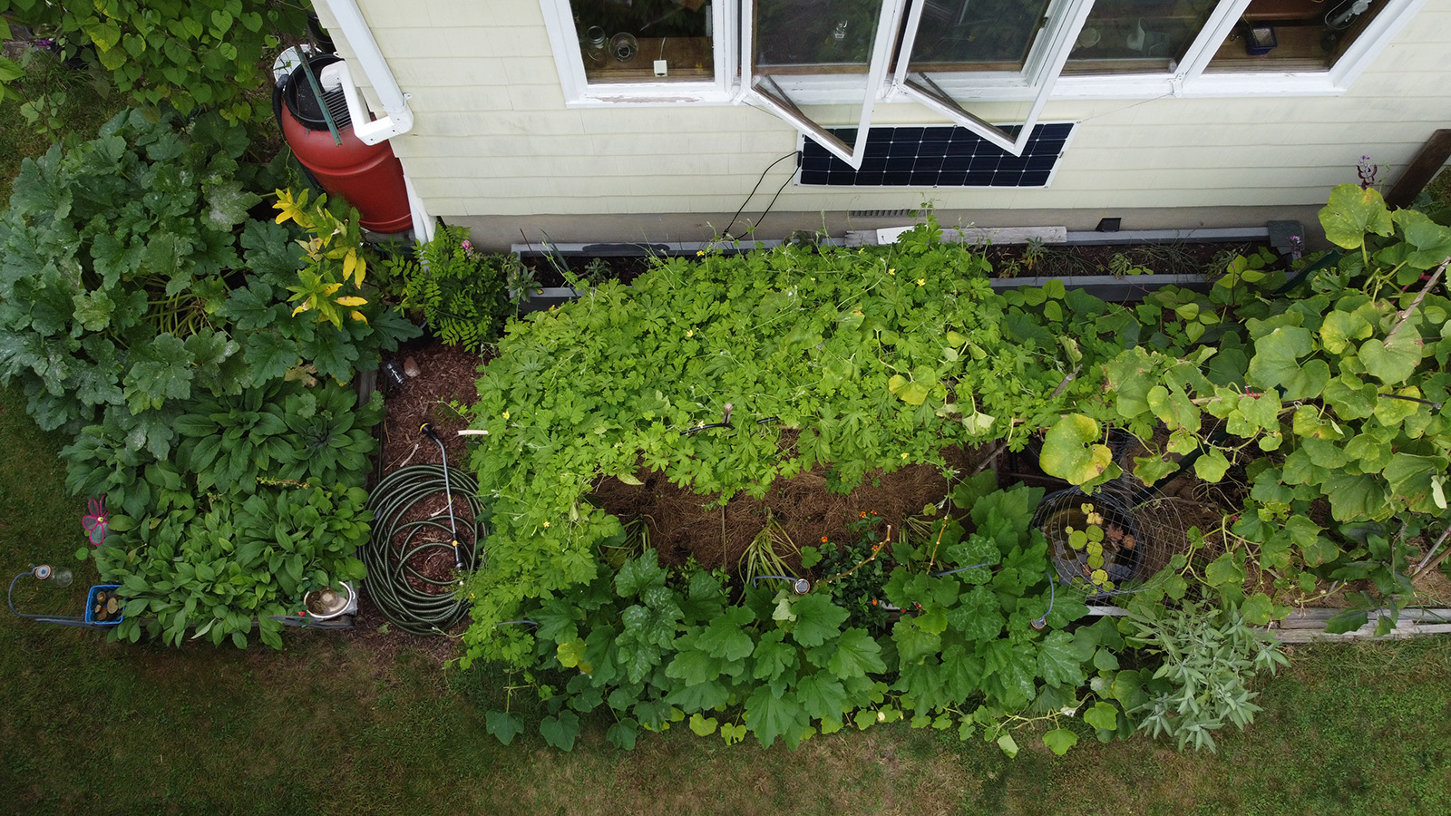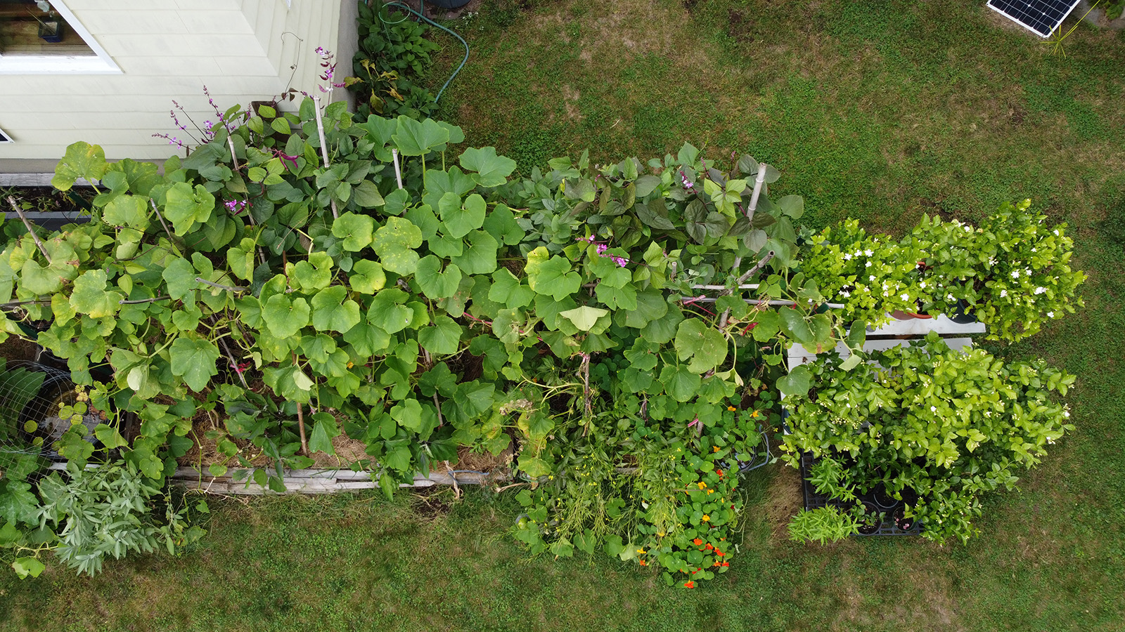 i was finished by 3:30pm so decided to do some drone flying to get some photos of the garden from above. using my mother's old samsung S9+ i didn't experience any problems. the compass might need to be recalibrated though, it had my location set incorrectly, but that's an easy fix to make. the only problem i had was when i tried to land: hailey kept wanting to chase after the drone. i tried to grab ahold of her with one hand while trying to land with the other. i ended up trapping her between my legs as i quickly landed the drone. it was already giving me the low battery beeping warning.