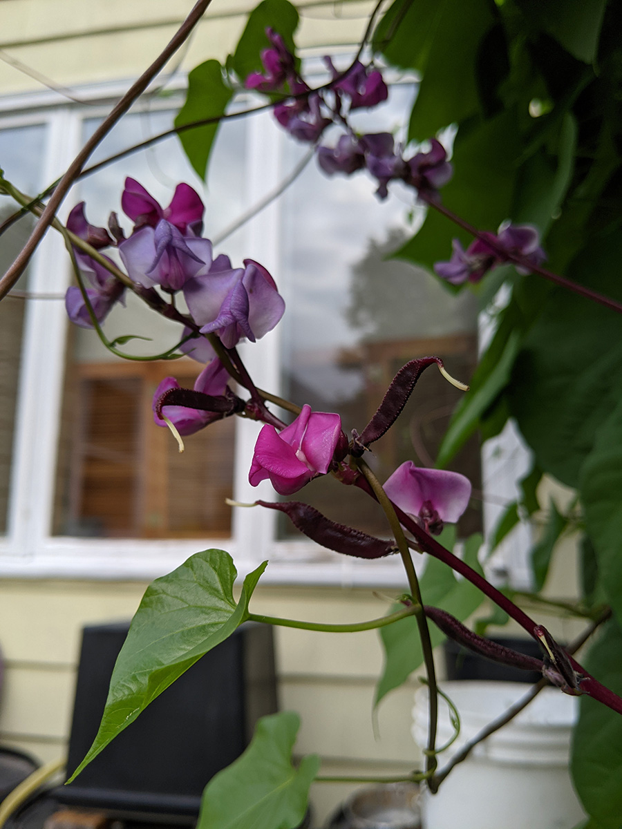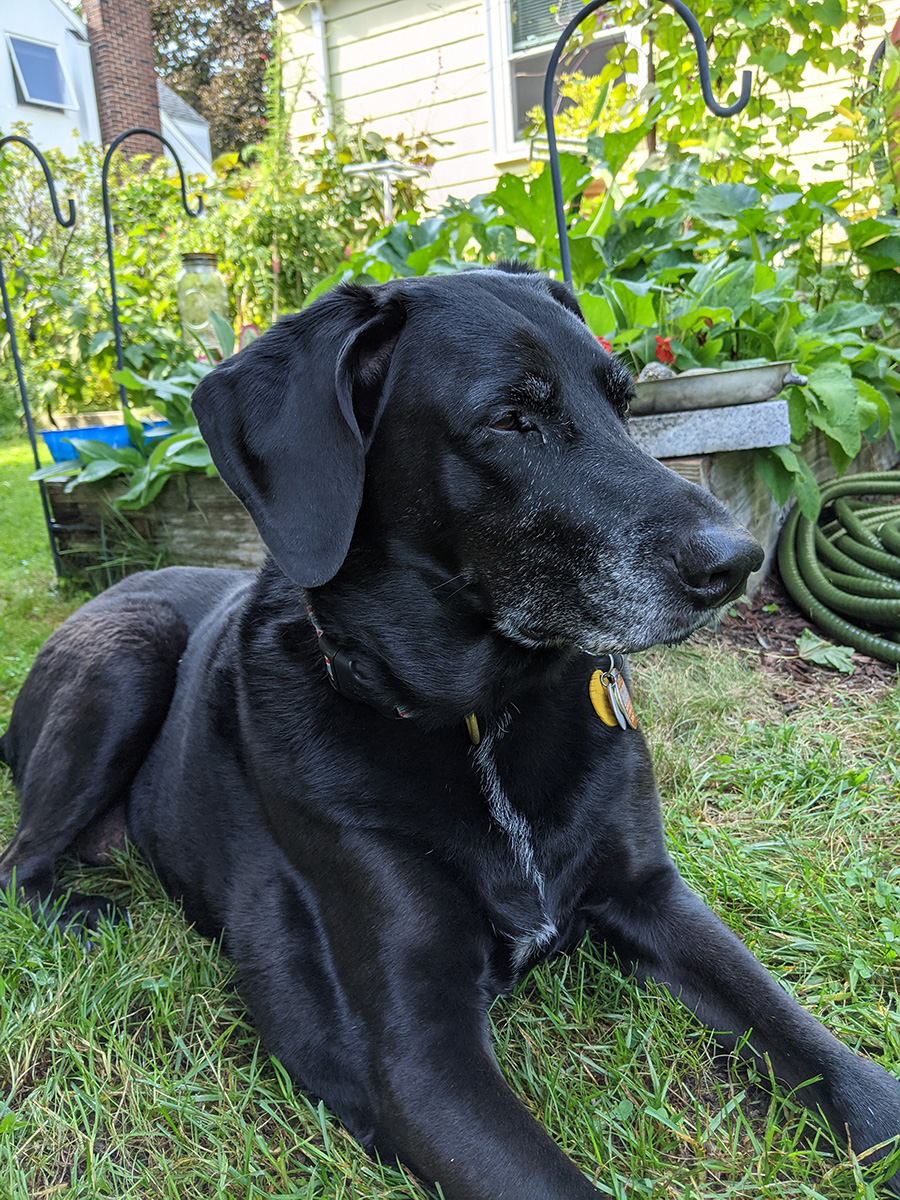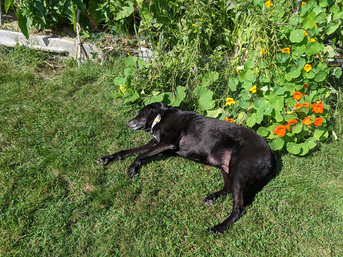 during that time hailey would wander around the backyard, occasionally lying in the sun, or in the shade, and every once in a while go inside, only to come out again a few minutes later. also one of the backyard neighbors is having their house planted, so i kept hearing the clanging of ladders all day.