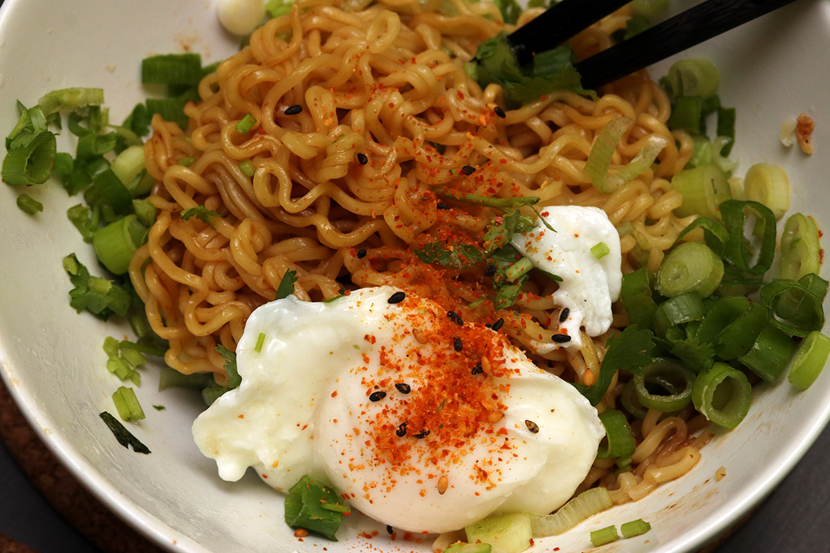 later in the evening - after 10pm - i got hungry so i made myself an indomie mi goreng. i poached an egg and boiled the noodles for 3 minutes. i also chopped some cilantro and scallions. it took me all but 30 seconds to eat the whole thing, it's not really a meal, more like a snack.