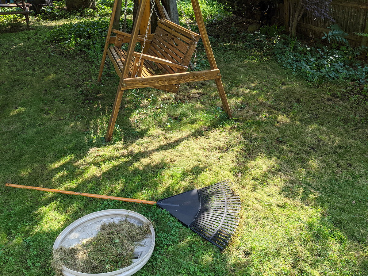 next came the dethatching. i heard they have machines that can do this, but i do it the old-fashion way, manually with a rake. even though i wore gloves, my vigorous raking made a blister on my left thumb. thatch is a good source of "brown" material so i collected all the dead grass and added it to the compost.