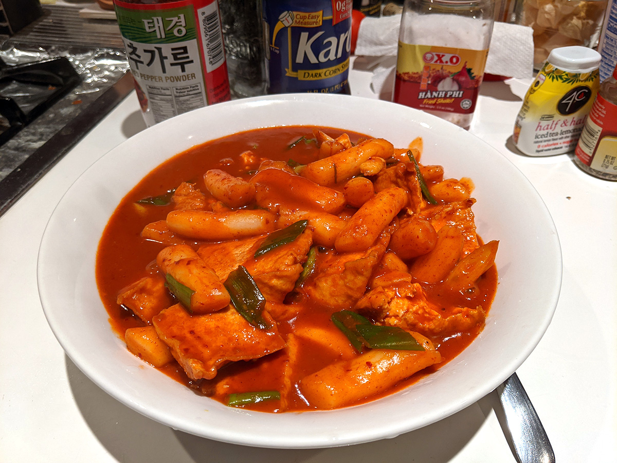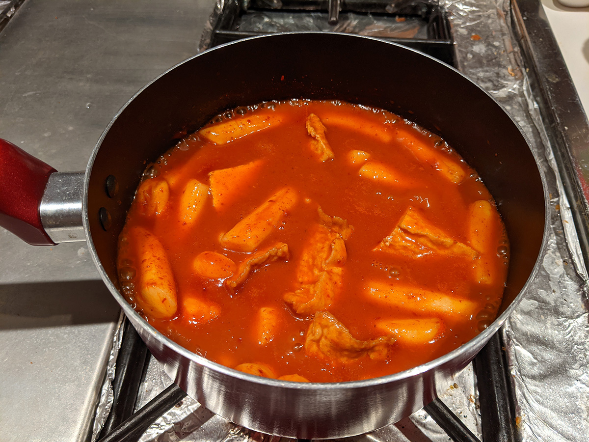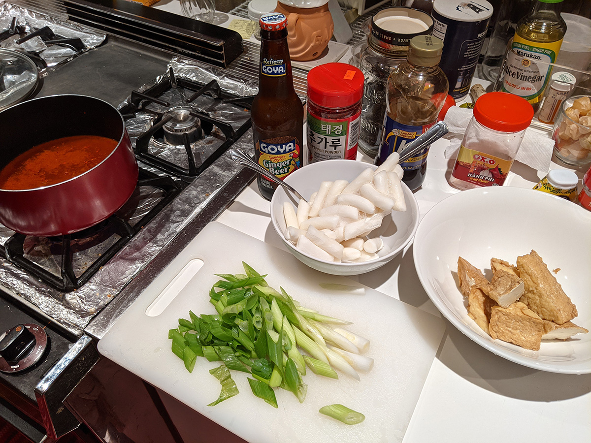 for dinner i made some korean rice cakes, as it was a chilly day, worthy of a hearty and spicy meal. i really just needed to use up some old tofu i had in the fridge, which most likely has gone bad because it tasted a bit sour. i figured maybe i'd have tteokbokki again tomorrow, but i'm all rice caked out. i'm just going to cook some simply ramen tomorrow and throw in the leftover tofu wedges as extra proteins.