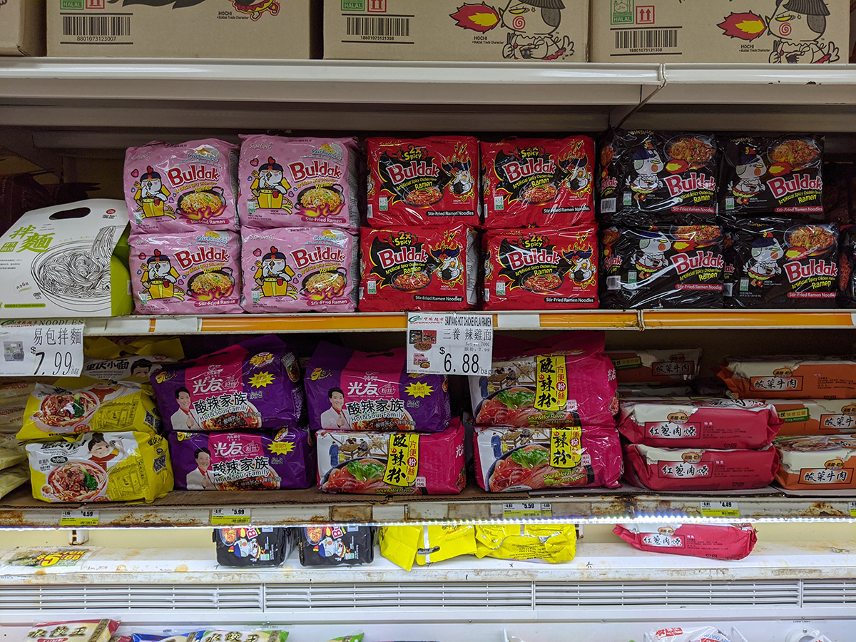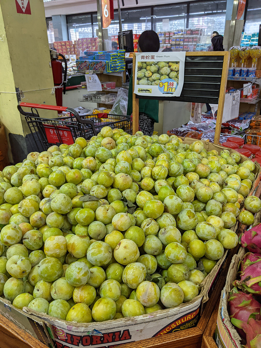 next i went to c-mart down the street. they had more selection, i got some green plums ($1.98) which had a more evocative chinese name - é’蛇蛋 "green snake eggs." they reminded me of the cherry plums, or possibly pluots. i looked for kikkoman tonkatsu sauce, they're still out. they did have 3 flavors of buldak in stock - carbonara, (regular) spicy, and 2x spicy - but more expensive than the market basket price ($5.99 to $6.88). i find it a little ironic when non-asian supermarkets can sell asian products at a cheaper price.
