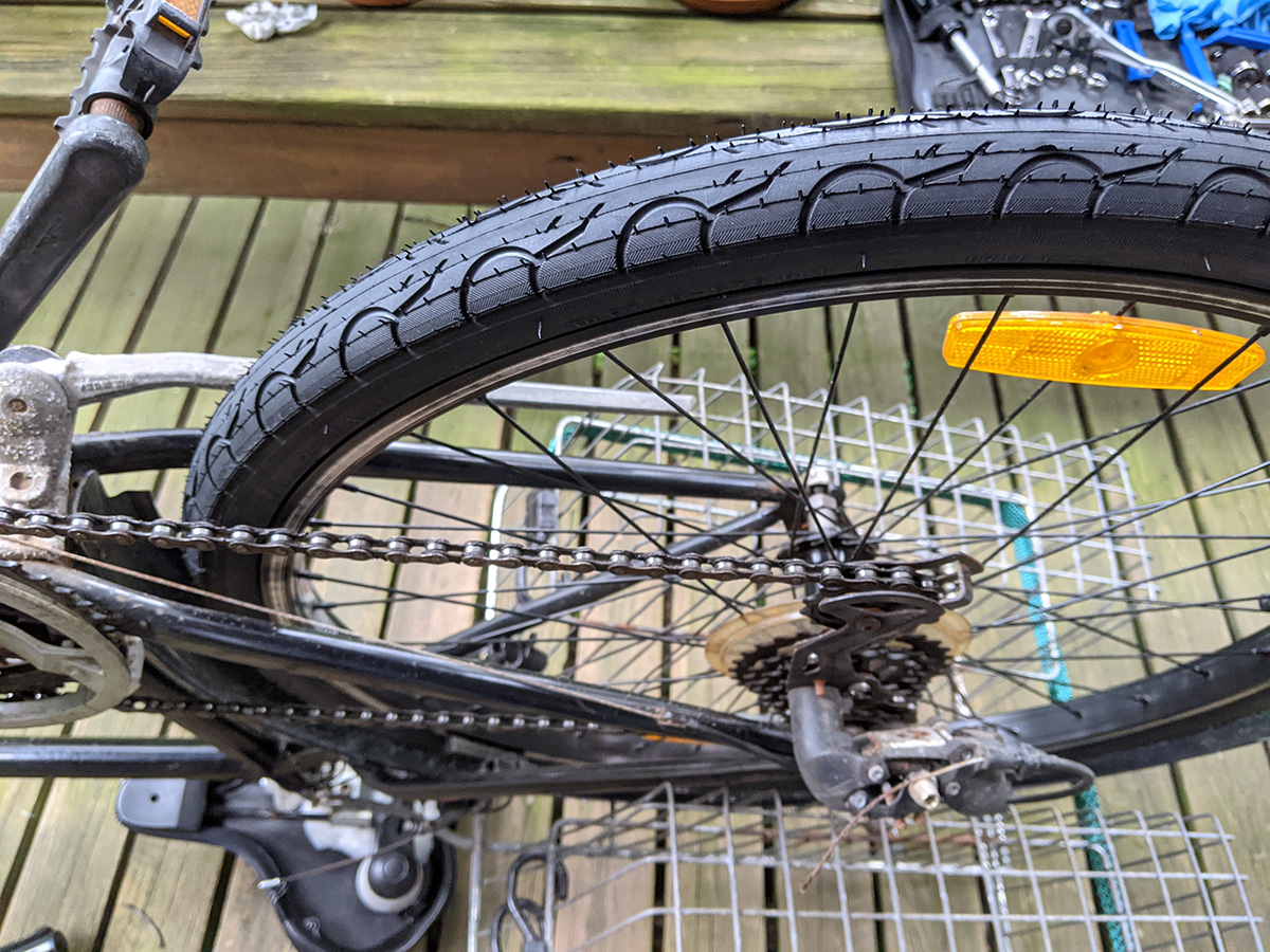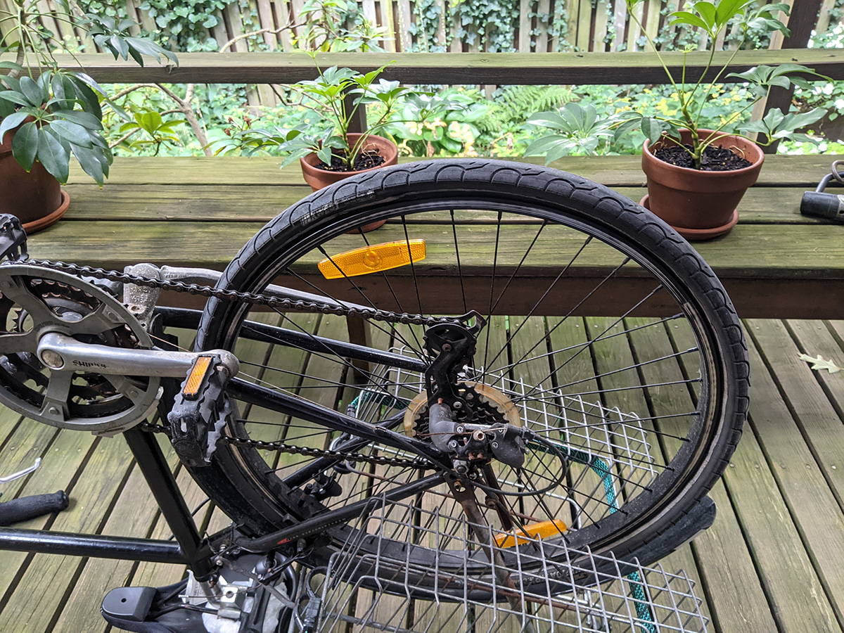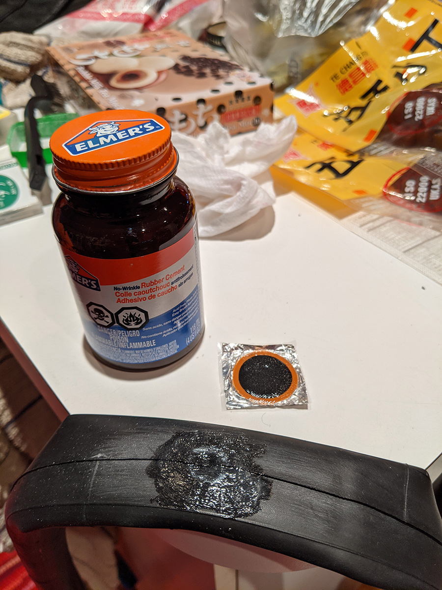 it ended up taking me 38 minutes to walk back home, 3x longer than if i was on the bike. after putting stuff away in the fridge, i gathered up my tools and proceded to fix the flat tire. pushing the flat tire for nearly 2 miles had basically damaged the tire, like shredded sidewalls, but i wasn't going to reuse that tire anyway, so it wasn't a big deal. my biggest concern was if it rim got damaged, but i checked, it was fine. i took off the tire and inner tube and brought the tube into the bathtub to check where it was leaking. this was a brand new tube that i just replaced back in july when i burst the previous tube. even though i had additional spare tubes, i was glad to see the tube itself was in good condition, just a tiny puncture hole on the opposite side of the inflation valve. it was a simply matter of roughing up the area with a steel brush, applying some rubber cement, than sticking on a rubber patch. i put the patched tube into the new tire and attached it to the rear wheel rim. it was just a good fit, i didn't even need tire levers. and with that i'm as good as new. the only other thing i need to install is the new chainwheel, which i bought back in march but still haven't replaced it yet.