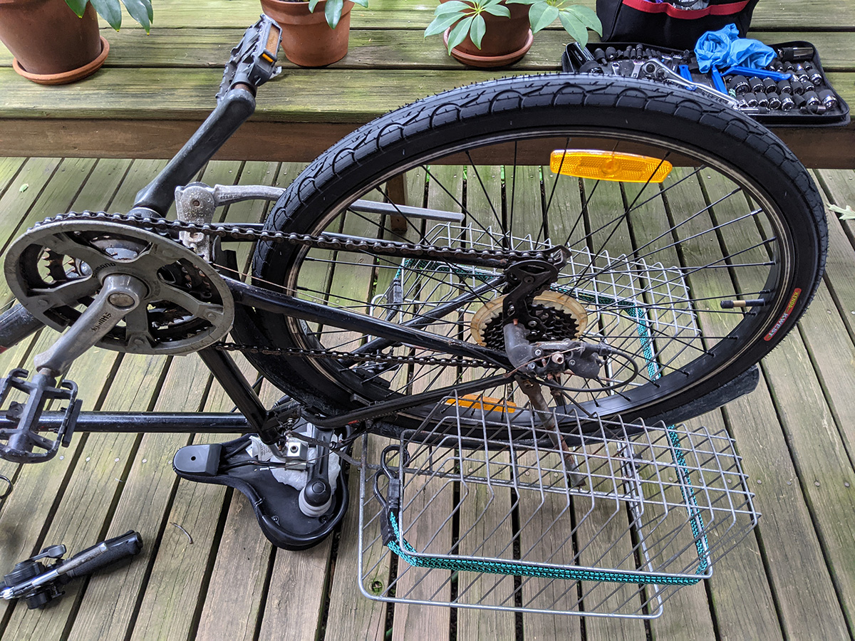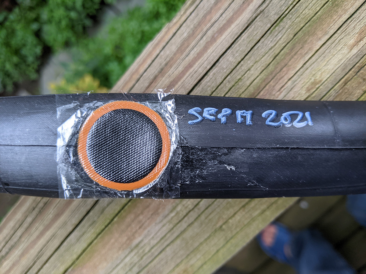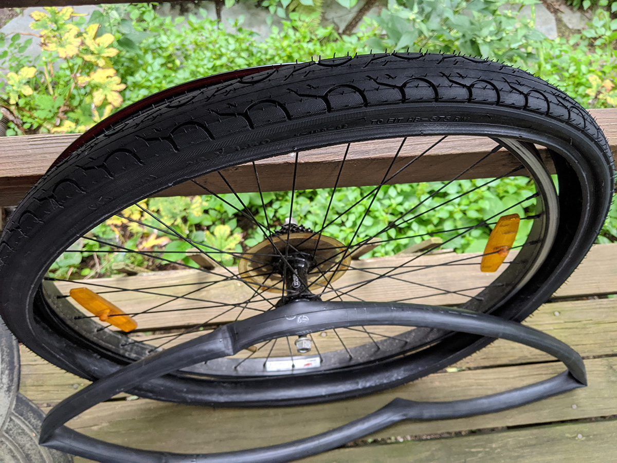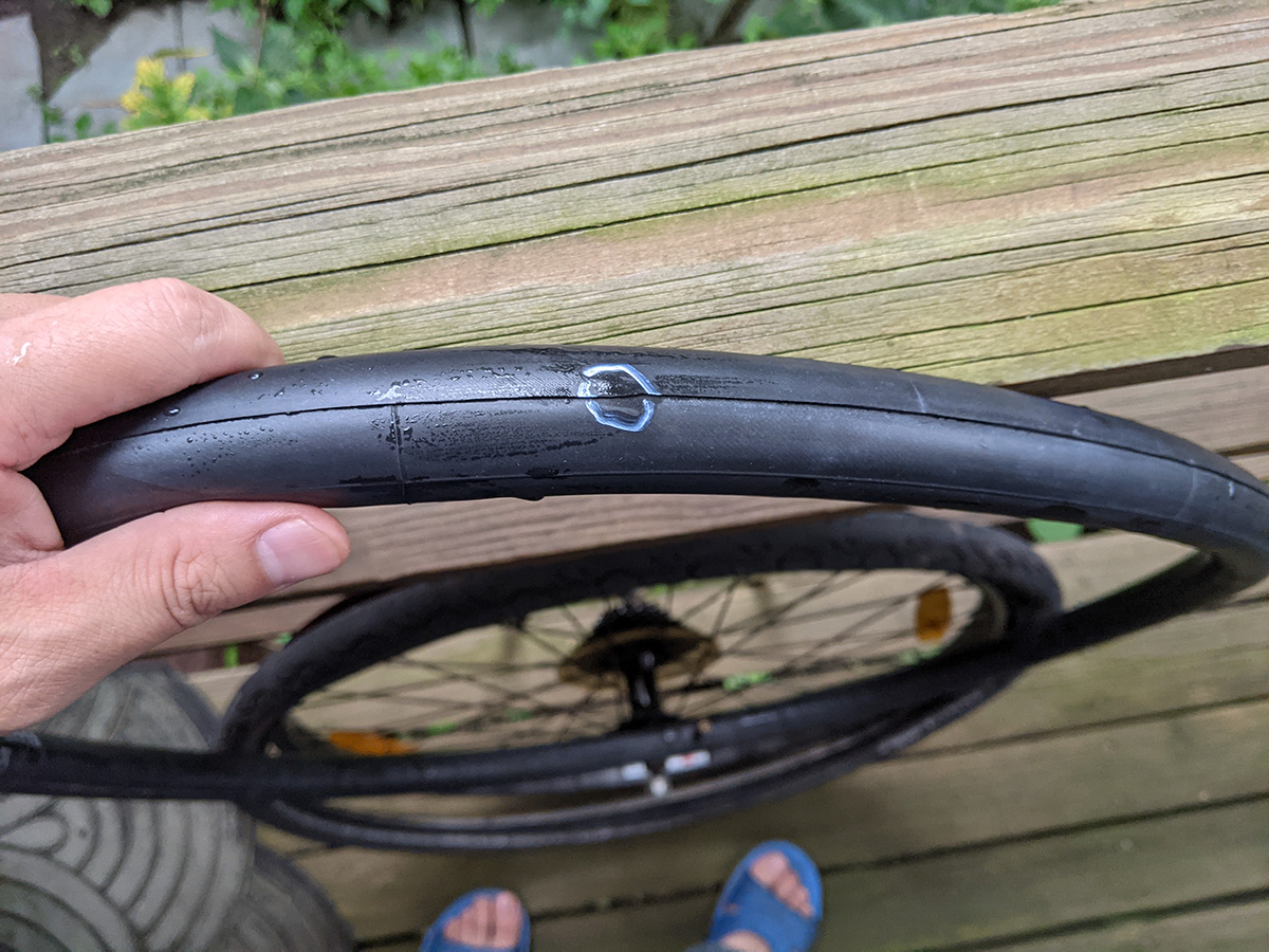 it ended up taking me 38 minutes to walk back home, 3x longer than if i was on the bike. after putting stuff away in the fridge, i gathered up my tools and proceded to fix the flat tire. pushing the flat tire for nearly 2 miles had basically damaged the tire, like shredded sidewalls, but i wasn't going to reuse that tire anyway, so it wasn't a big deal. my biggest concern was if it rim got damaged, but i checked, it was fine. i took off the tire and inner tube and brought the tube into the bathtub to check where it was leaking. this was a brand new tube that i just replaced back in july when i burst the previous tube. even though i had additional spare tubes, i was glad to see the tube itself was in good condition, just a tiny puncture hole on the opposite side of the inflation valve. it was a simply matter of roughing up the area with a steel brush, applying some rubber cement, than sticking on a rubber patch. i put the patched tube into the new tire and attached it to the rear wheel rim. it was just a good fit, i didn't even need tire levers. and with that i'm as good as new. the only other thing i need to install is the new chainwheel, which i bought back in march but still haven't replaced it yet.