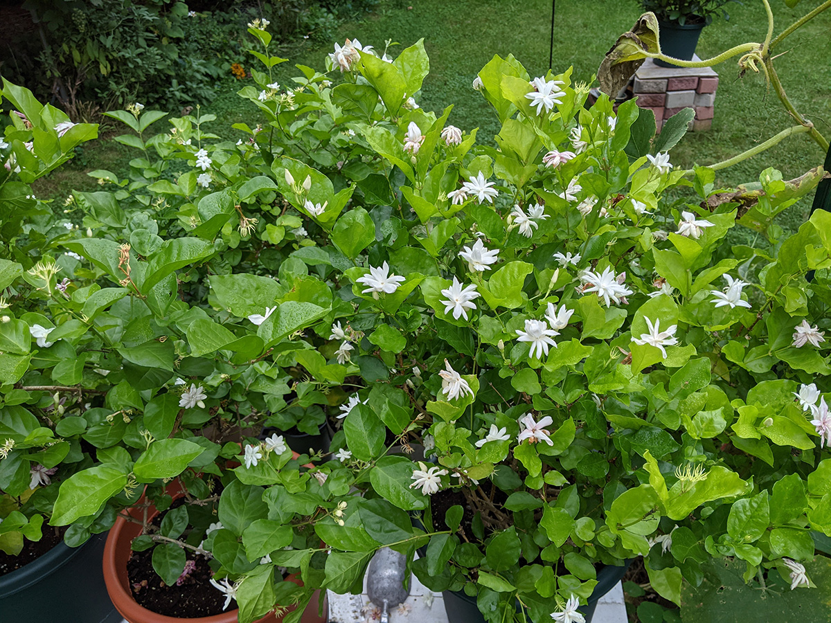 i arrived in belmont around noontime. my mother was out, taking hailey out for a while, while my sister and 2nd aunt were working at the cafe. the thing i noticed first about the backyard was the abundance of jasmine flowers. flowers bloom every night, but sometimes there's an explosion of flowers, especially on an overcast day like today, when the flowers keep on for a bit longer.